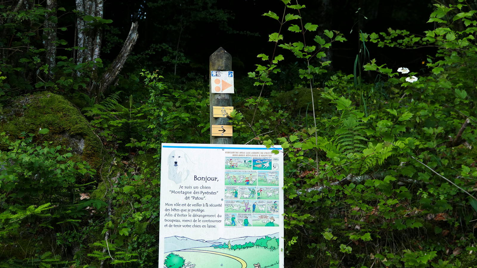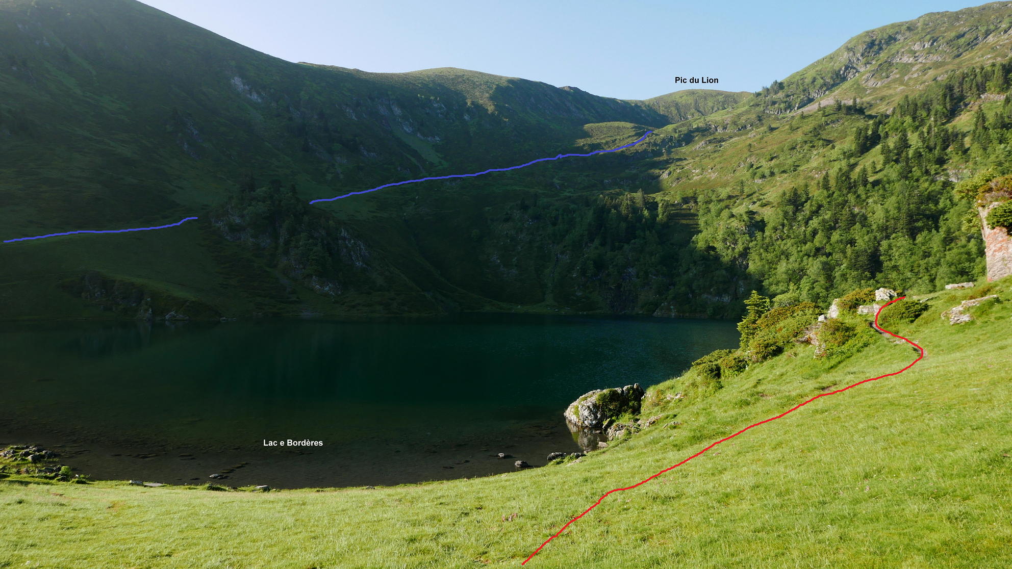 Vuelvo a dejar la pista (1425m 0h45′) cuando ésta gira a la derecha y avanzo por prados hasta la bergerie Artigue-Longue (1520m 1h00′) atravesando la pista en el lugar donde ahora hay aparcados 2 coches, pero a la bajada habrá más. Continúo por pasto y está el cartel de «Reserva Natural Regional Massif de Montious». Entonces la senda se interna por pinar y aumenta la pendiente para llegar al Lac de Bordères o de Bareilles (1765m 1h22′).