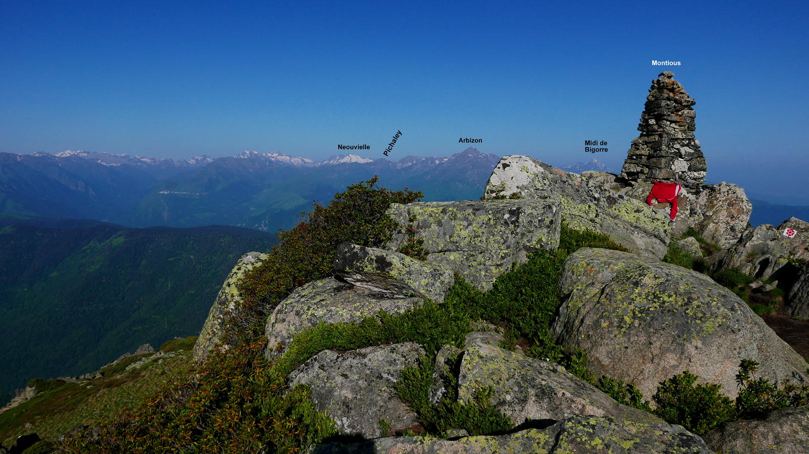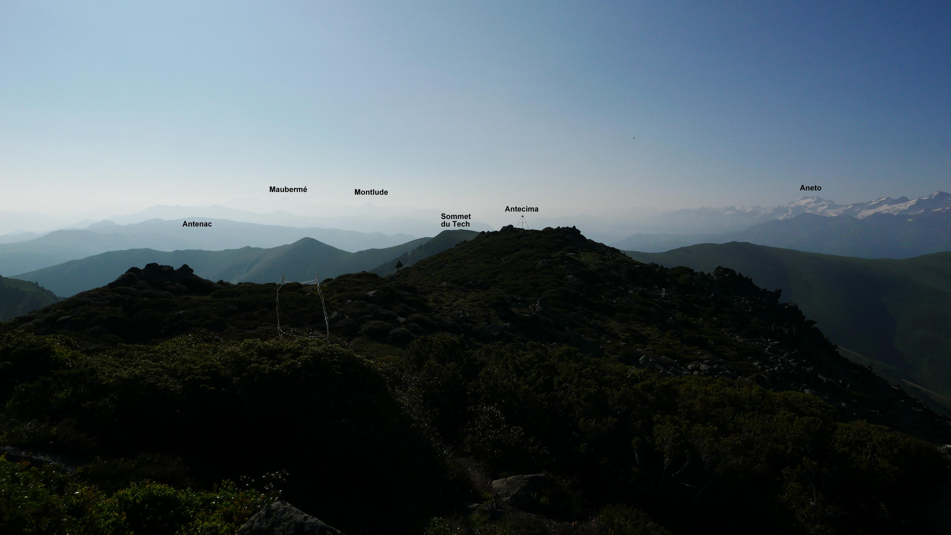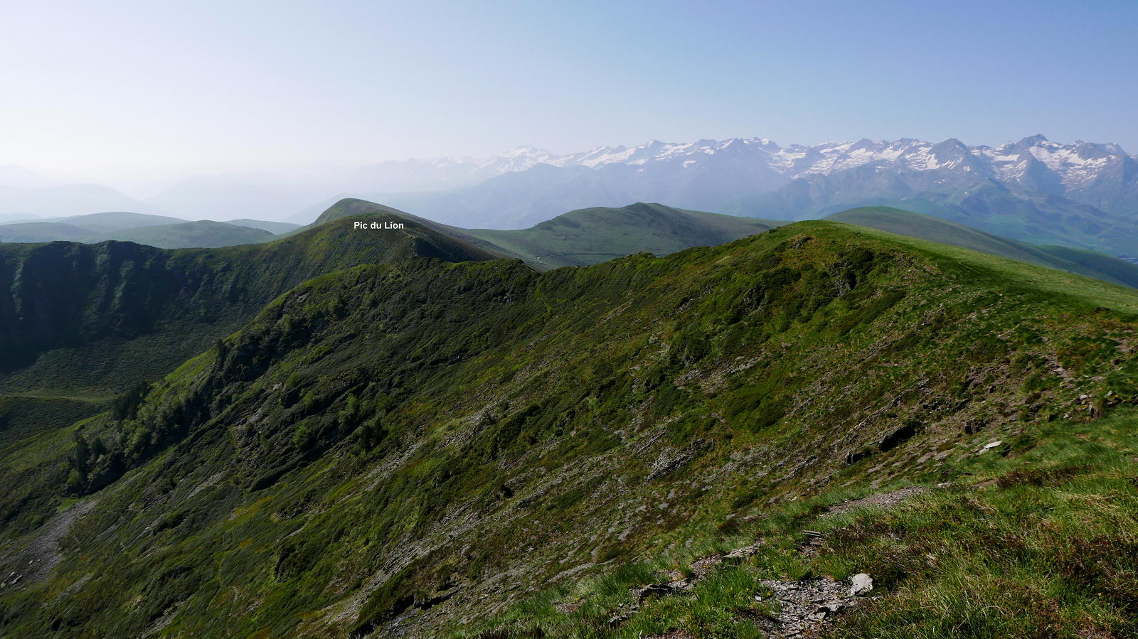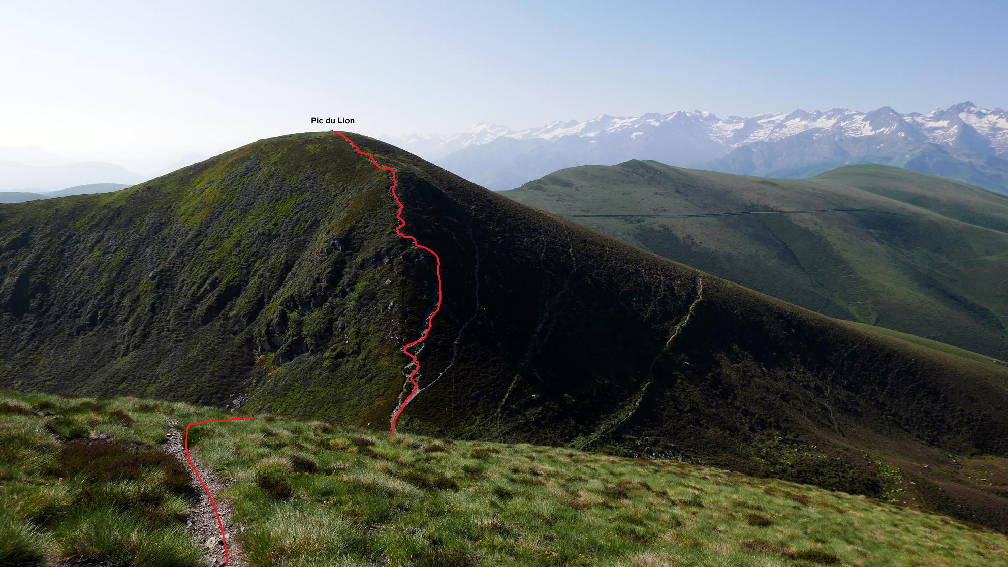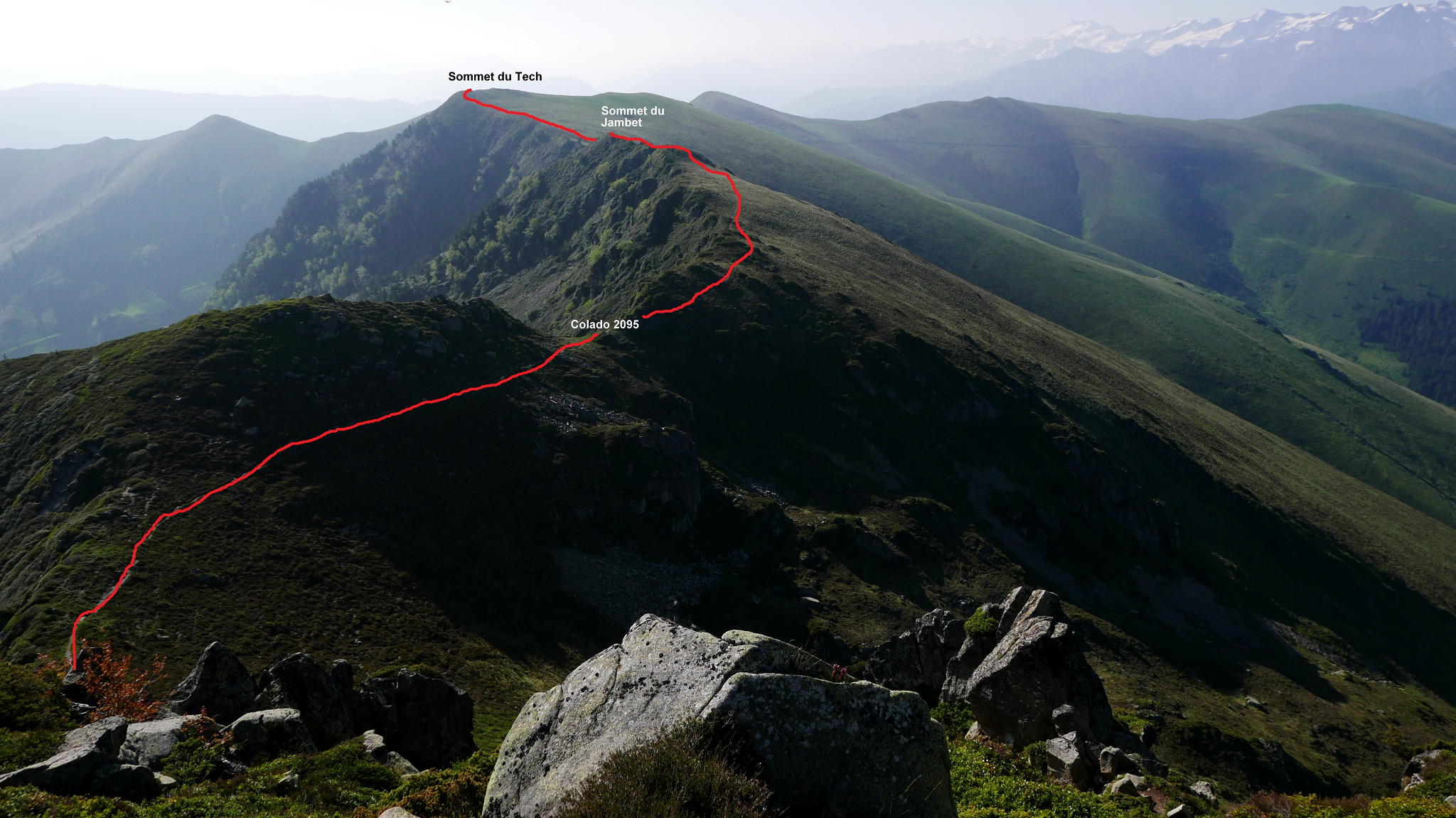 Regreso al collado SE (2095m 2h52′) y continúo por la cresta o un poco por la vertiente sur (derecha) subiendo el Sommet de Jambet (2121m 3h00′) y el Sommet du Tech (2138m 3h10′) dos cotas secundarias que no tienen ninguna dificultad. Ahora un descenso más pronunciado al col du Lion (2031m 3h20′) y una última subida más potente, pero siempre por traza de senda, al Pic du Lion (2102m 3h27′), que marca el vértice entre la cresta del Montious y la cresta del Mont Né.