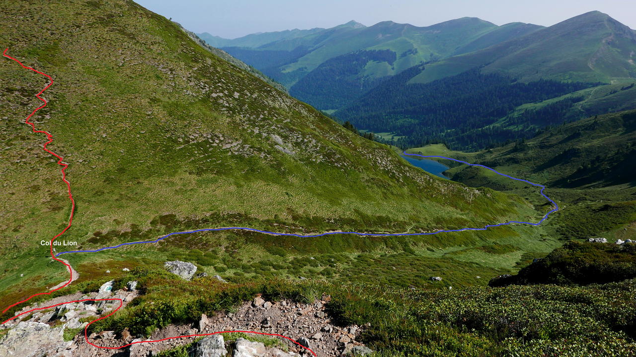 Bajo al col du Lion (2031m 3h42′) e inicio el descenso directo hacia el lago rodeándolo ahora por su orilla este para seguir por la misma ruta de ascenso de vuelta al aparcamiento (1110m 5h00′)