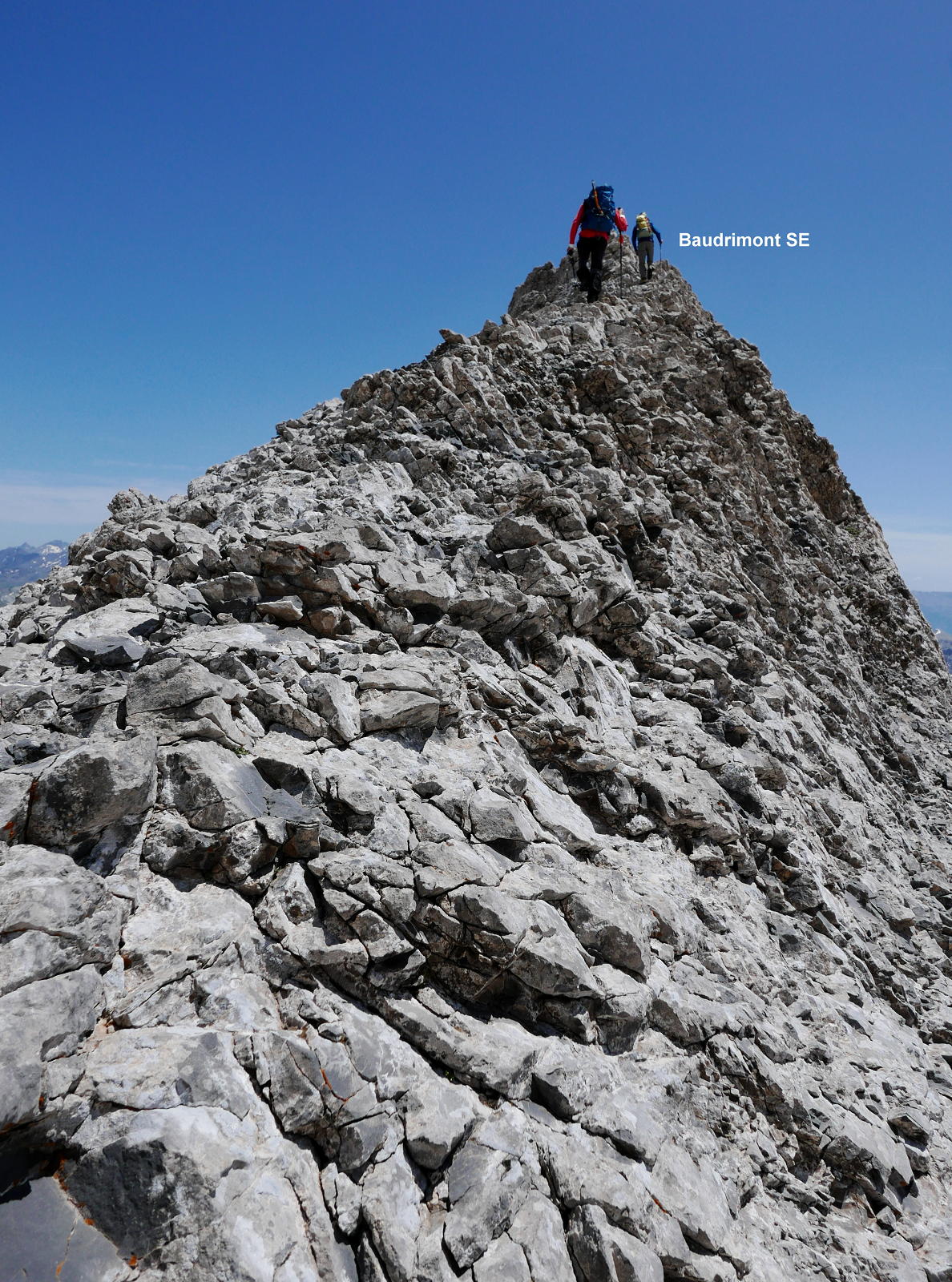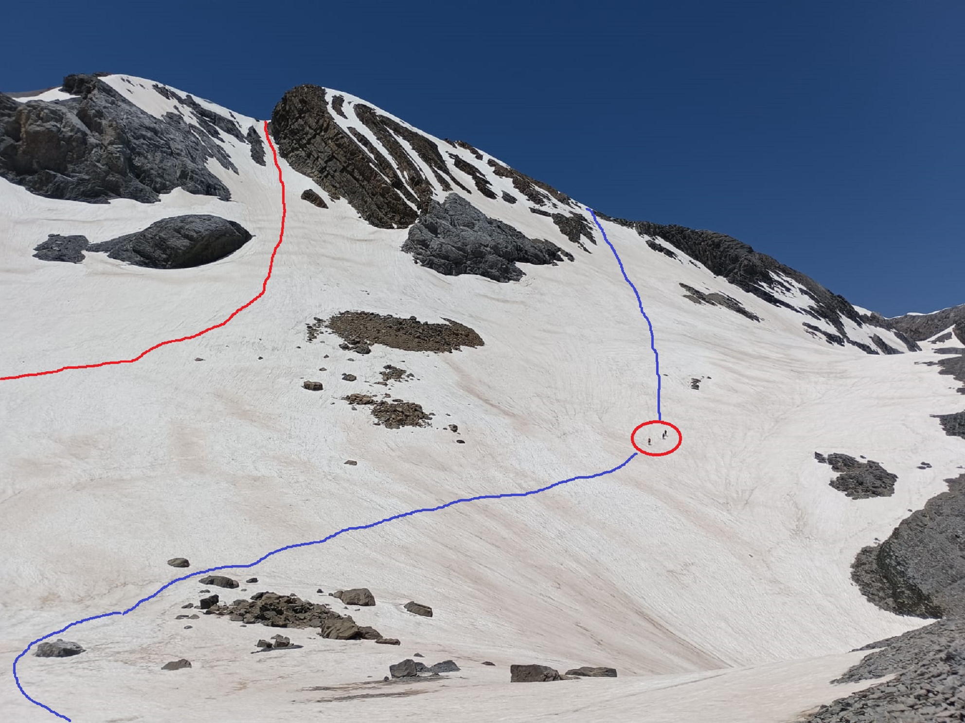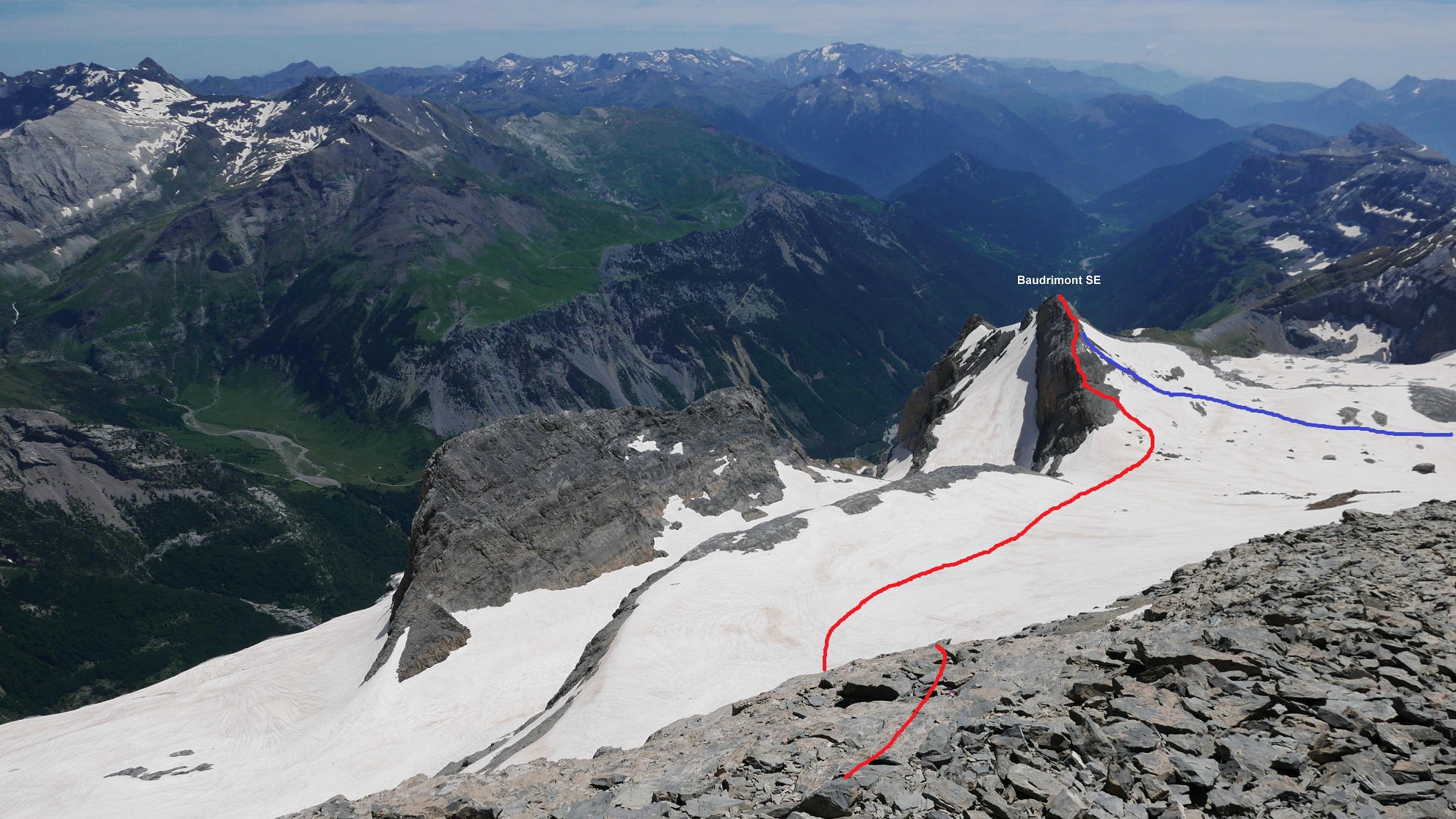 Una vez en el plateau de nieve nos dirigimos a la punta rocosa que sobresale, el Baudrimont SE o Punta Tormosa. Accedemos a su cresta oeste y la seguimos con precaución, sin que sea difícil, pasando una brecha y accediendo a la cima (Punta Tormosa 3023m 6h10′). La bajada la hacemos directamente hacia el sur para confluir con la ruta que nos vuelve a llevar a la Punta de las Olas (3022m 6h45′) y ya ir tomando el camino de vuelta.