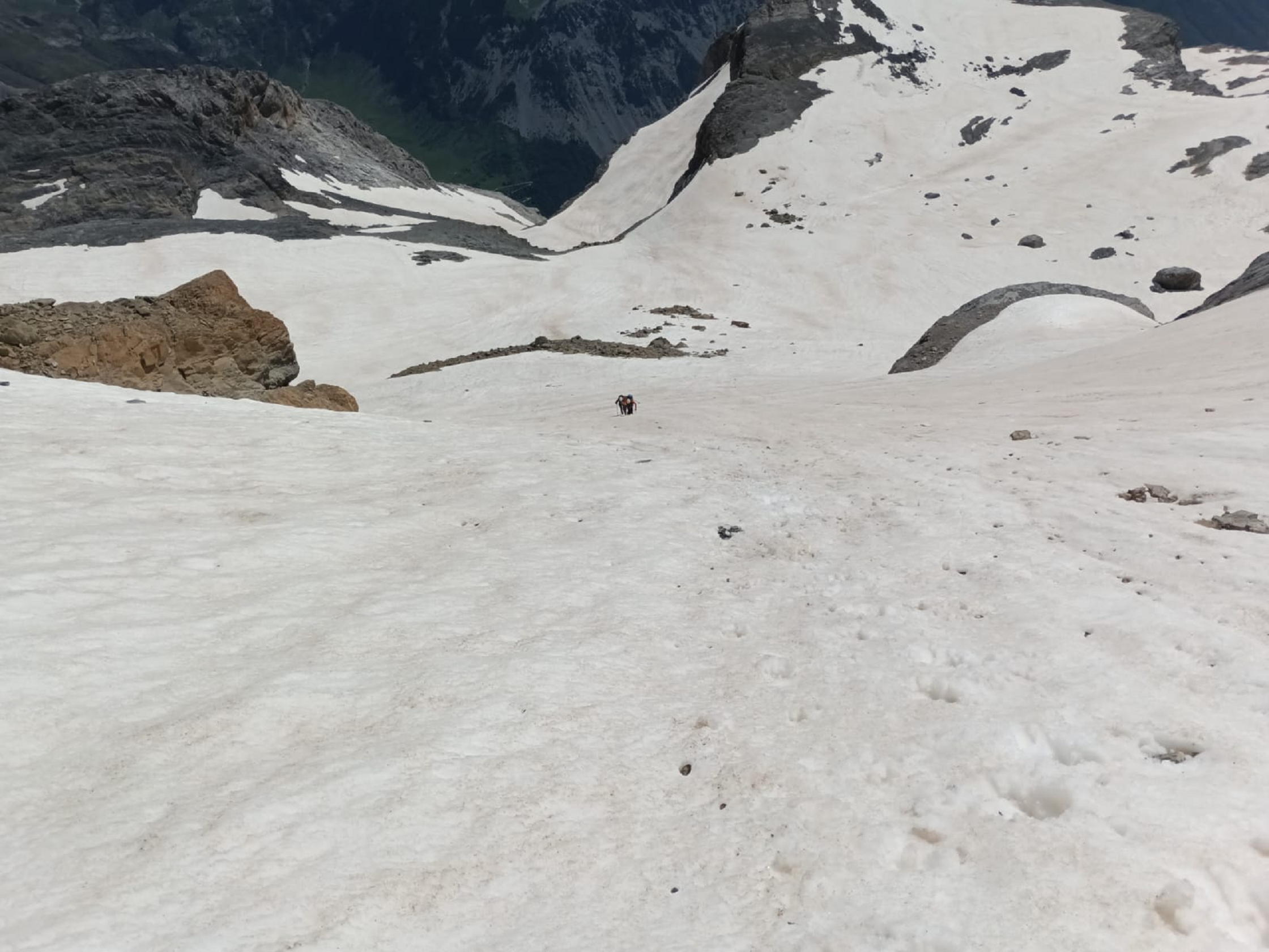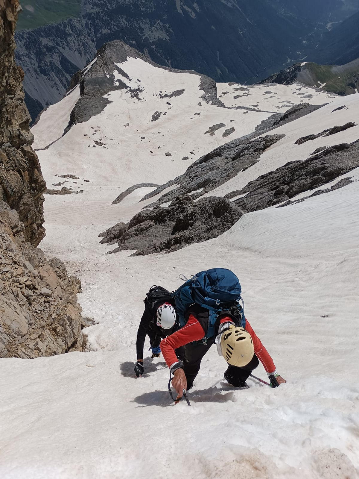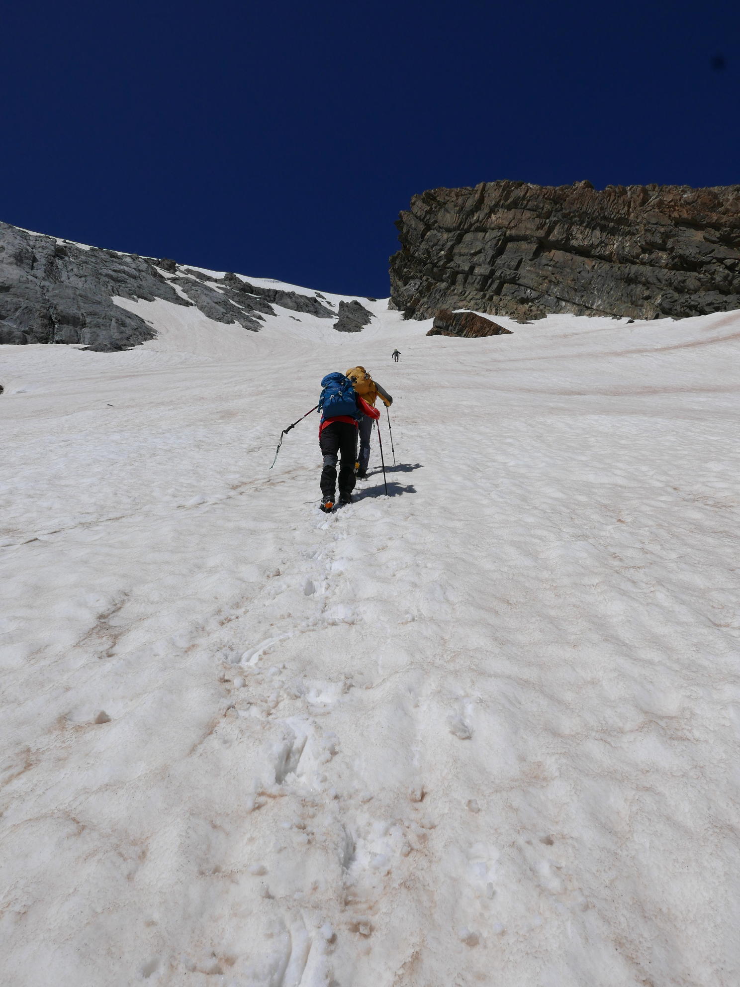 Una vez en el plateau de nieve nos dirigimos a la punta rocosa que sobresale, el Baudrimont SE o Punta Tormosa. Accedemos a su cresta oeste y la seguimos con precaución, sin que sea difícil, pasando una brecha y accediendo a la cima (Punta Tormosa 3023m 6h10′). La bajada la hacemos directamente hacia el sur para confluir con la ruta que nos vuelve a llevar a la Punta de las Olas (3022m 6h45′) y ya ir tomando el camino de vuelta.