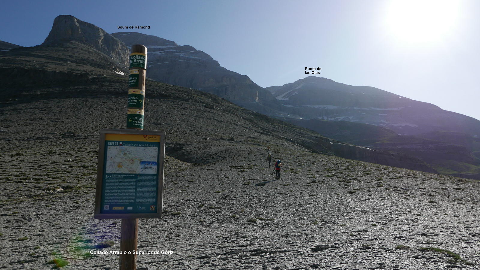 Descripción de la ruta: Aparcamiento de la furgo (2180m). Comenzamos a andar por el camino que sale hacia el NE (indicación «Mirador, Cuello Gordo, Refugio de Góriz»). El camino, bastante llano, recorre la parte alta del valle de Ordesa por su lado sur y SE con preciosas vistas aéreas del cañón y, frente a nosotros, el macizo de Monte Perdido. Hay una bifurcación (2205m) que tomamaos a la izquierda (a la izquierda quizás mejor para ir a Góriz, a la derecha un poco más corto para ir a Cuello Arrablo, pero casi da igual). Por el ramal de la izquierda otra bifurcación (2155m 1h10′) que tomamos a la derecha (ahora sí, a la izquierda nos iríamos al refugio de Góriz) para conectar, un poco más adelante, con el GR-11 (2280m 1h30′) girando a la derecha y alcanzando el Cuello Arrablo o Collado Superior de Góriz (2343m 1h38′), amplia explanada pedregosa bajo la característica silueta del Morrón de Arrablo o Torre de Góriz.