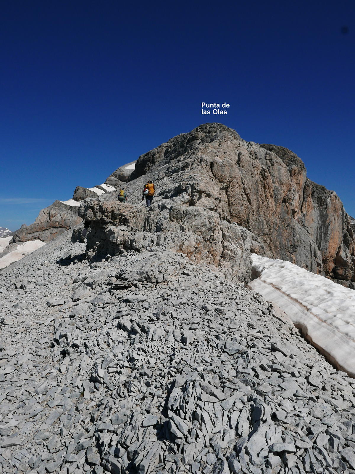 Aquí el GR-11 tiene dos variantes para ir al collado de Añisclo: una que baja a la Fuen Blanca y remonta el cañón de Añisclo, y otra, la que seguimos nosotros, que asciende para recorrer una faja bajo la Punta de las Olas por su cara sur. Por esta variante ascendemos para girar a la derecha (este) y recorrer dicha faja pedregosa hasta dejar el GR-11 (2700m 2h47′) y girar a la izquierda para tomar el lomo SE de la Punta de las Olas, pico al que se llega sin mayores dificultades (Punta de las Olas 3022m 3h28′). La vista del Soum de Ramond frente a nosotros ya tiene otra pinta.