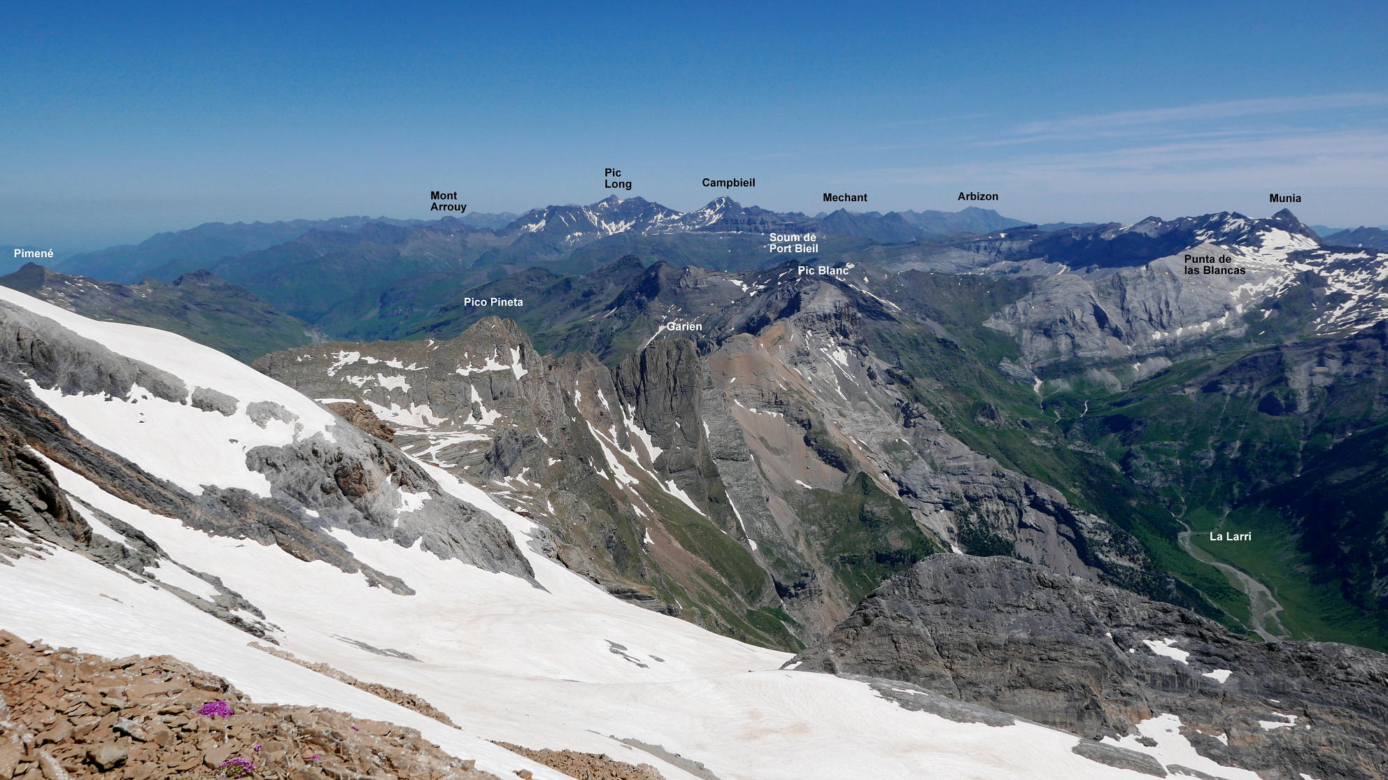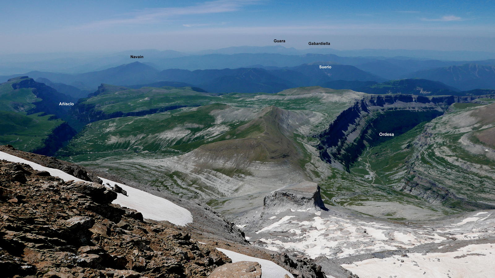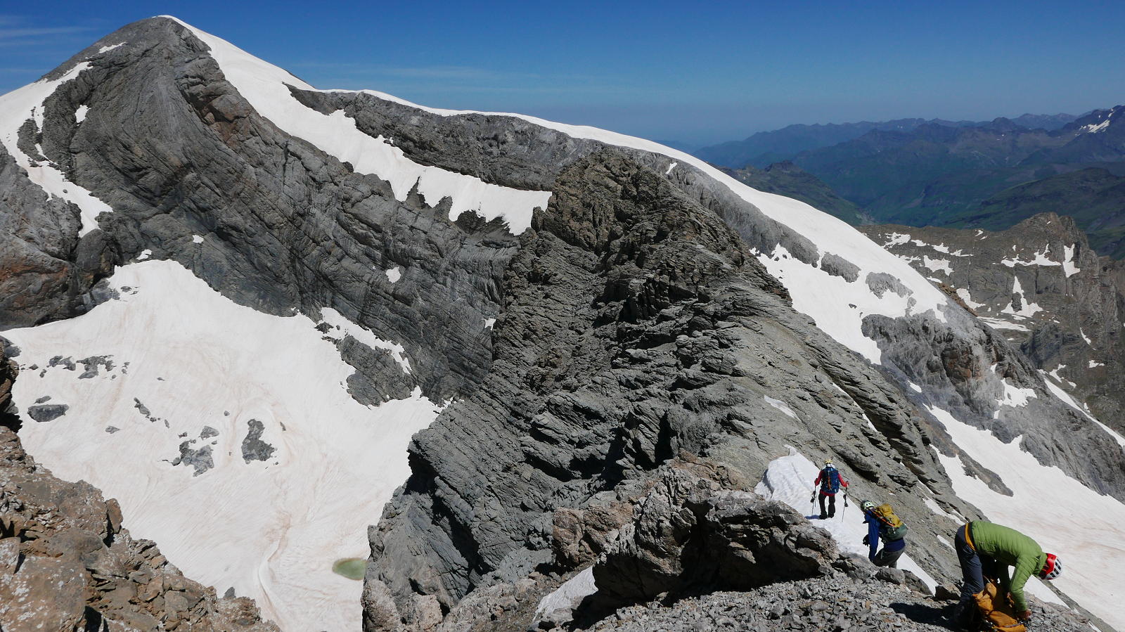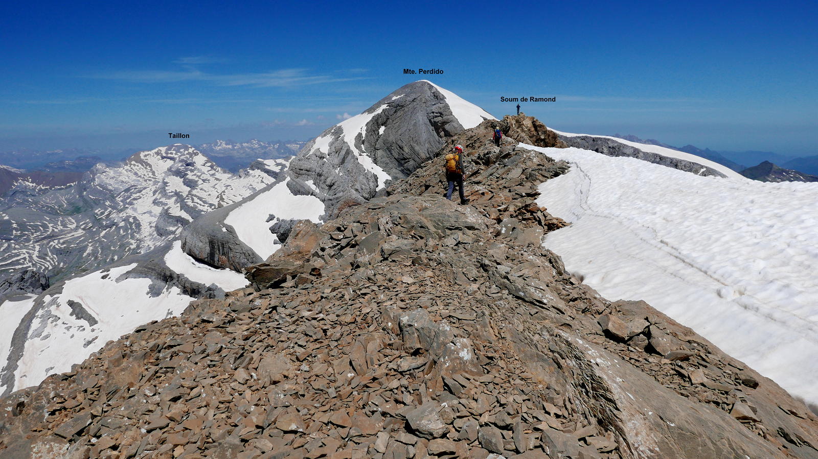 Larga y dura excursión a los picos que se sitúan al SE de Monte Perdido: la Punta de las Olas y el Soum de Ramond (que ahora se llama pico Añisclo), añadiendo de paso un tercer pico, el Baudrimont SE o Punta Tormosa. Completamos así 3 tresmiles, todos ellos con muy poca prominencia pero con un ambiente alpino y unas vistas incomparables.
