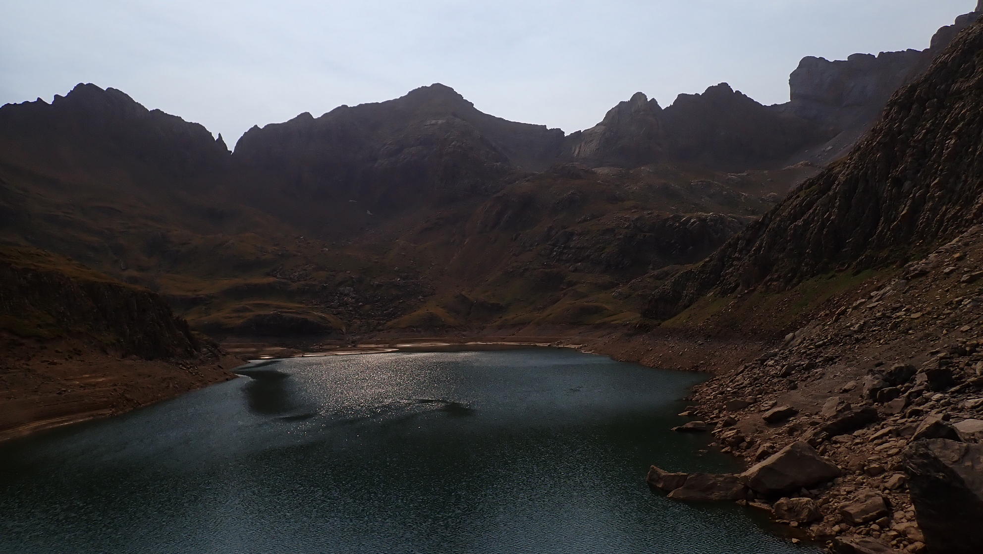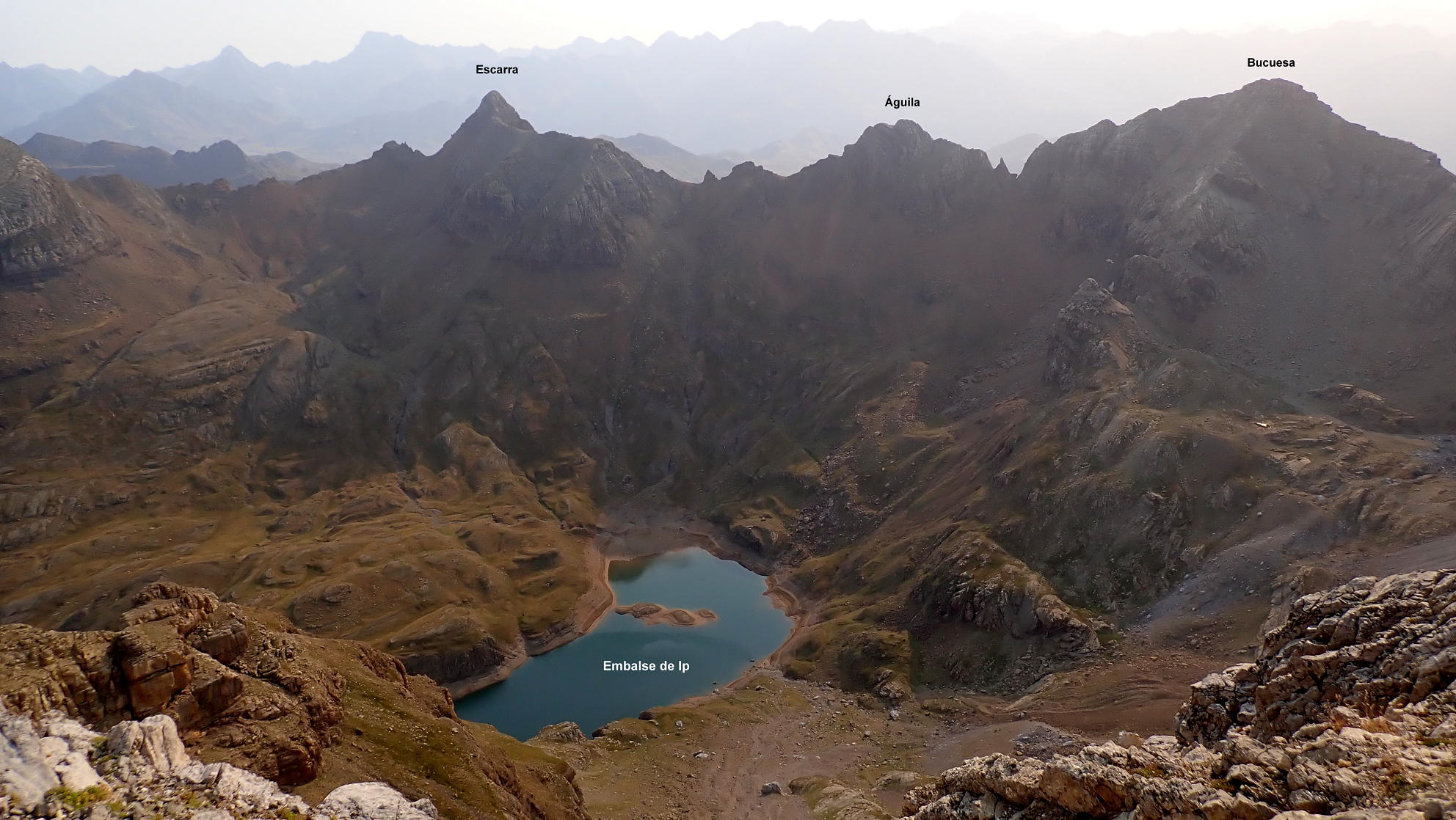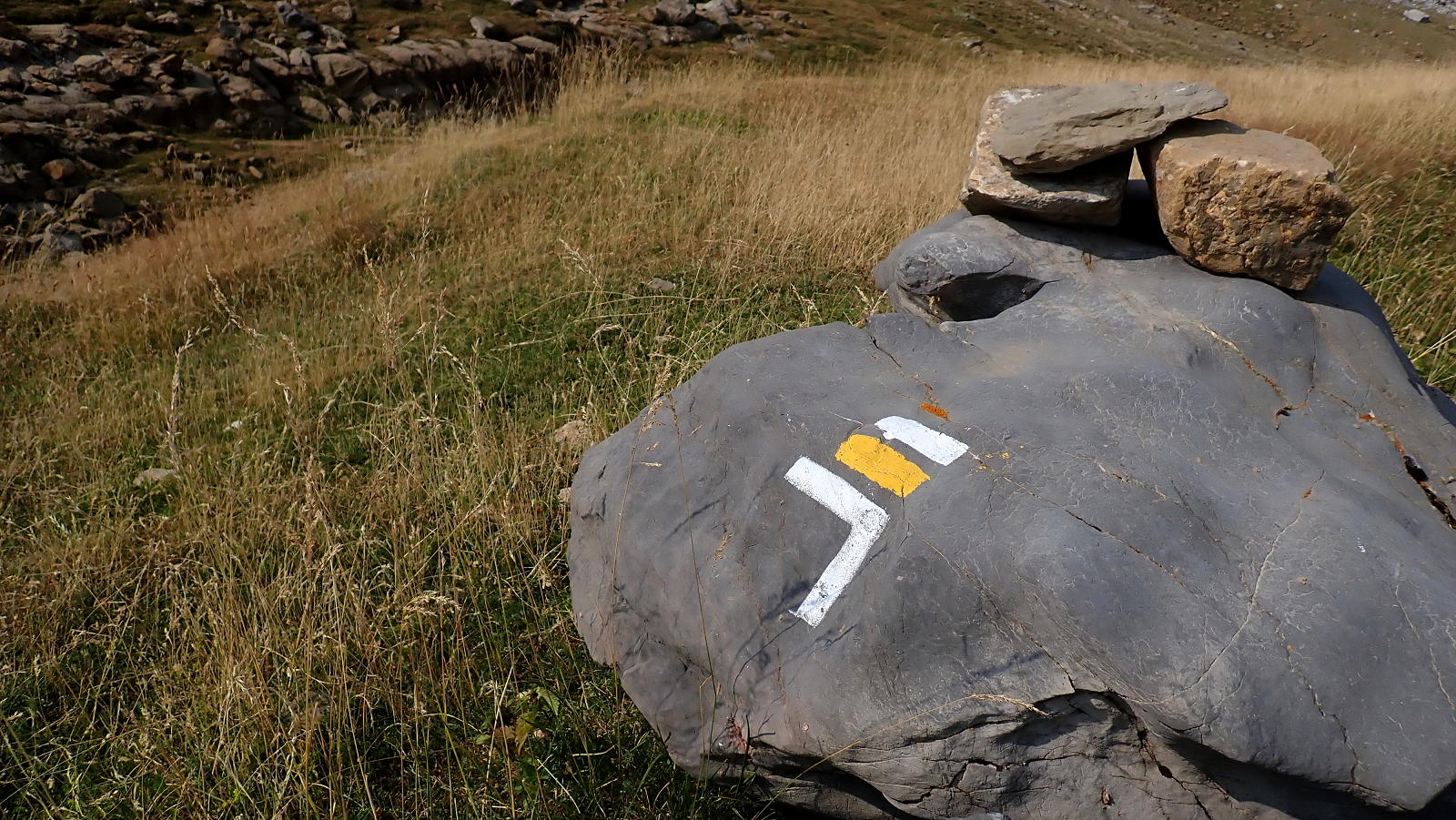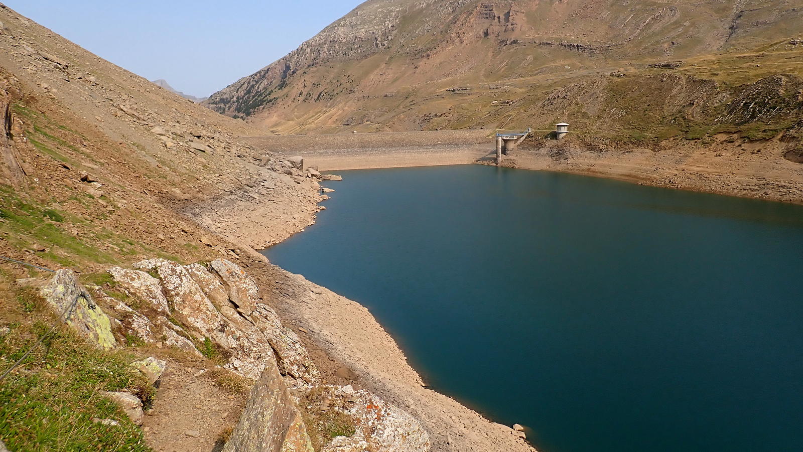 Bajada por una canal pedregosa con mucho cuidado, muy pendiente y una huella pelada y resbaladiza. Termina la pedrera (2370m 4h34′) y voy llegando a terreno con algo de hierba, encontrando hitos, algunos bastante artísticos. Luego ya muchos hitos que se siguen bien. Antes de llegar al embalse se gira a la izquierda. Un camino con pintura verde y amarilla va bordeando el embalse por el sur y en un paso hay una sirga (2145m 4h54′) que me parece innecesaria. Se atraviesa alguna pedrera y se llega a la presa de Ip 2115m 5h05′).