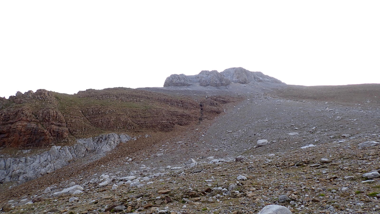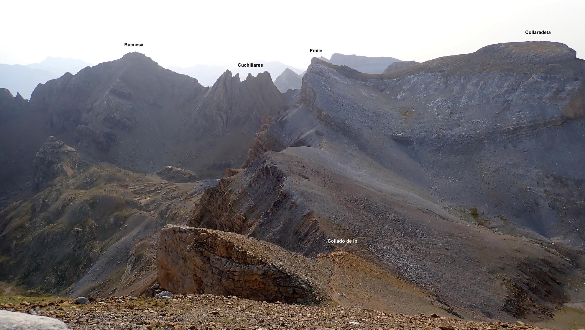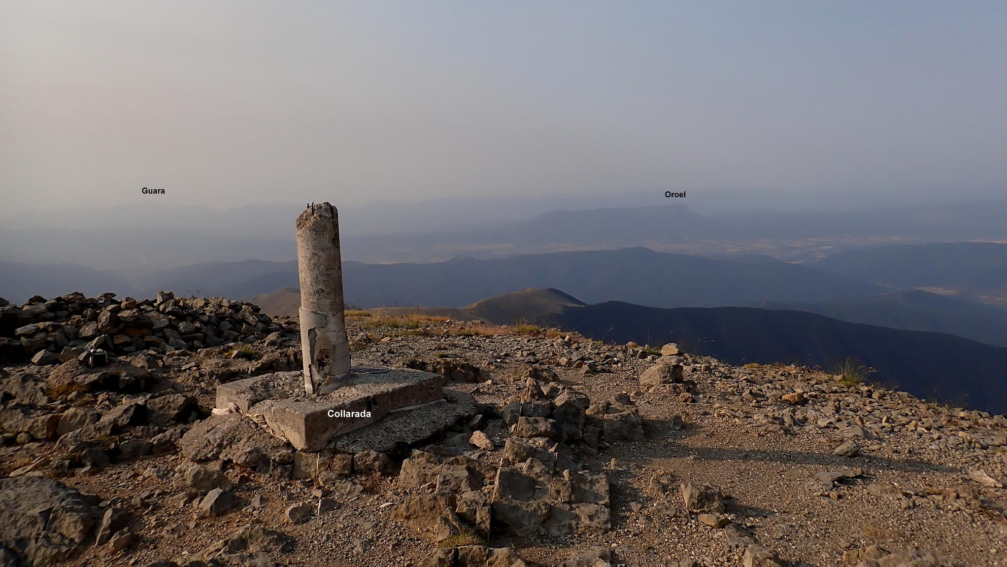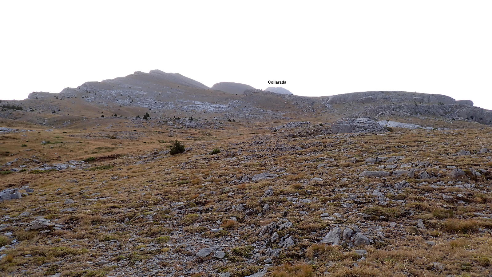 Esta zona es de pasto y piedras, cada vez más piedras y menos pasto; parece llana, pero según vas andando se nota la pendiente. Por aquí se acaba la señalización, solo hay algunos hitos muy alejados. hay que cruzar una barranquera, la Fuente de los Campaniles (2480m 2h41′). Comienza la pedrera (2640m 3h00′) y se une la senda de la Trapa (vía normal). La pedrera tiene bastante pendiente, pero buena huella. Al final hay que meterse en una canal de roca saliendo a la cresta unos metros a la derecha de la cima. Collarada (2883m 3h29′).
