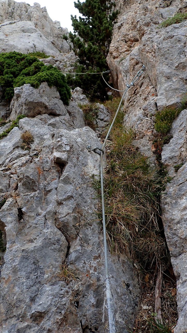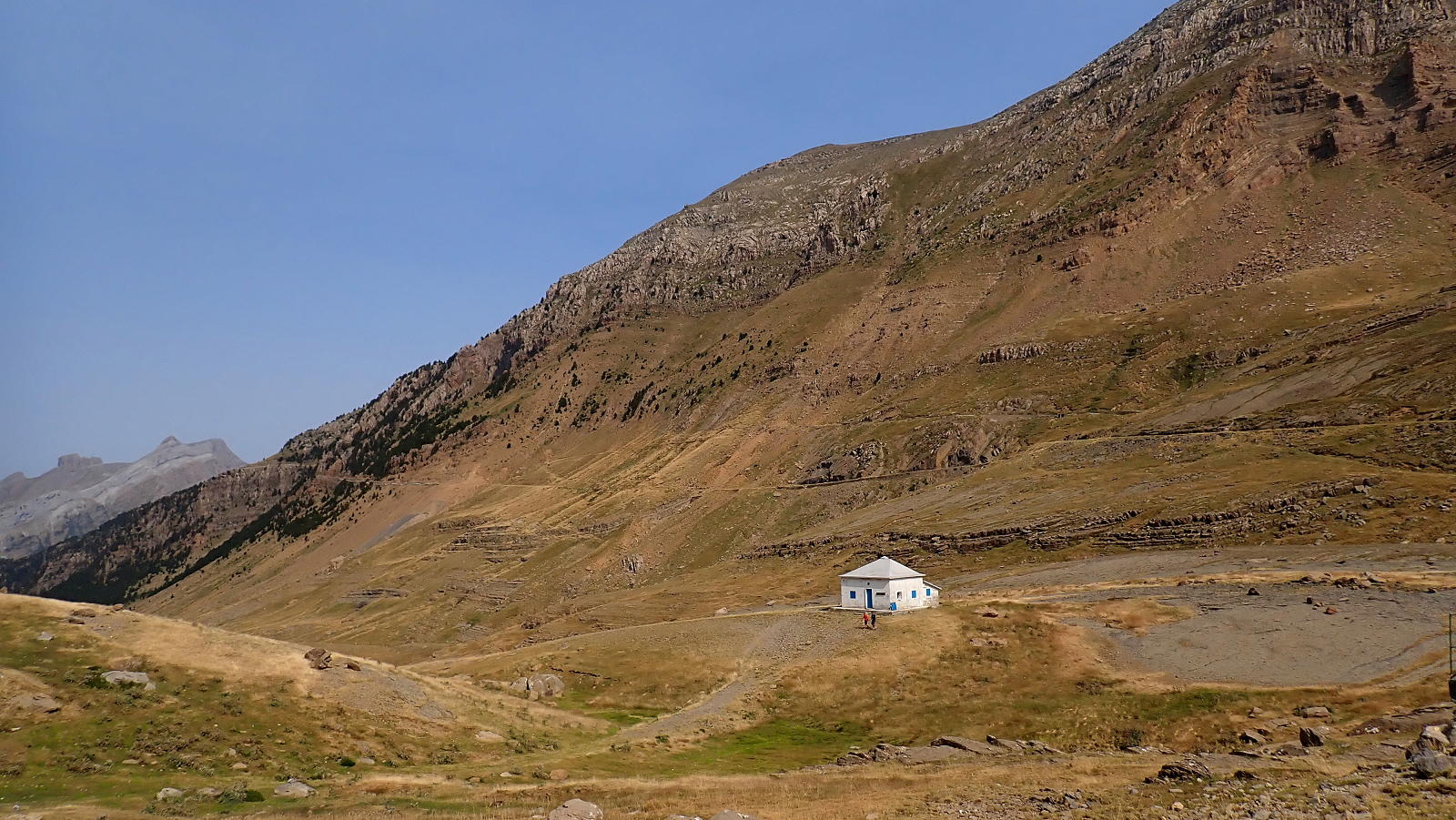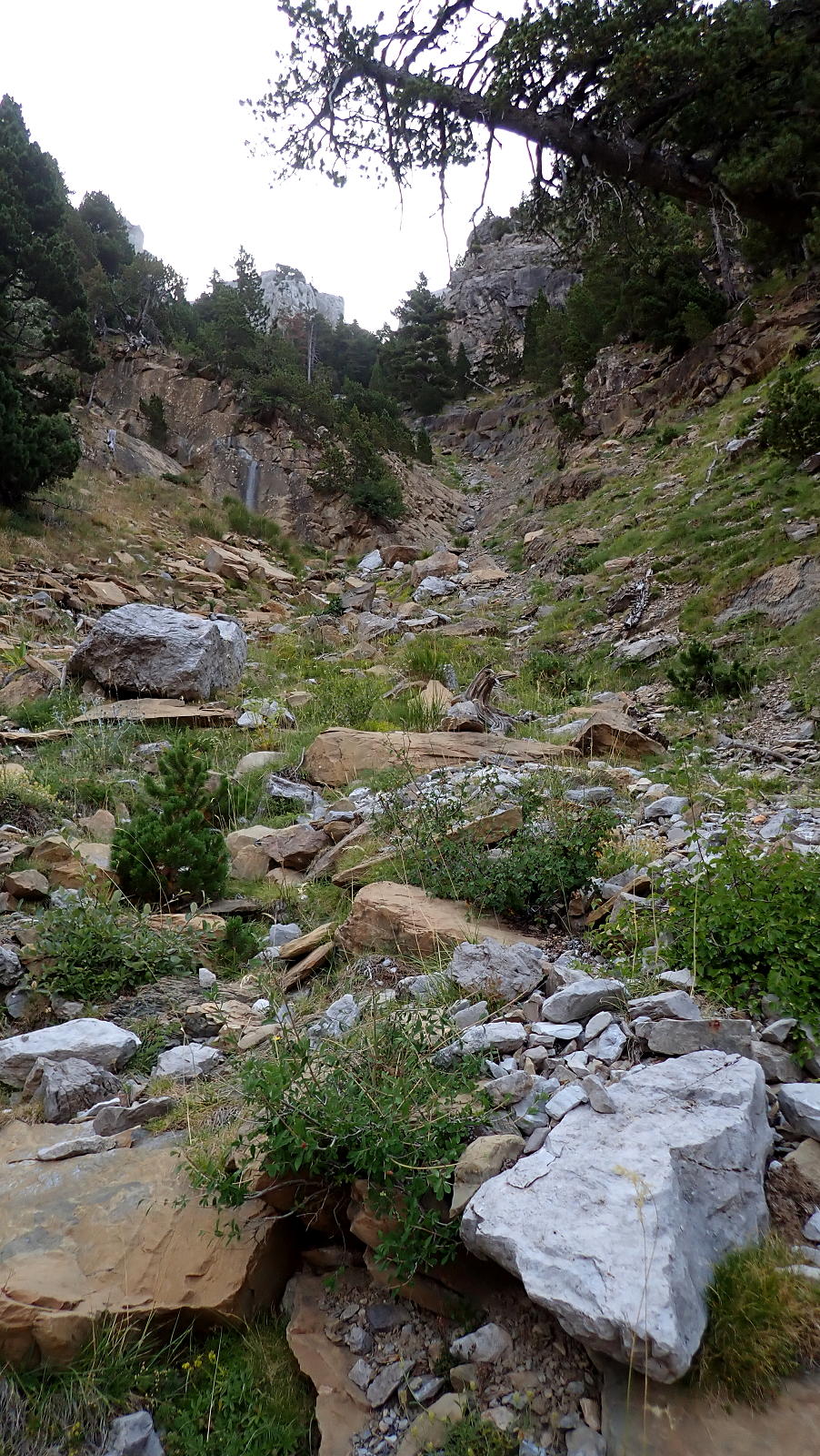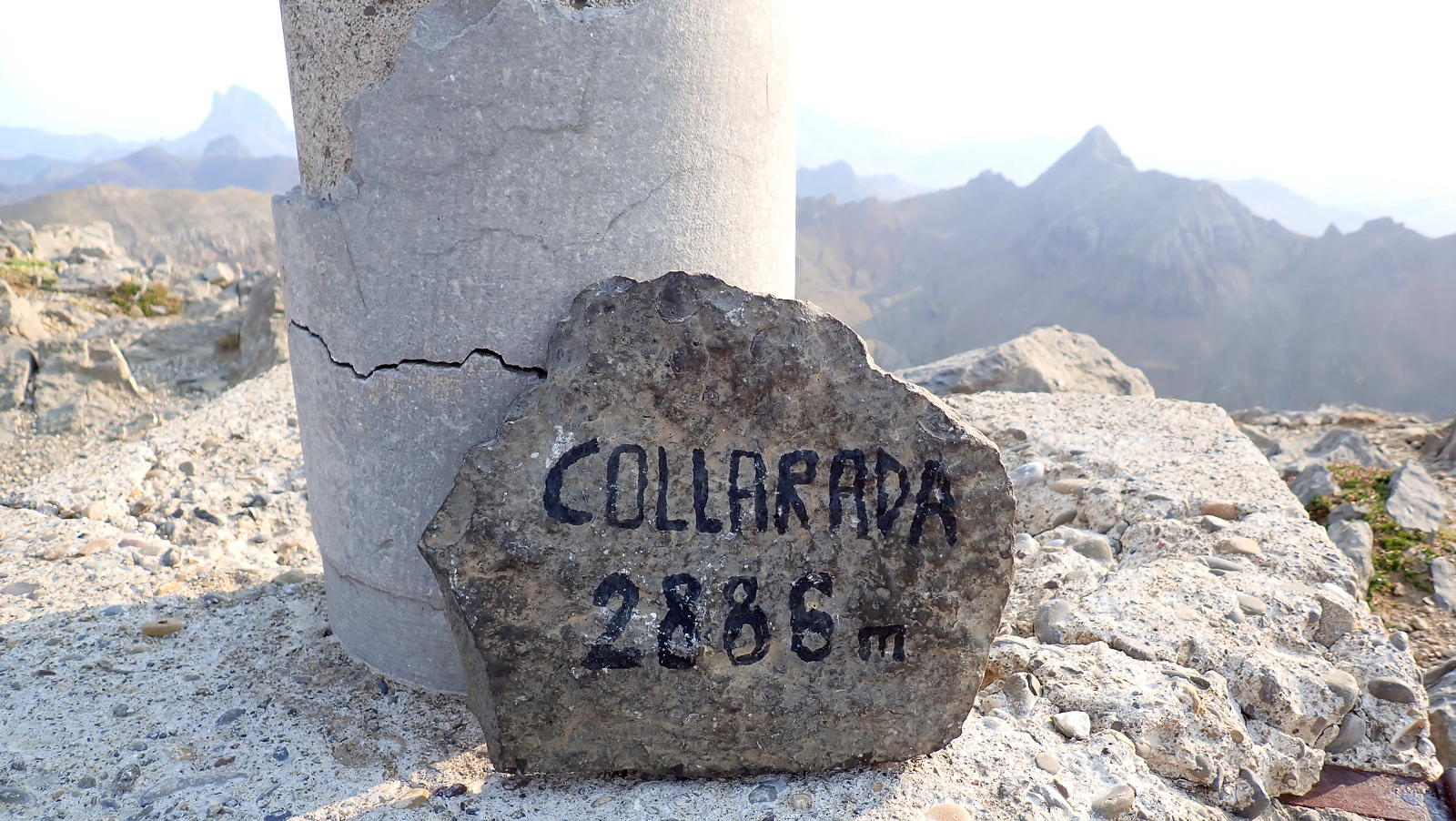 Esta zona es de pasto y piedras, cada vez más piedras y menos pasto; parece llana, pero según vas andando se nota la pendiente. Por aquí se acaba la señalización, solo hay algunos hitos muy alejados. hay que cruzar una barranquera, la Fuente de los Campaniles (2480m 2h41′). Comienza la pedrera (2640m 3h00′) y se une la senda de la Trapa (vía normal). La pedrera tiene bastante pendiente, pero buena huella. Al final hay que meterse en una canal de roca saliendo a la cresta unos metros a la derecha de la cima. Collarada (2883m 3h29′).