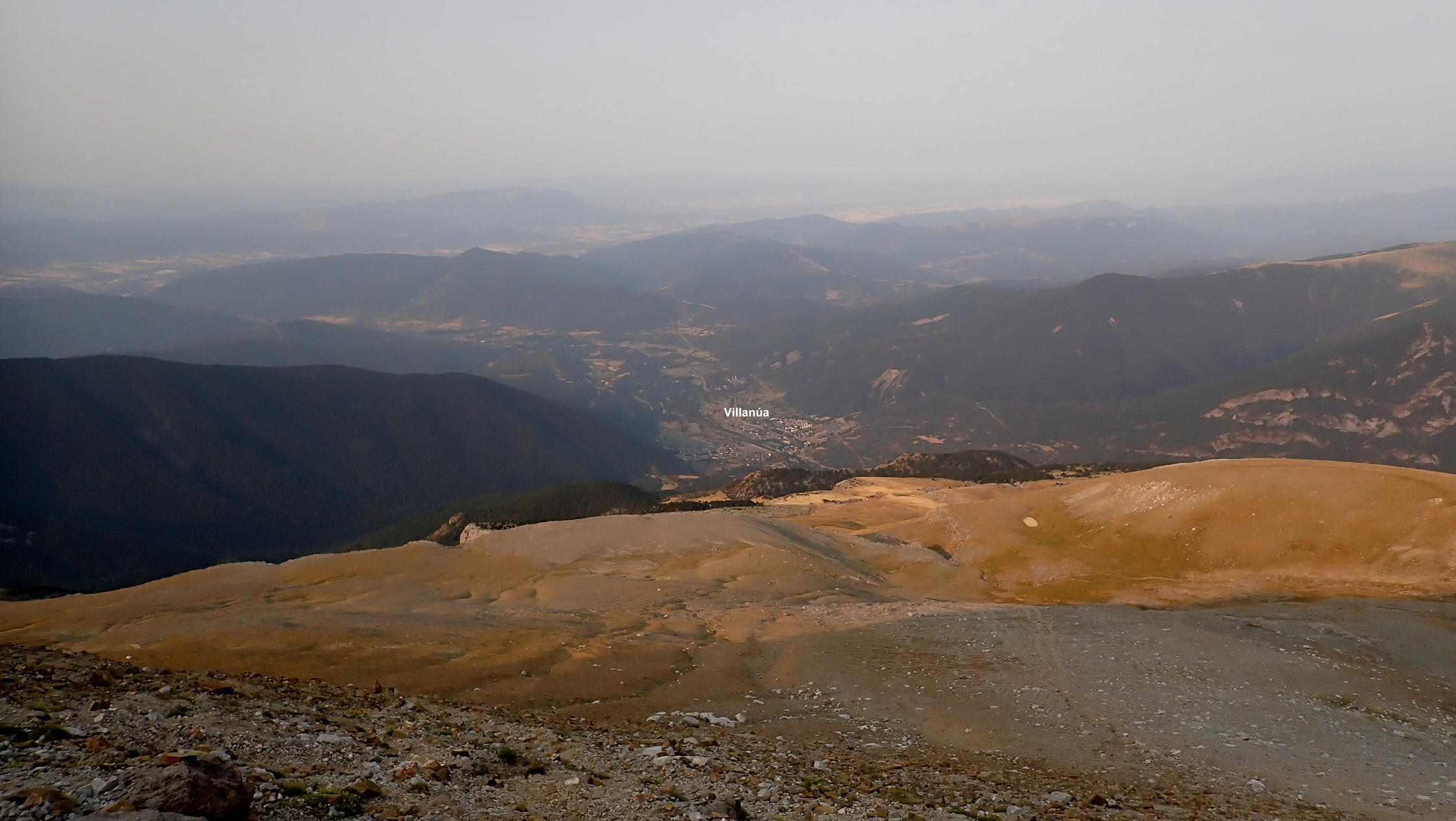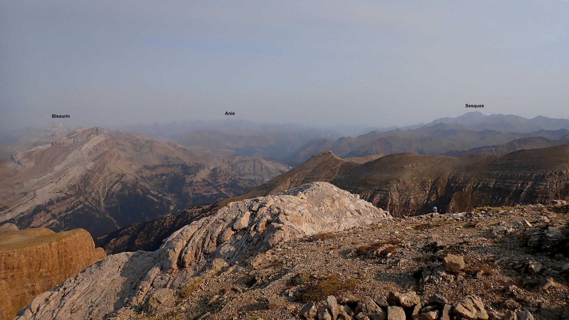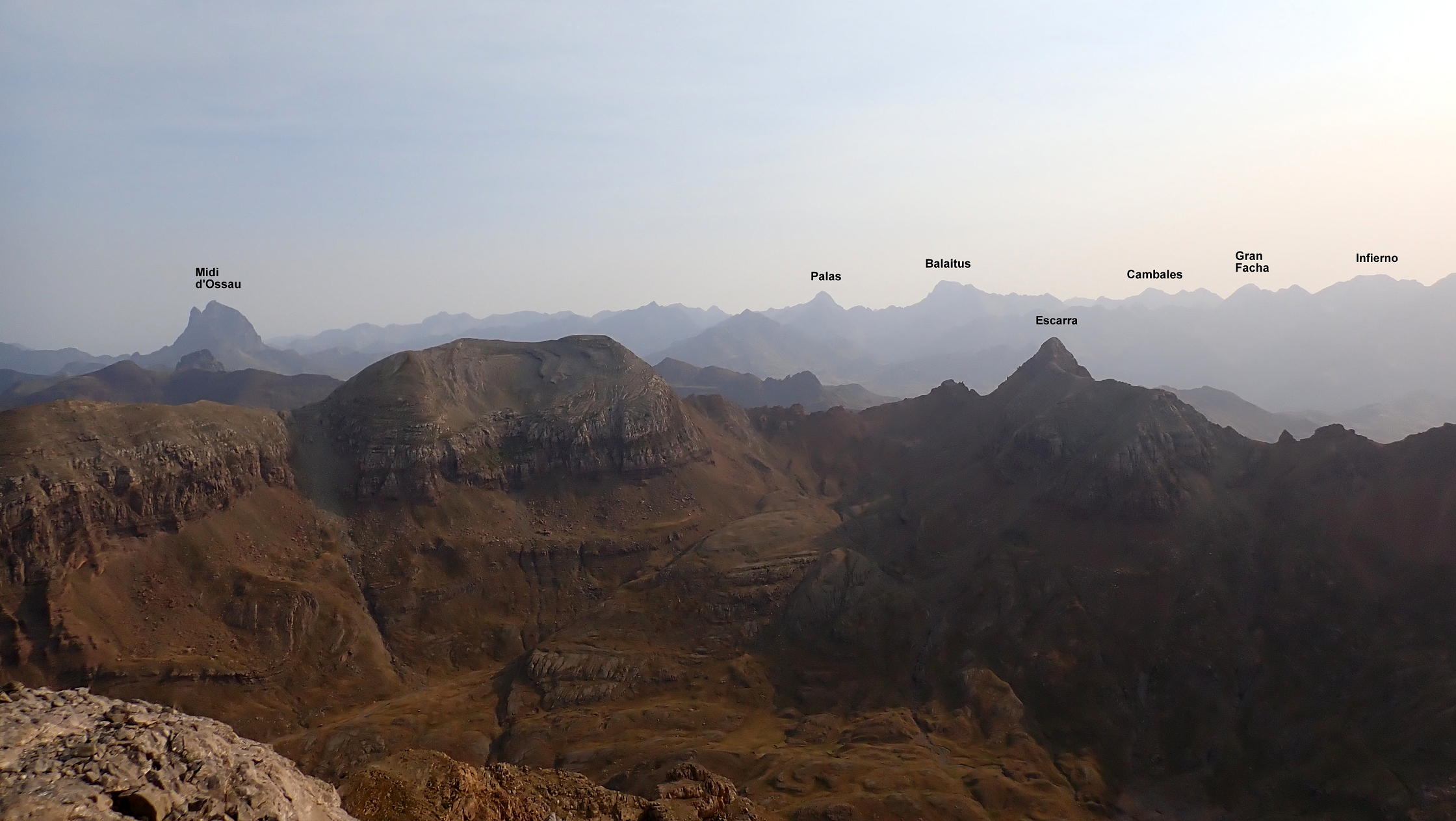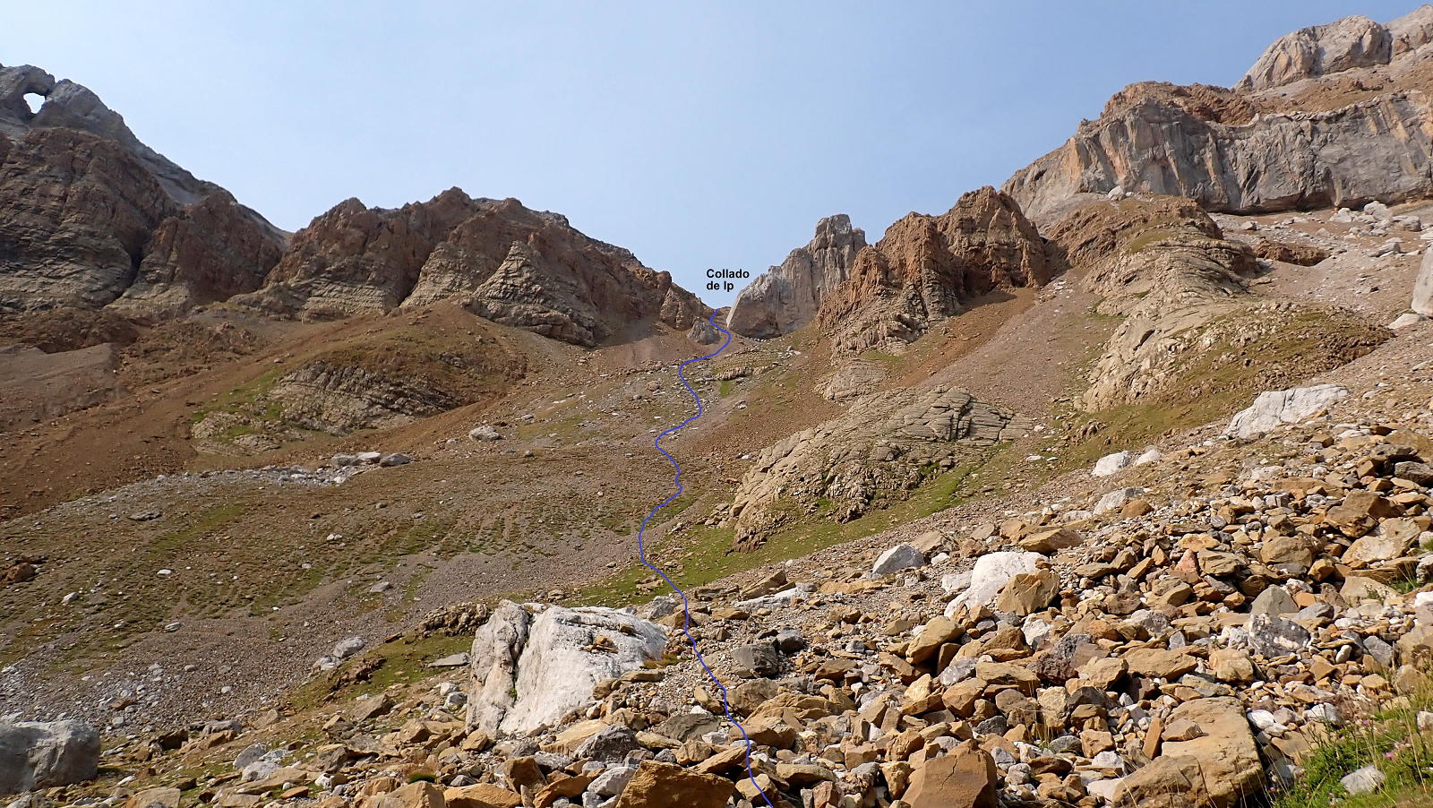 El día tiene una atmósfera con calima, la visibilidad no es muy buena, pero proporciona una luminosidad de tonos anaranjados que también es bonita. Inicio el descenso siguiendo el lomo hacia el este y SE, bajada muy pendiente por roca y piedra con mucha huella con la vista ya puesta en el collado. Una primera canal a mi izquierda no es la que hay que seguir, sino que debo llegar hasta el collado de Ip (2566m 4h05′).