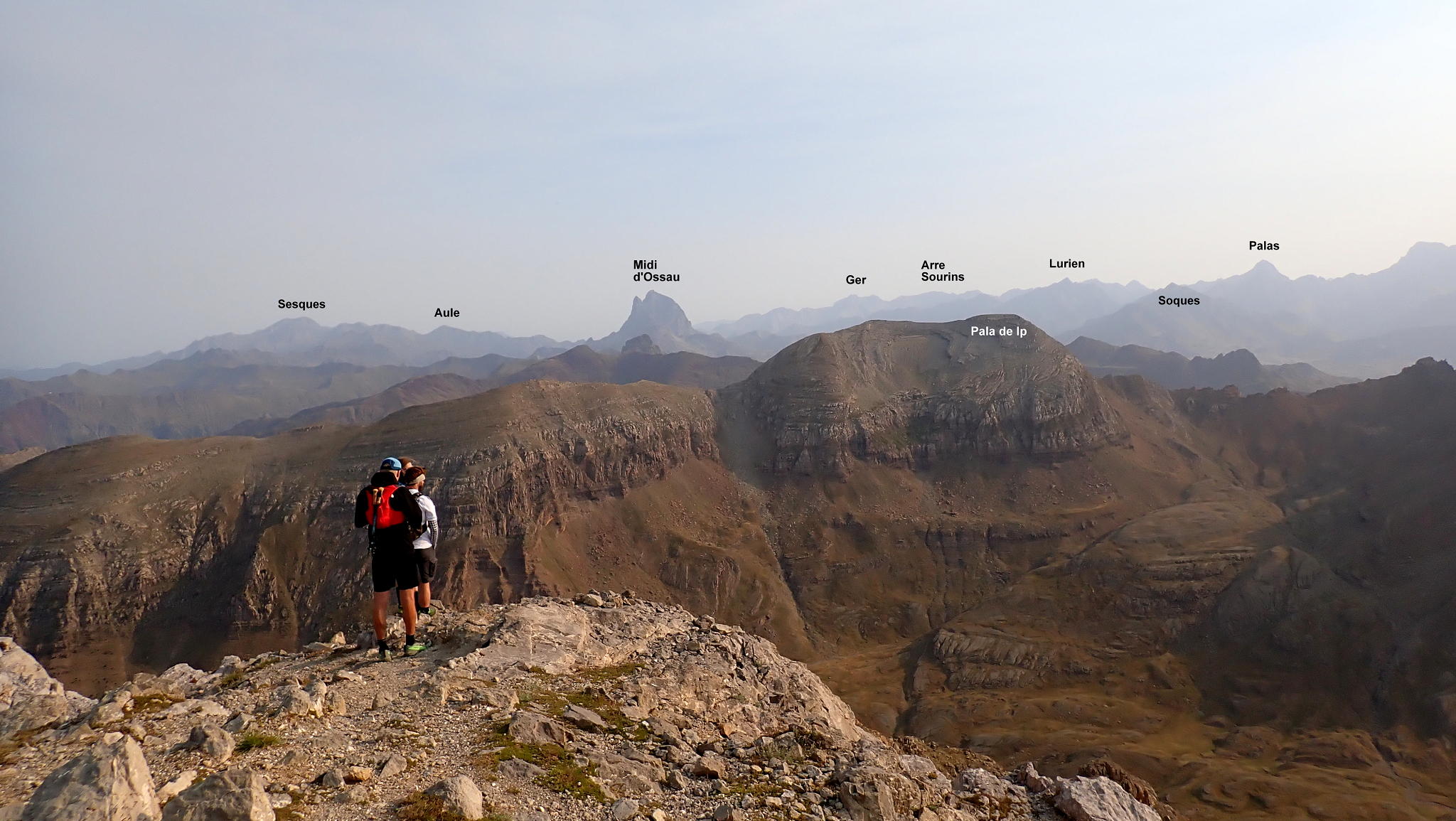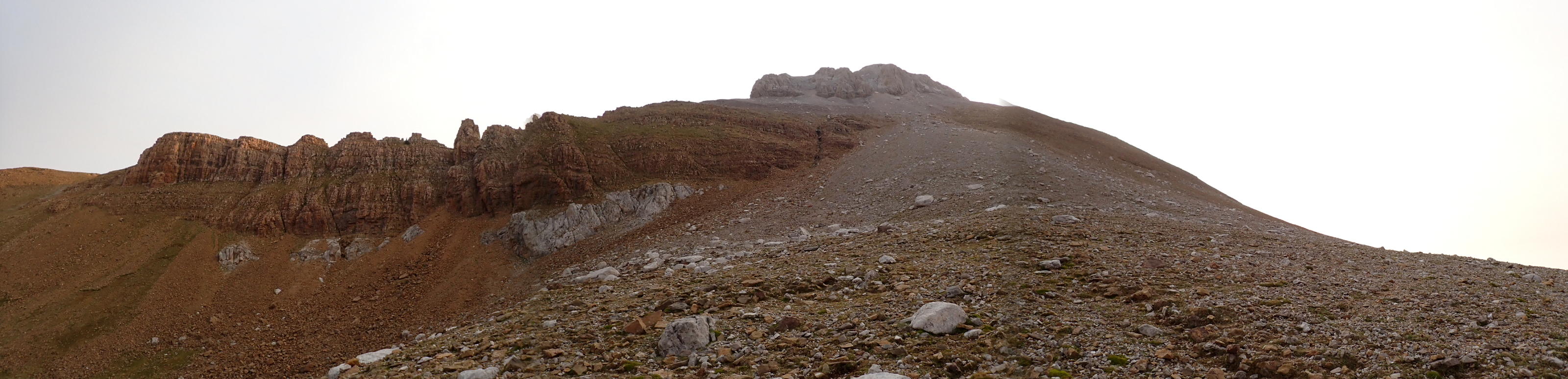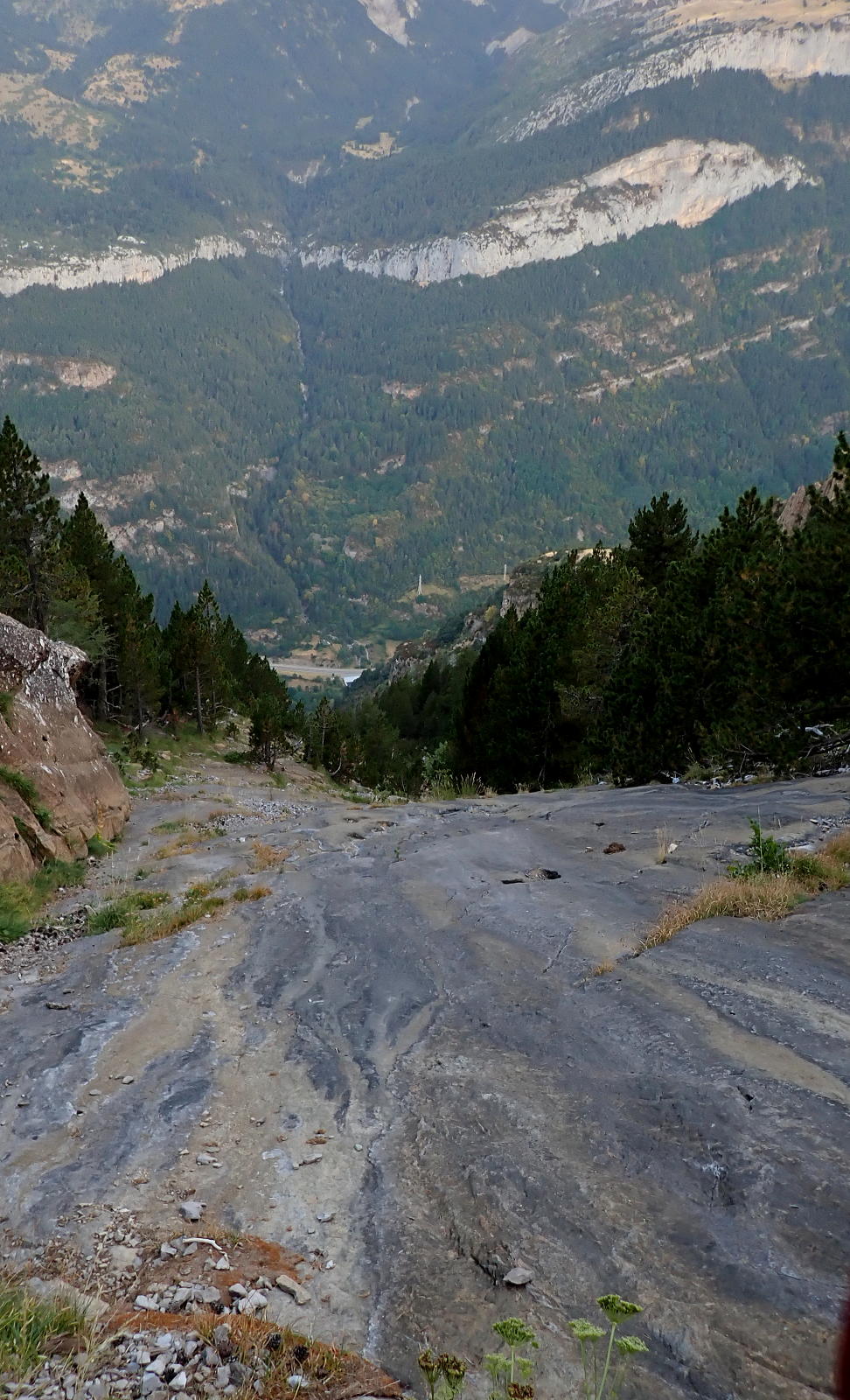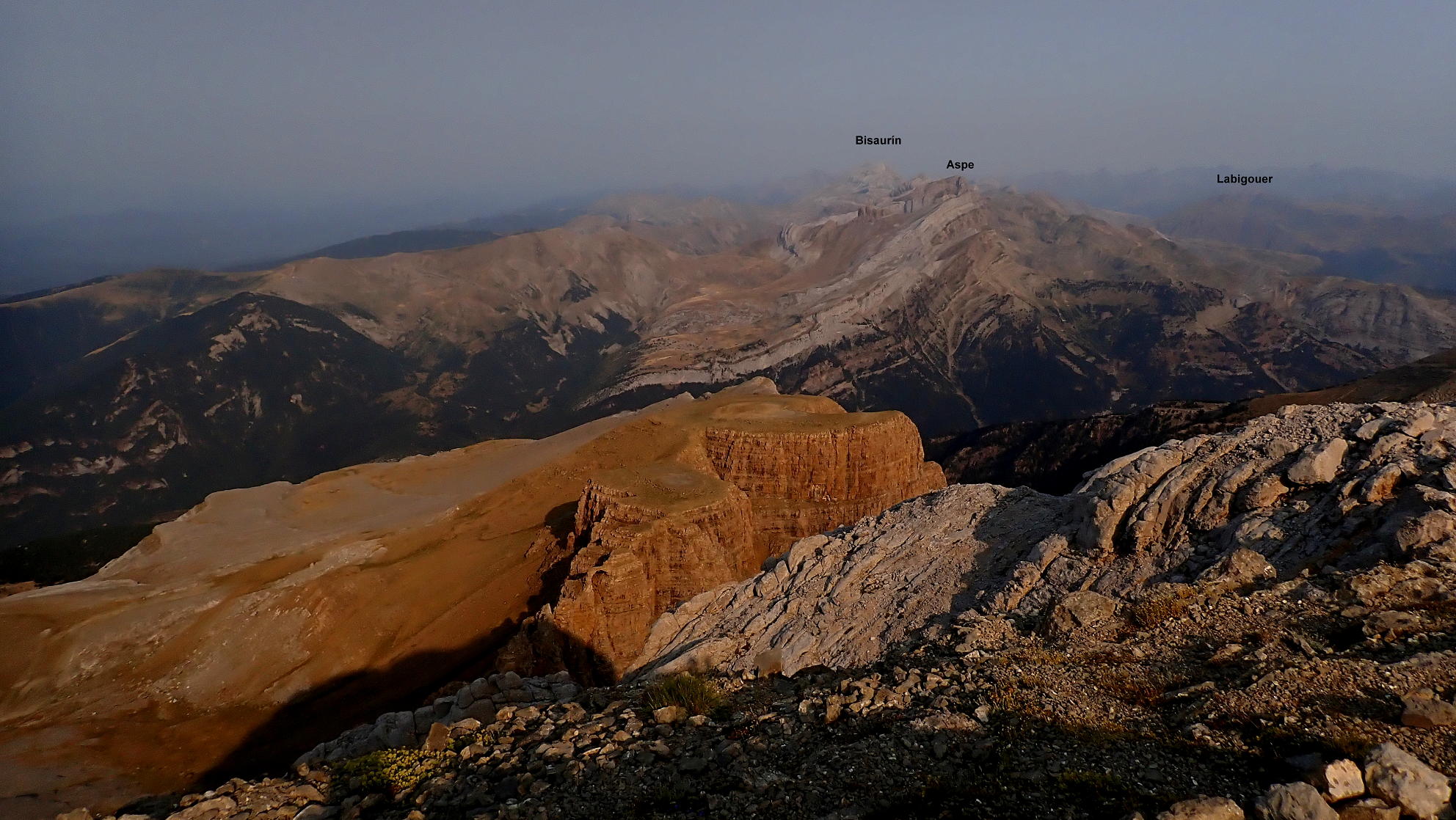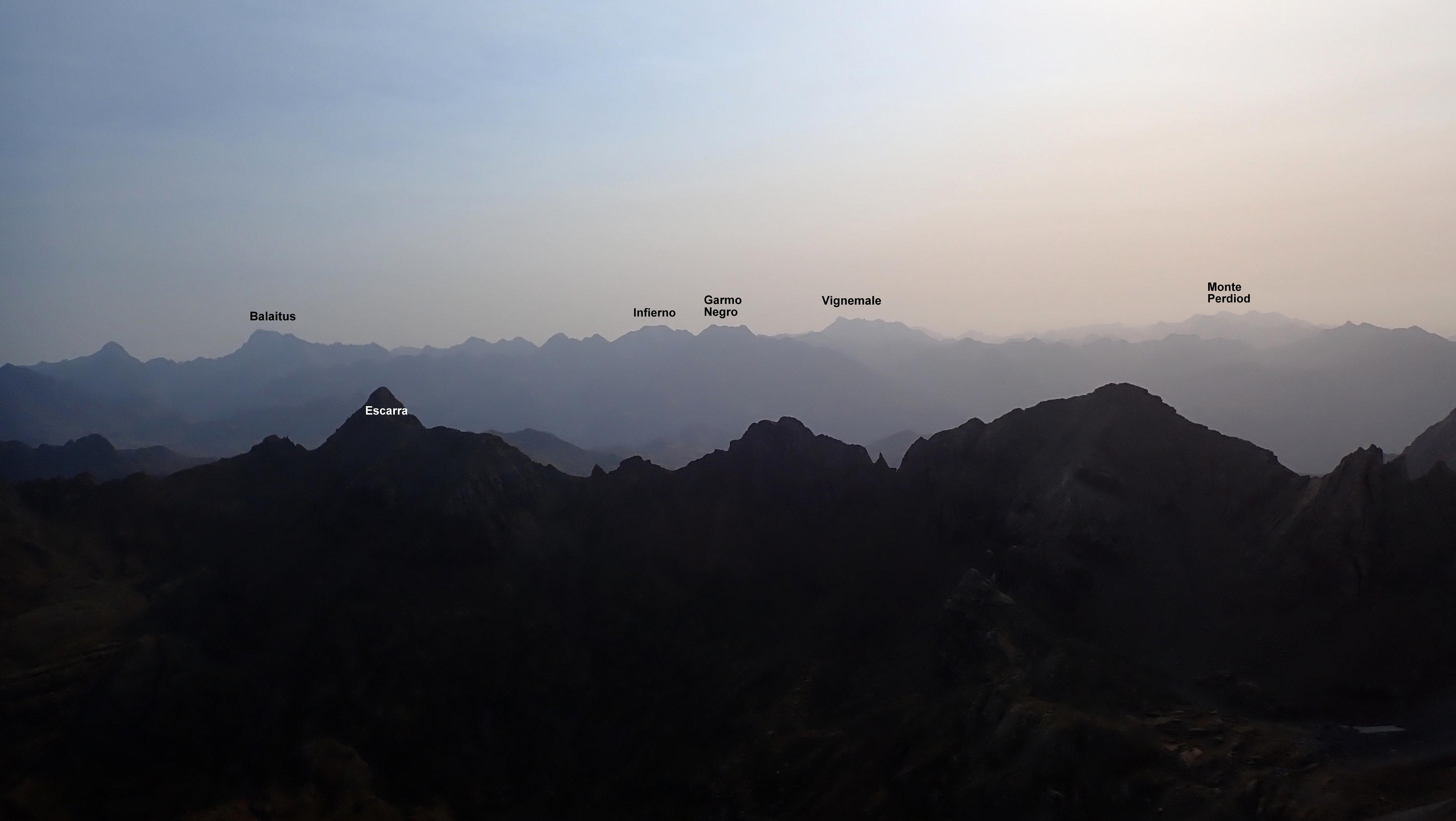 El día tiene una atmósfera con calima, la visibilidad no es muy buena, pero proporciona una luminosidad de tonos anaranjados que también es bonita. Inicio el descenso siguiendo el lomo hacia el este y SE, bajada muy pendiente por roca y piedra con mucha huella con la vista ya puesta en el collado. Una primera canal a mi izquierda no es la que hay que seguir, sino que debo llegar hasta el collado de Ip (2566m 4h05′).