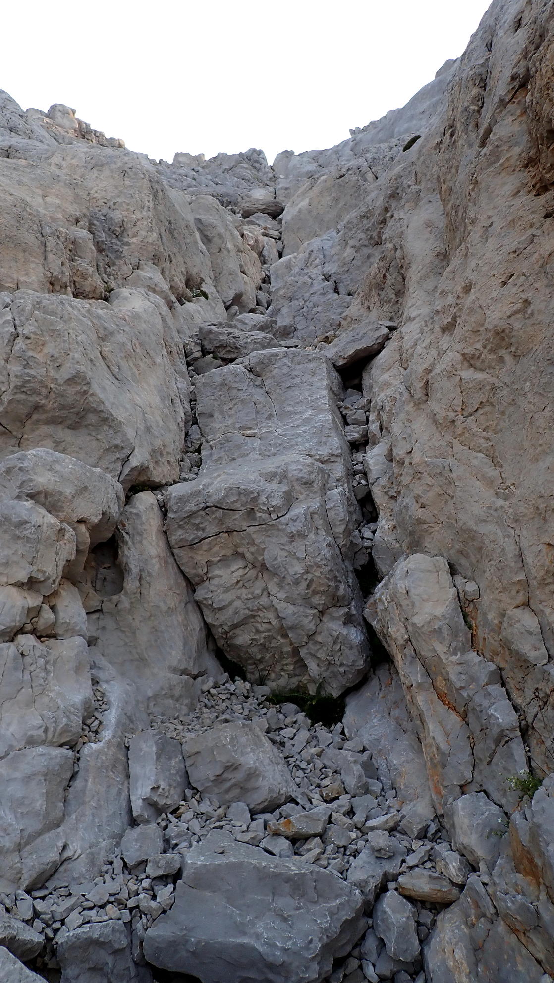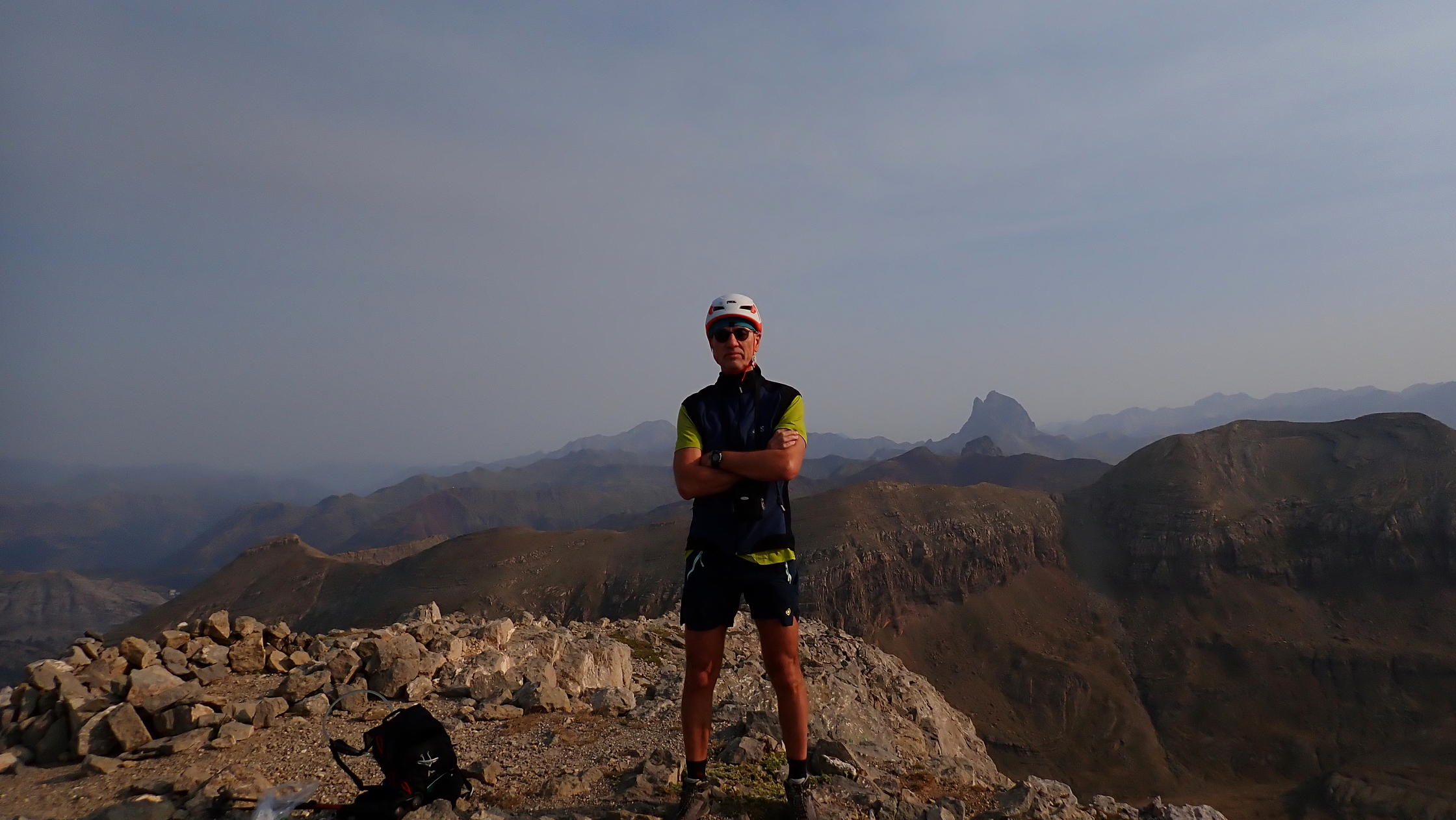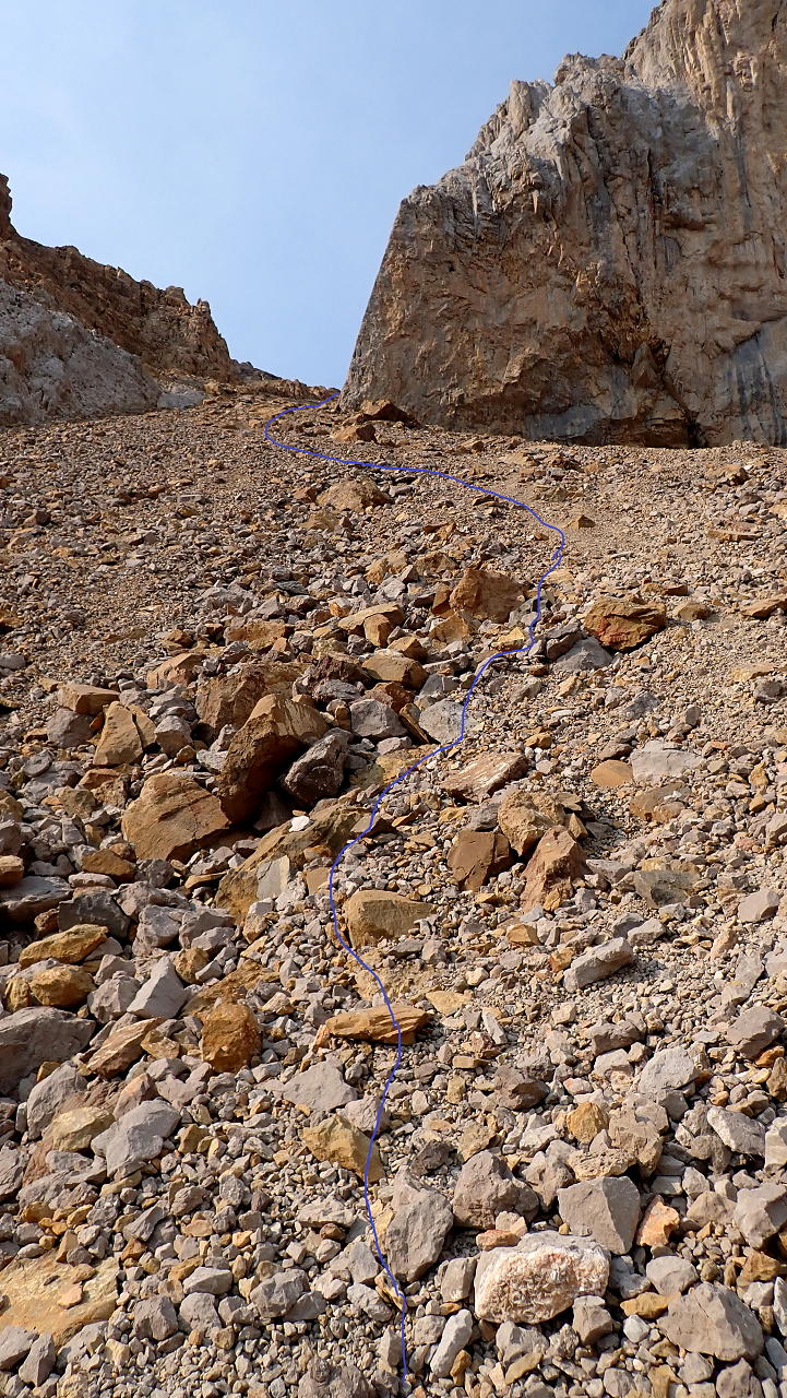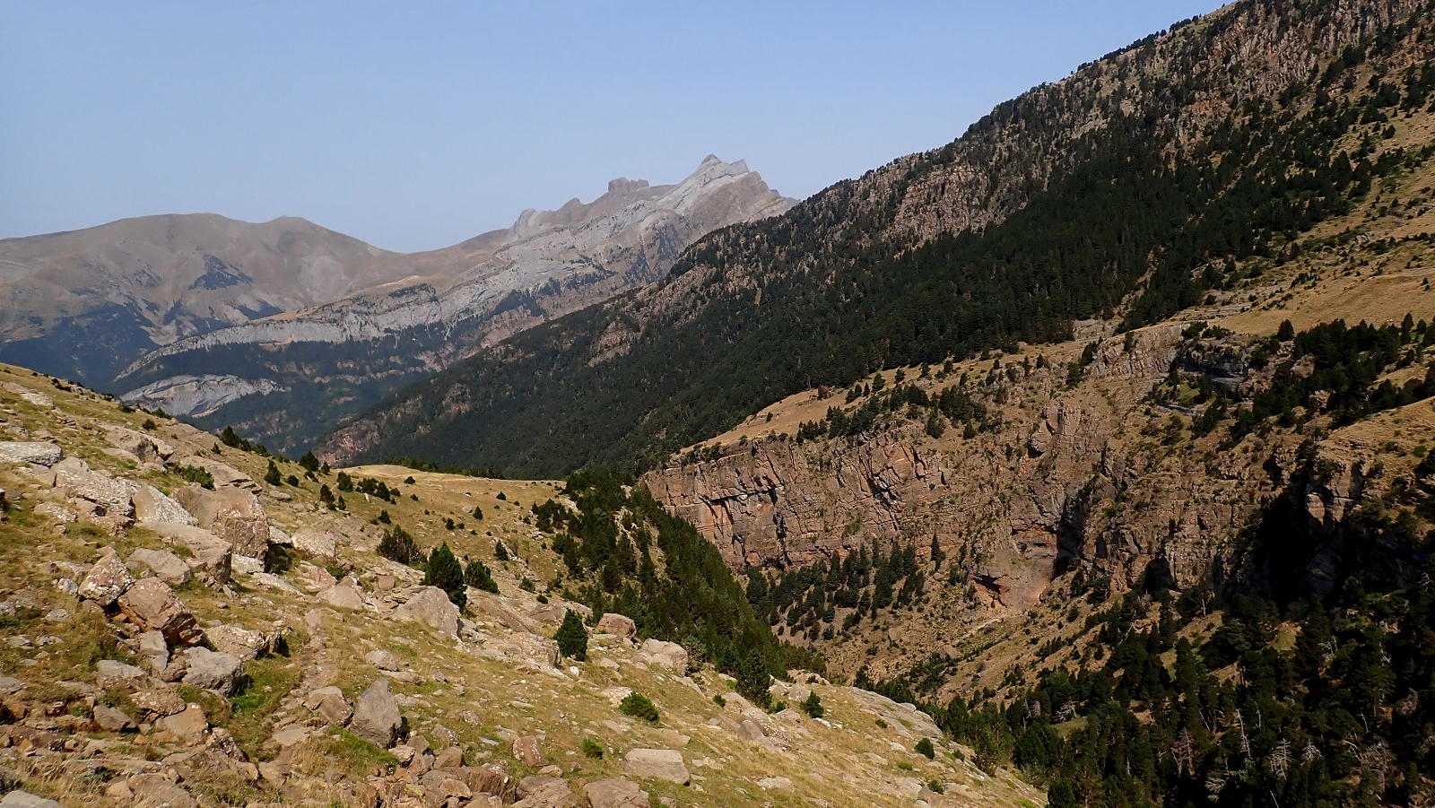 El día tiene una atmósfera con calima, la visibilidad no es muy buena, pero proporciona una luminosidad de tonos anaranjados que también es bonita. Inicio el descenso siguiendo el lomo hacia el este y SE, bajada muy pendiente por roca y piedra con mucha huella con la vista ya puesta en el collado. Una primera canal a mi izquierda no es la que hay que seguir, sino que debo llegar hasta el collado de Ip (2566m 4h05′).