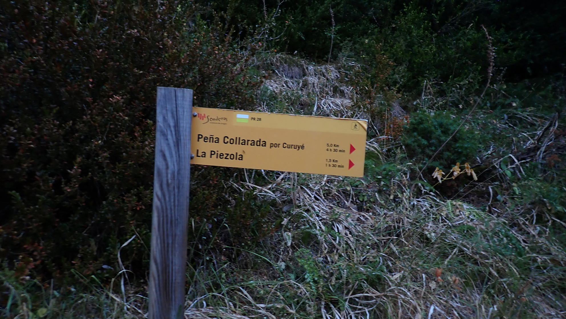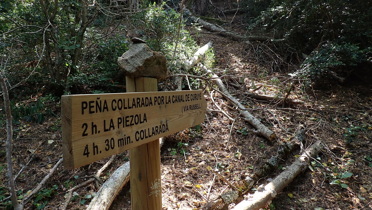Descripción de la ruta: Puente de los Peregrinos (1060m). Sigo la pista, que corresponde al Camino de Santiago, y enseguida hay un desvío a la derecha. Un cartel señala «Peña Collarada por Vía Russell». El sendero en zigzag avanza por el bosque. Una nueva bifurcación que tomo a la derecha con un cartel de madera que indica «Collarada por Canal de Curuyé (Vía Russell)» (1300m 0h27′) y será el punto de confluencia con el camino de bajada.