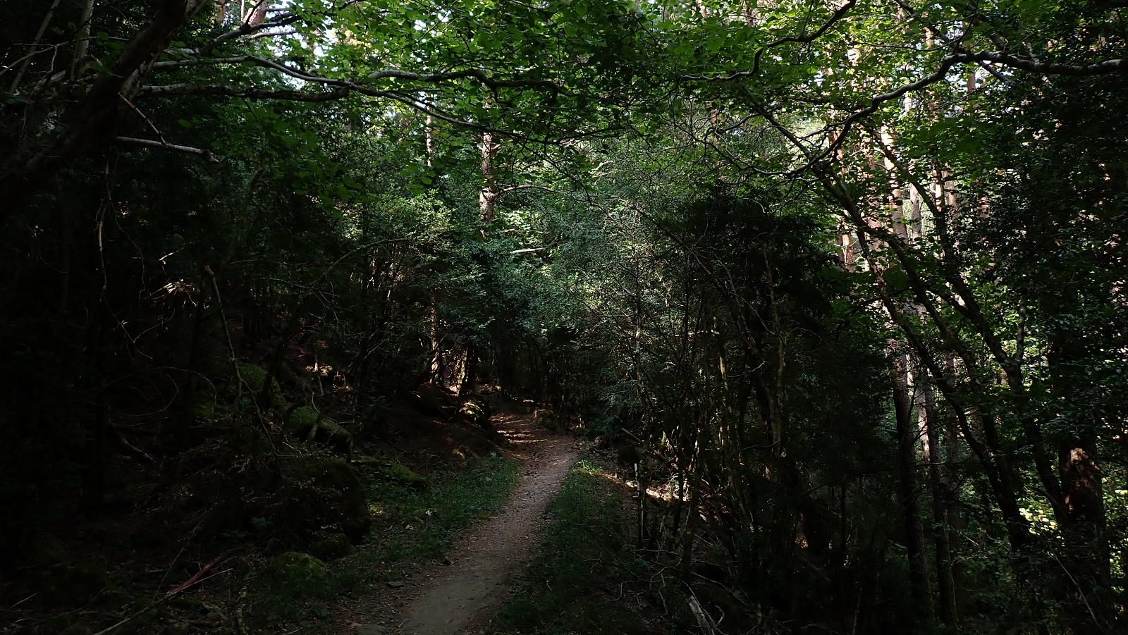 La senda es clara y bastante llana, con pintura amarilla y blanca e hitos. Luego entra en el bosque y el descenso es más fuerte. Se agradece la sombra a estas horas y con la ola de calor que estamos sufriendo. Llego al punto de confluencia (1300m 6h31′) y al aparcamiento (1060m 6h49′)