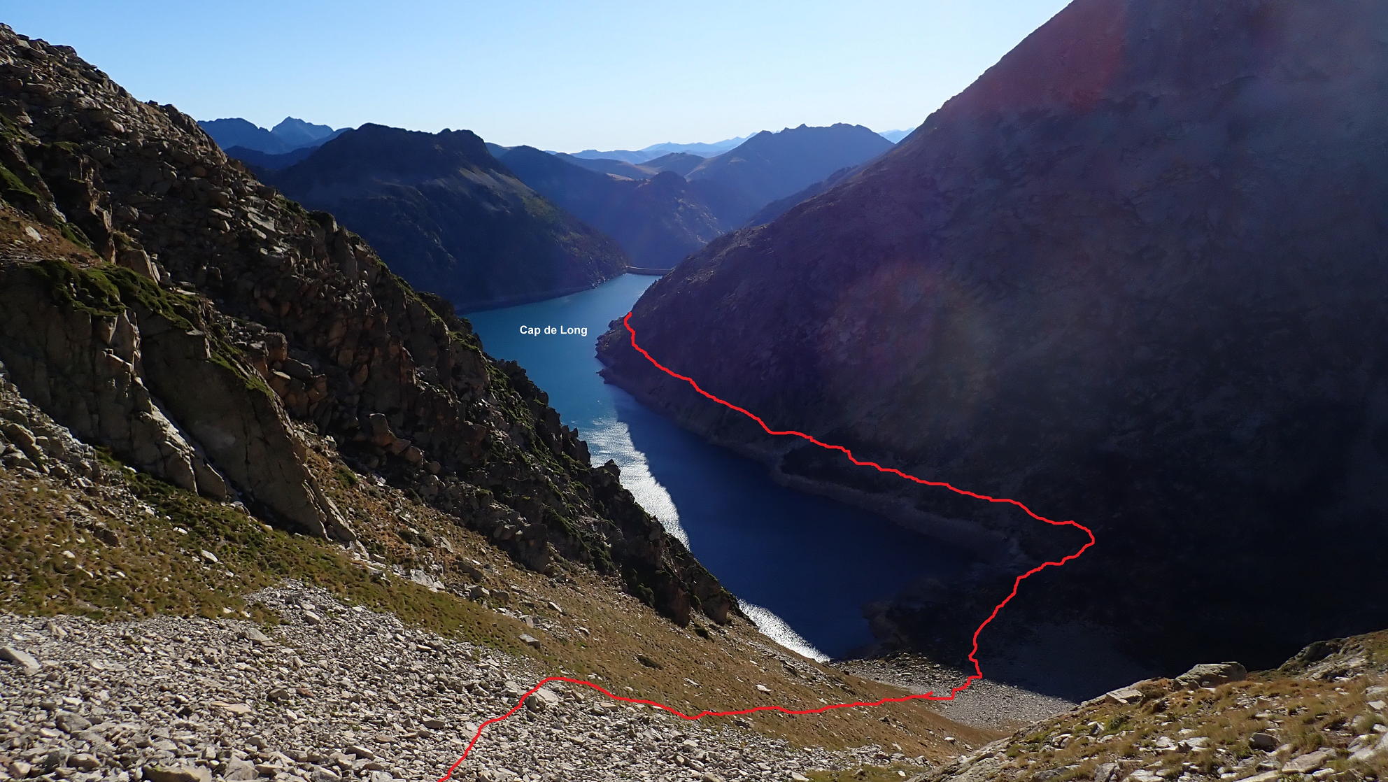 Toca subir por el mismo camino de antes al col Tourrat (2604h 8h07′). Ya no vamos a la Hourquette de Bougarret sino que descendemos directos por una vaguada muy pendiente. Más abajo giramos a la izquierda para encontrar el sendero de la Hourquette y bajar hasta la estación de aforo y cruzar el río Cap de Long (2160m). De nuevo subida con paciencia al camino que bordea el Lac Cap de Long (2300m 9h37′) y largo flanqueo sobre el lago para llegar al aparcamiento (2170m 10h22′)