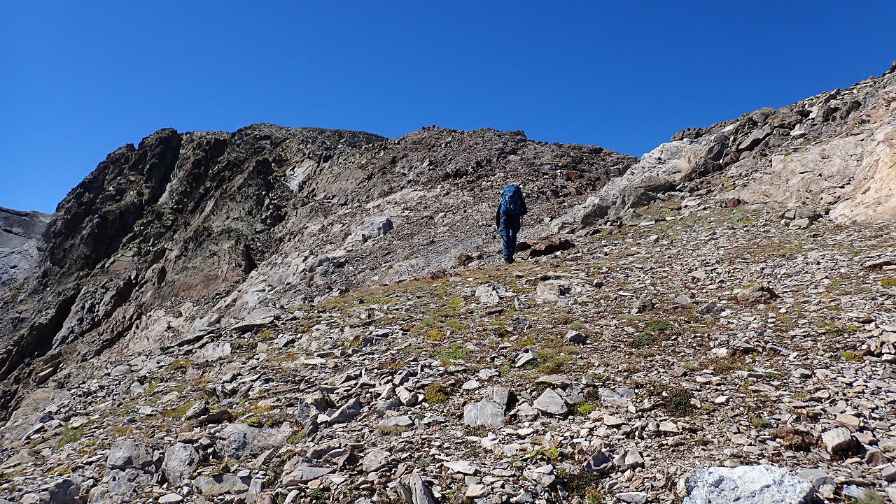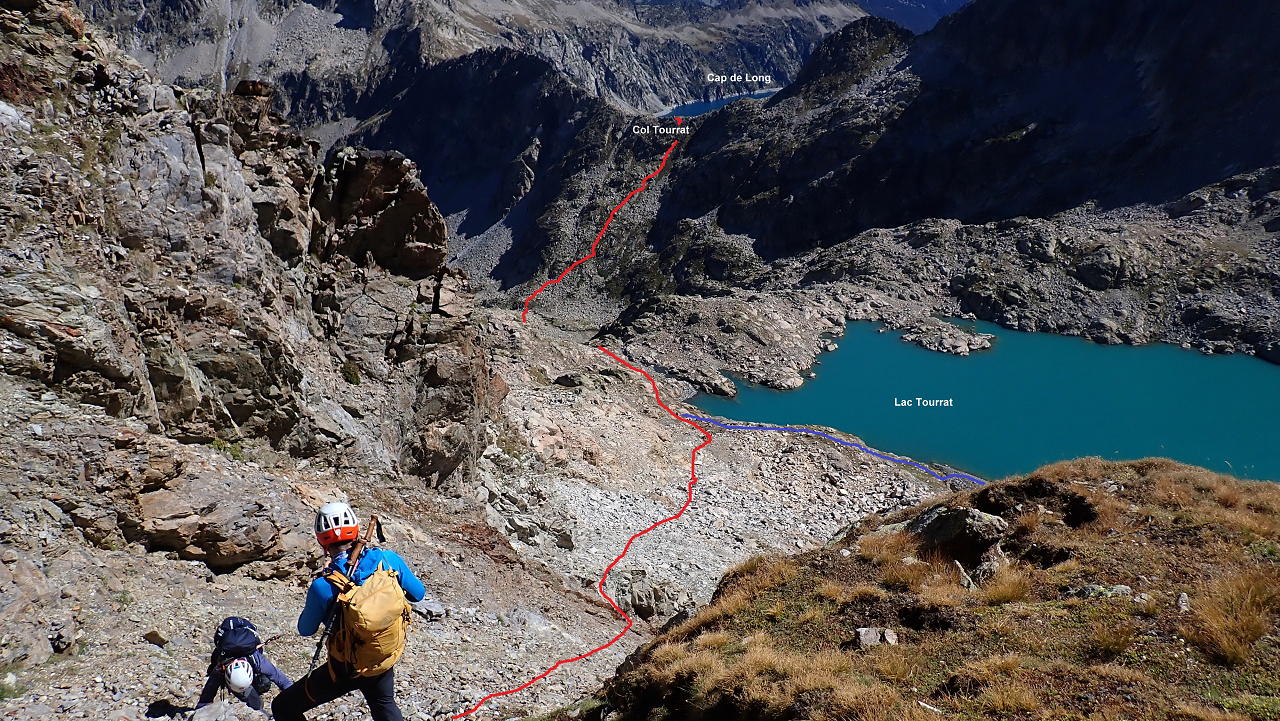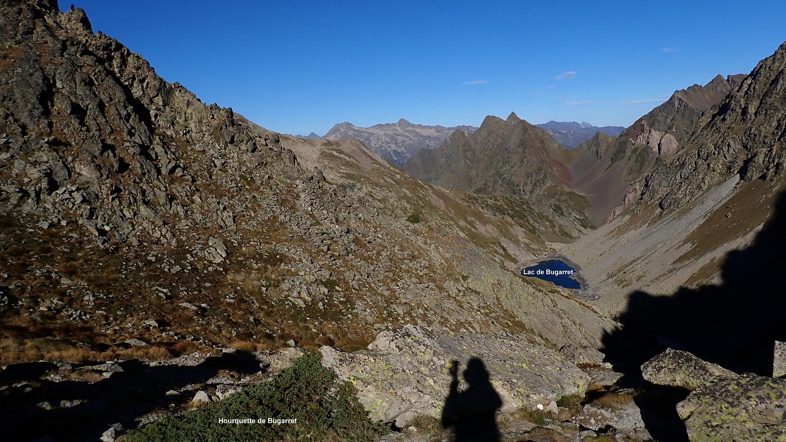 Atravesamos unos prados y tomamos la canal de fuerte pendiente con senda que nos lleva a la Hourquette de Bugarret (2614m 1h54′). En realidad este no es el paso más indicado para nuestra ruta, sino el col Tourrat o des Pêcheurs, situado a la izquierda (sur), así que hacemos una travesía perdiendo la menor altura posible, algo incómodo por una ladera pendiente y sobrepasando algunos resaltes rocosos, para desembocar el el col Tourrat (2604m 2h27′). Toca descender hacia el río Bugarret, con fuerte pendiente y traza de senda que va aprovechando una canal algo más herbosa, hasta el fondo de la cuenca de Bugarret (2420m 3h00′).