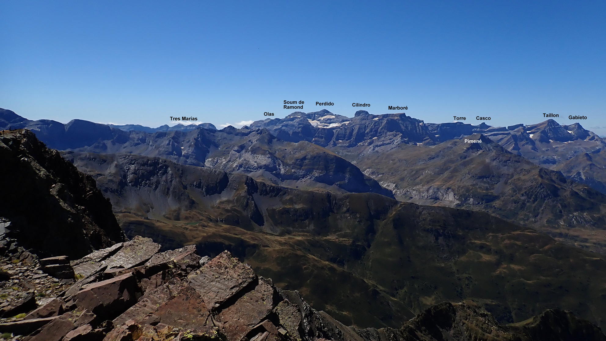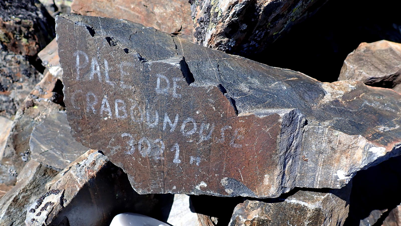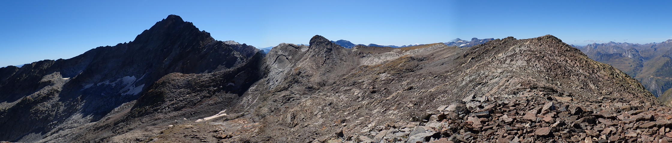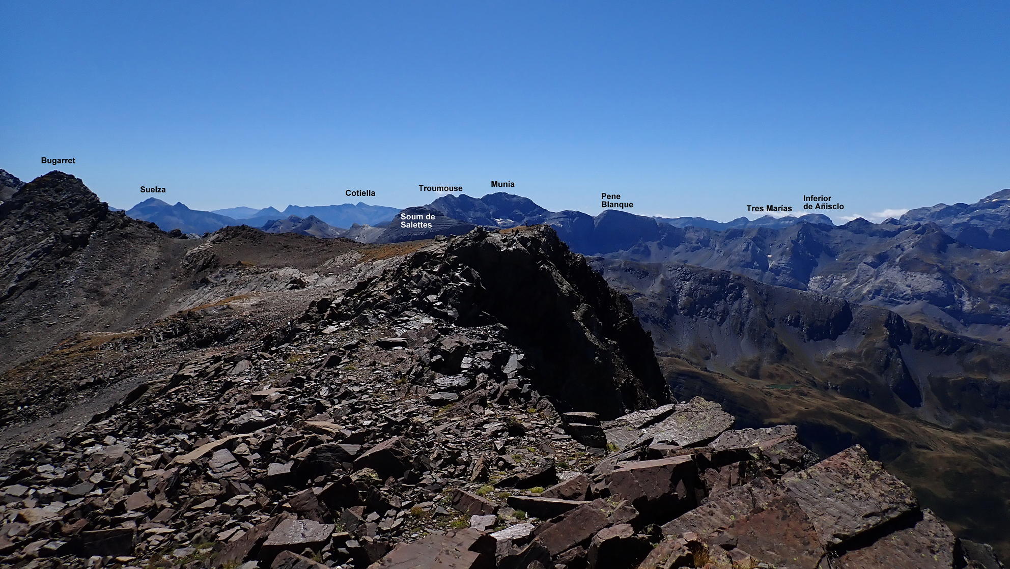 Llegamos a una primera cota (3016m 4h46′) y luego a la Pala Crabounouse (3021m 4h52′) en el punto donde se une con la cresta principal que cierra el circo de Tourrat. La caída hacia el oeste y el sur es vertiginosa, pero hacia el este y norte es suave. Continuamos la cresta hacia el SSE y en la cota 3015 hacia el este para coronar el Bougarret (3031m 5h12′). Hay unas vistas espectaculares.