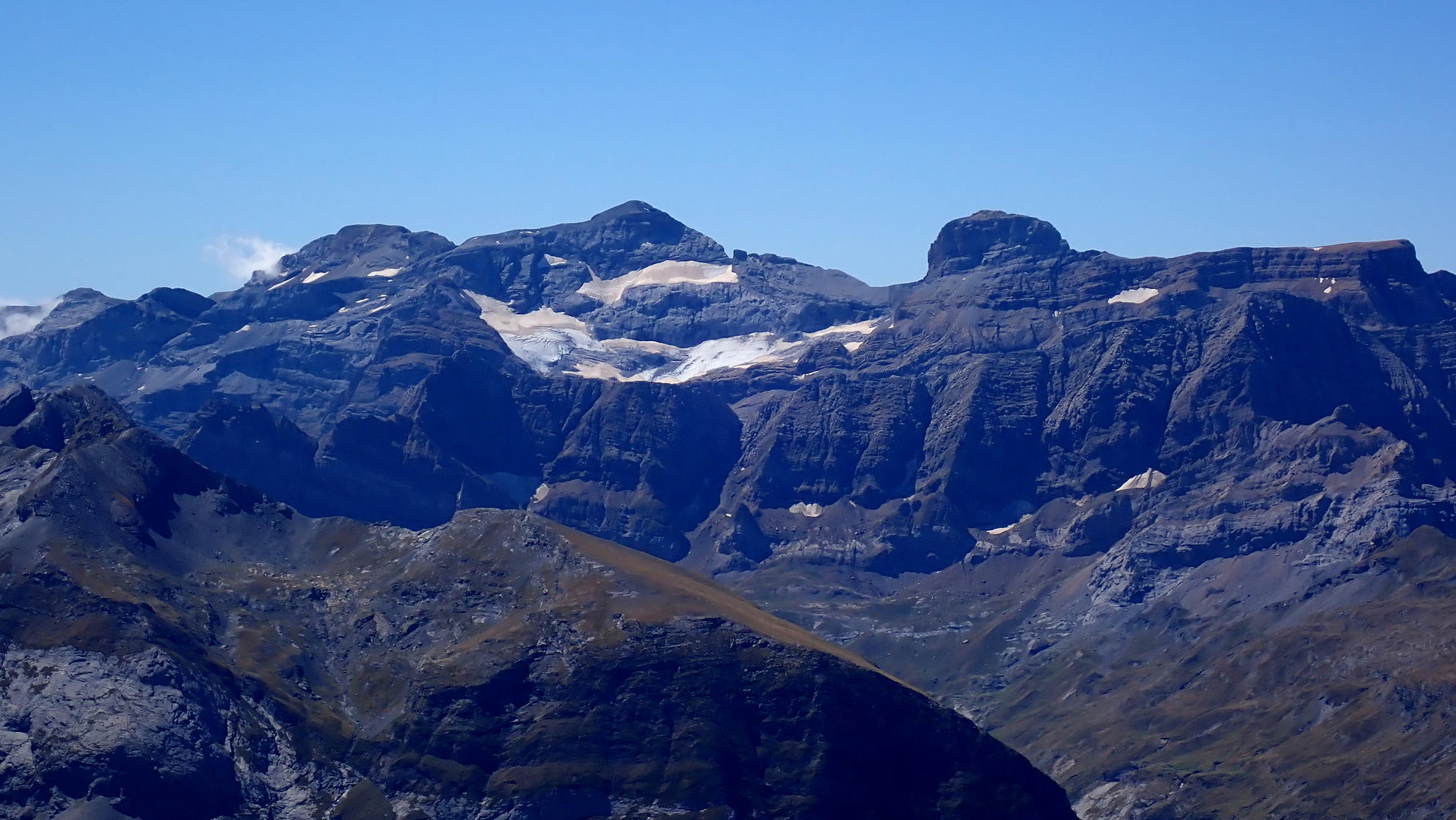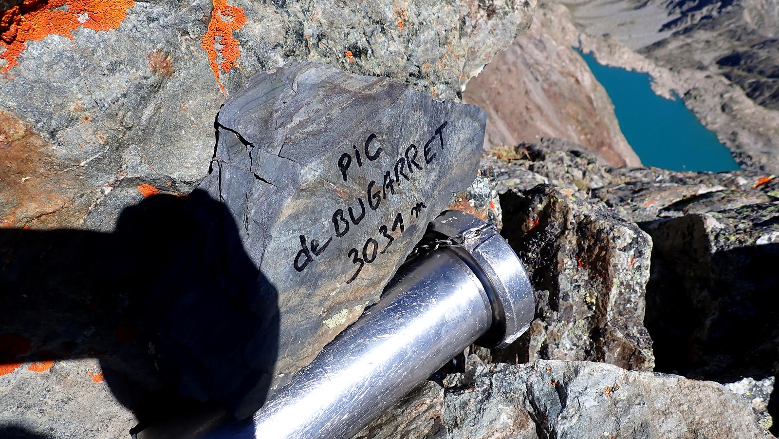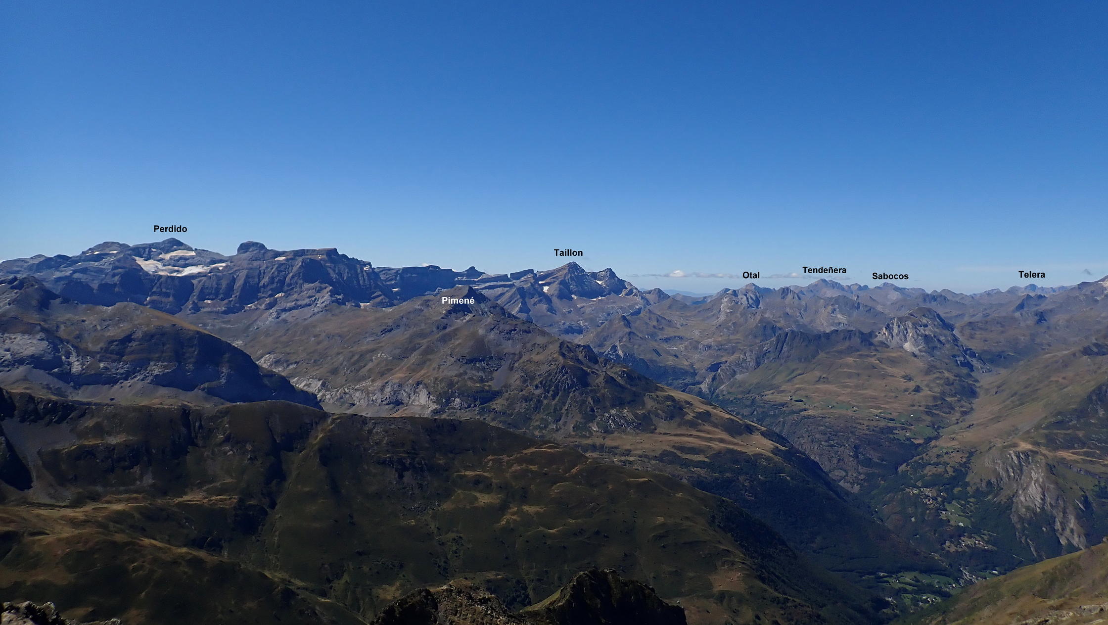 Llegamos a una primera cota (3016m 4h46′) y luego a la Pala Crabounouse (3021m 4h52′) en el punto donde se une con la cresta principal que cierra el circo de Tourrat. La caída hacia el oeste y el sur es vertiginosa, pero hacia el este y norte es suave. Continuamos la cresta hacia el SSE y en la cota 3015 hacia el este para coronar el Bougarret (3031m 5h12′). Hay unas vistas espectaculares.