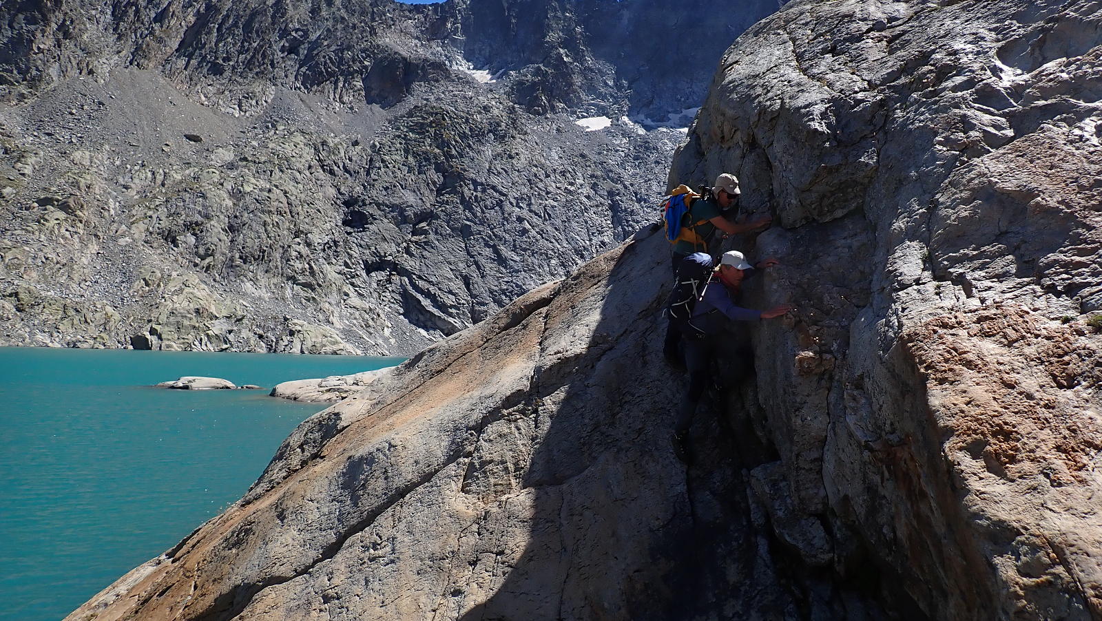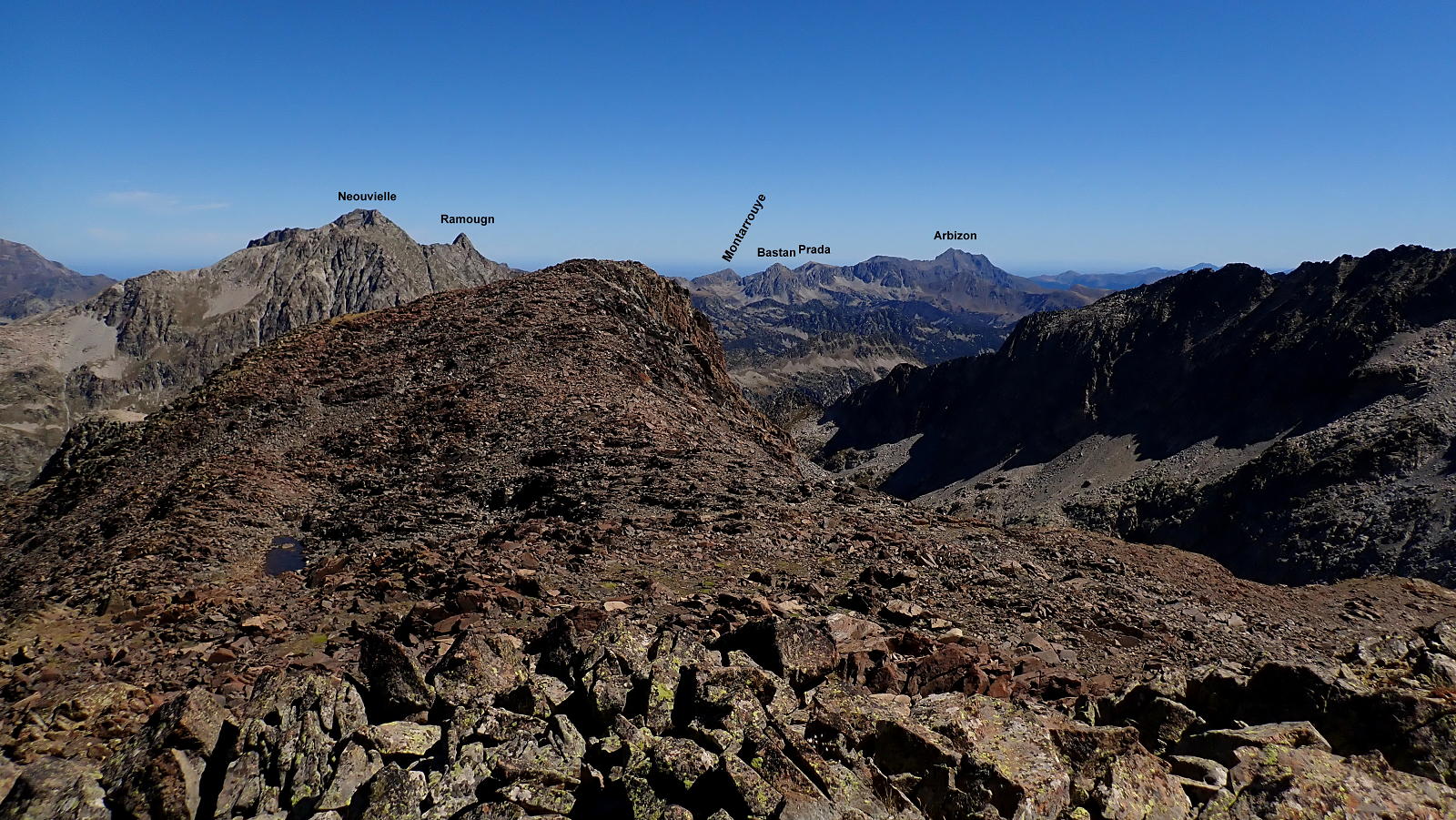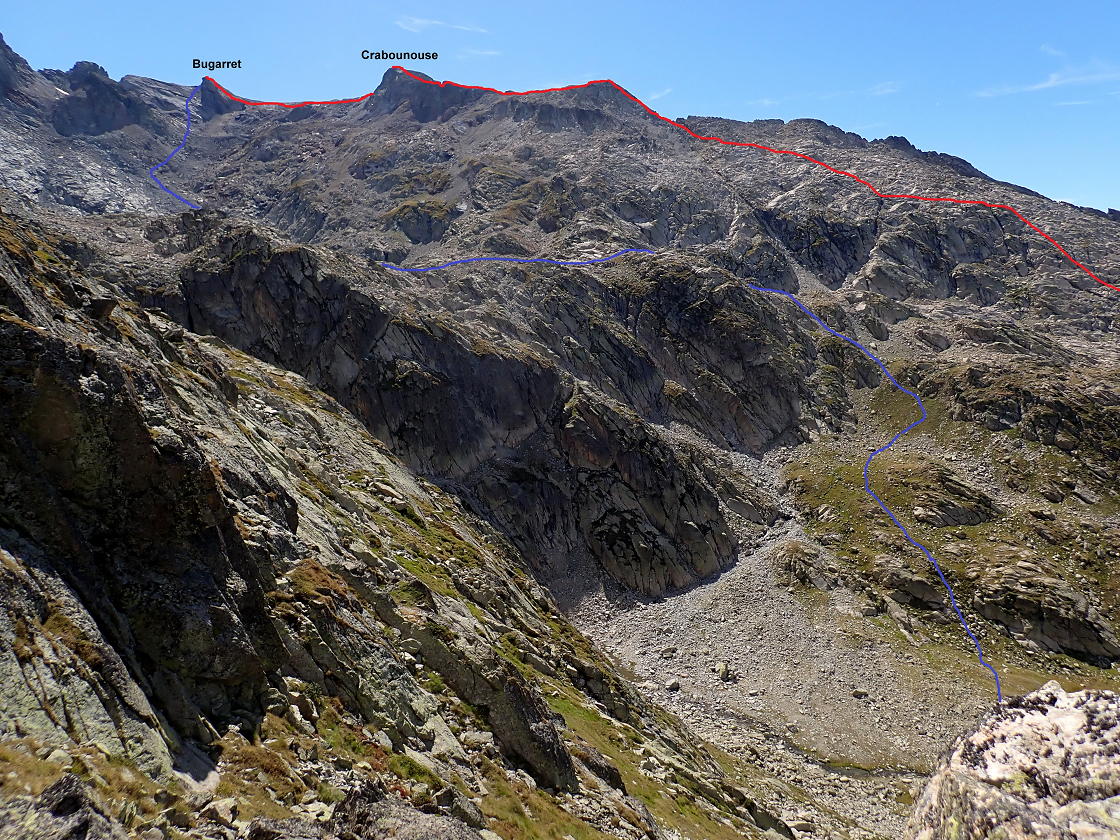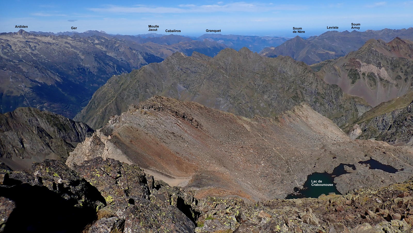 Ascendemos (SW) por una diagonal con senda y alcanzamos el lago Inferior de Tourrat (2585m 3h25′), pequeño lago al norte del lago principal. Con el Lac Tourrat a la vista (y el imponente Pic Long sobre él) nos metemos por las laderas a la derecha del lago, terreno rocoso primero de bloques y luego ya hay que echar las manos trepando en algunos pasos, alcanzando la cresta NNE del Crabounouse (2890m 4h15′), cresta bastante alomada y fácil.