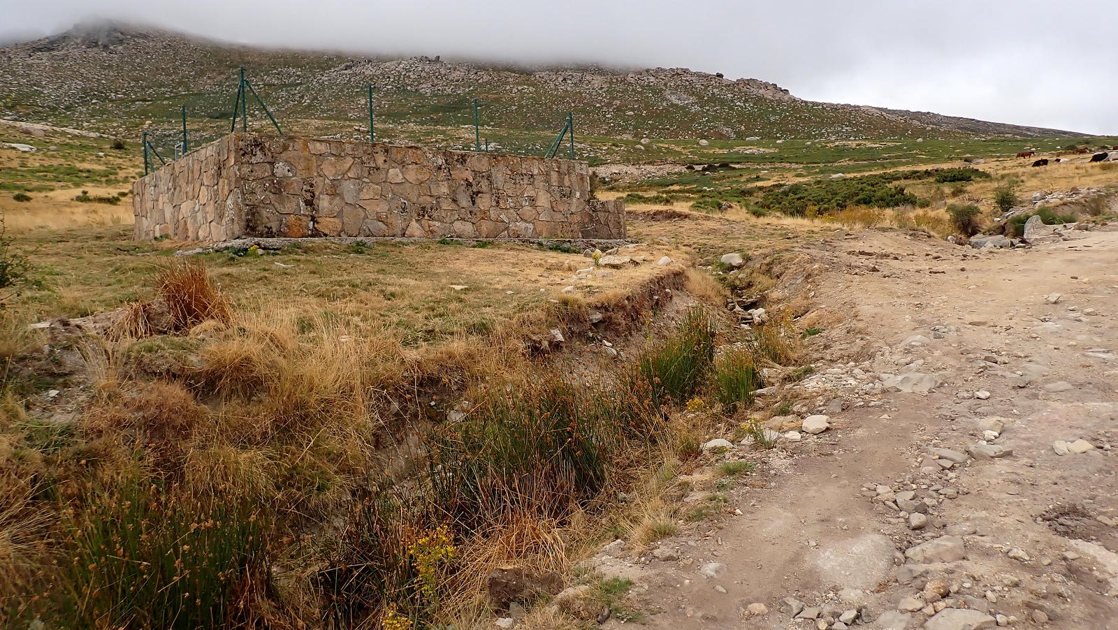 El día continúa desapacible y, sobre todo en la parte alta, la niebla hace que no pueda tener vistas desde la cima. En cualquier caso no tengo tanto viento y frío como en La Serrota. He escogido la ruta que asciende por la cara norte ya que se puede acceder en coche por pistas hasta la Fuente de Aguas Frías, a 1500m de altura, con lo cual hago un recorrido rápido (entre los dos picos de hoy son casi 1700m de desnivel y más de 25km de distancia). Muchas descripciones que he encontrado hacen la ruta desde Navandrinal, por el sur.