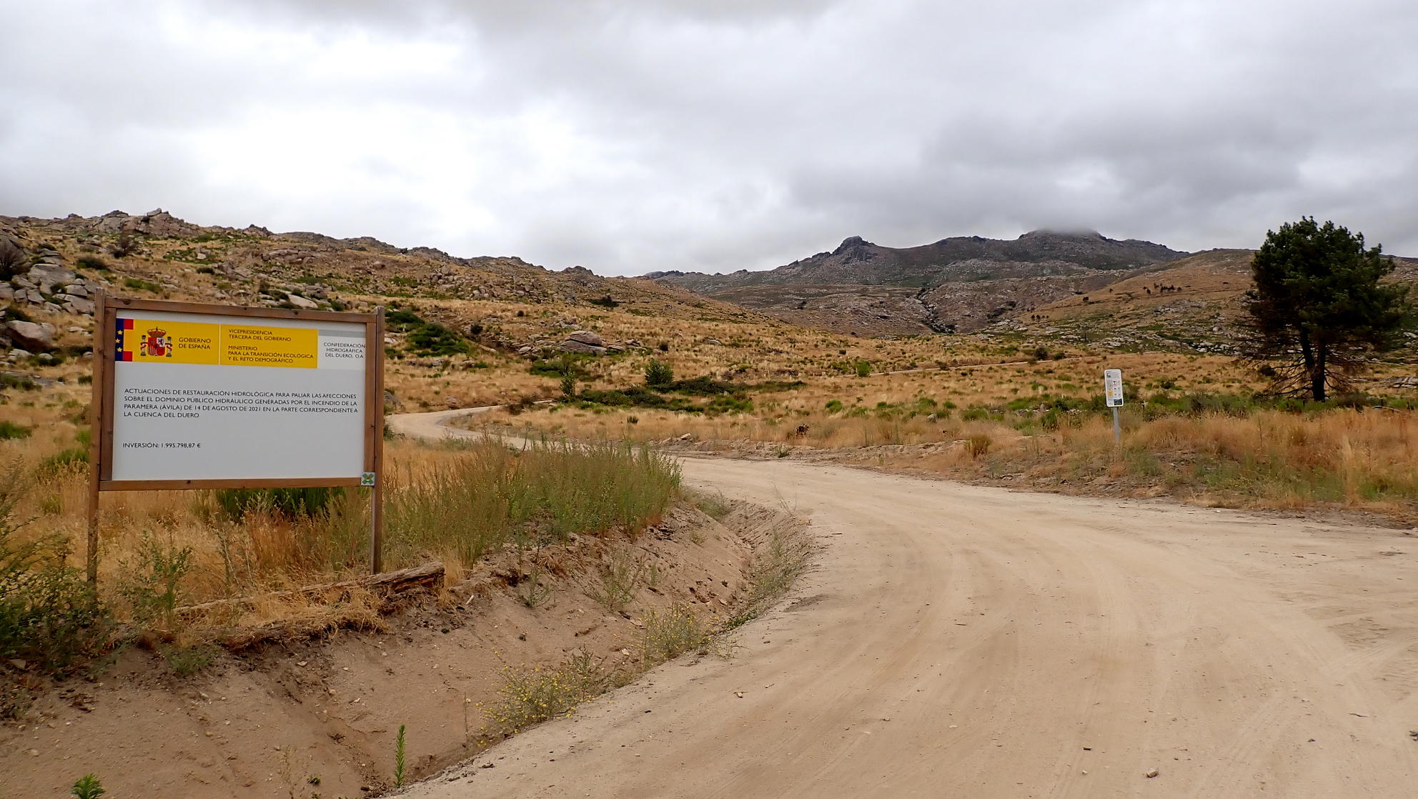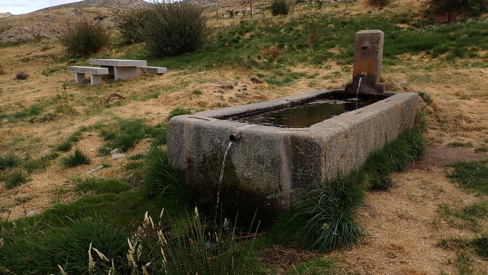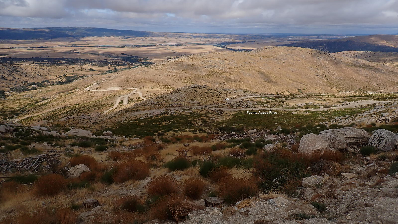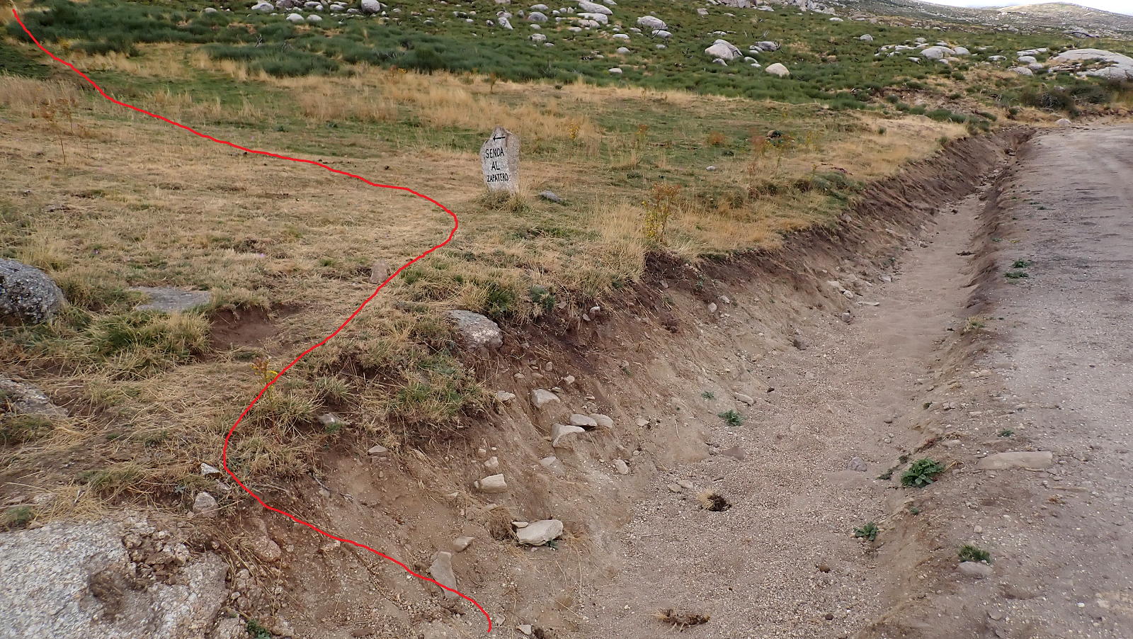 Descripción de la ruta: Fuente de Aguas Frías (1510m). Sigo la pista con amplias curvas que no se pueden atajar. Pasa junto a un depósito de agua (1645m 0h22′) (Fuente de Cabeza de Gallo). La pista hace una curva a la derecha (1670m 0h26′) en el punto donde sale otro ramal hacia la izquierda. Unos metros más allá un cercado con caseta y muros de piedra para ganado. Después se deja la pista, tomando una senda a la izquierda indicada con una losa de piedra donde pone «Senda al Zapatero» (1660m 0h30′).