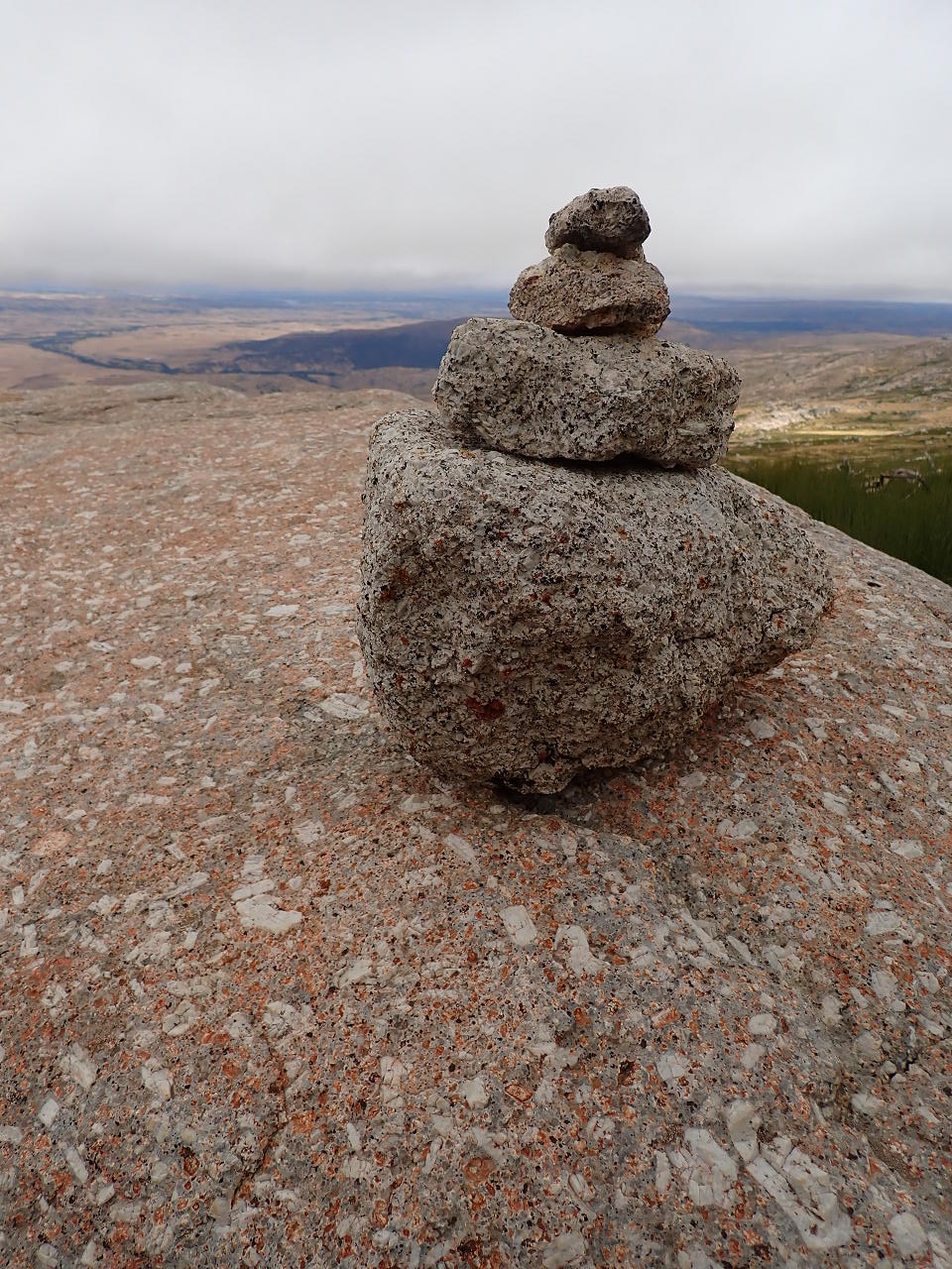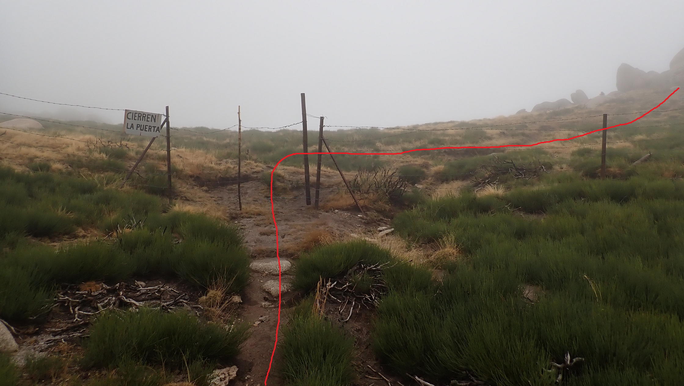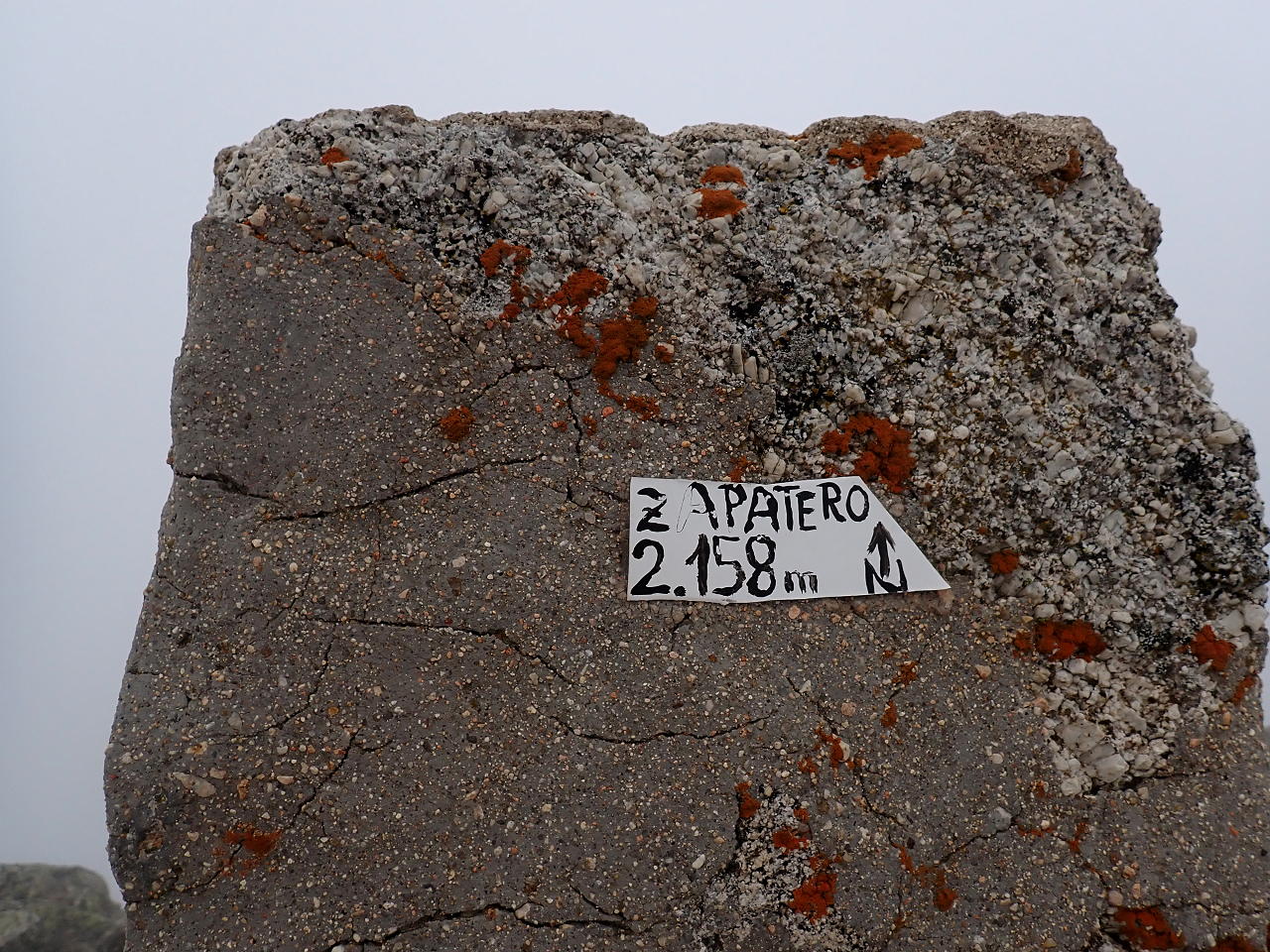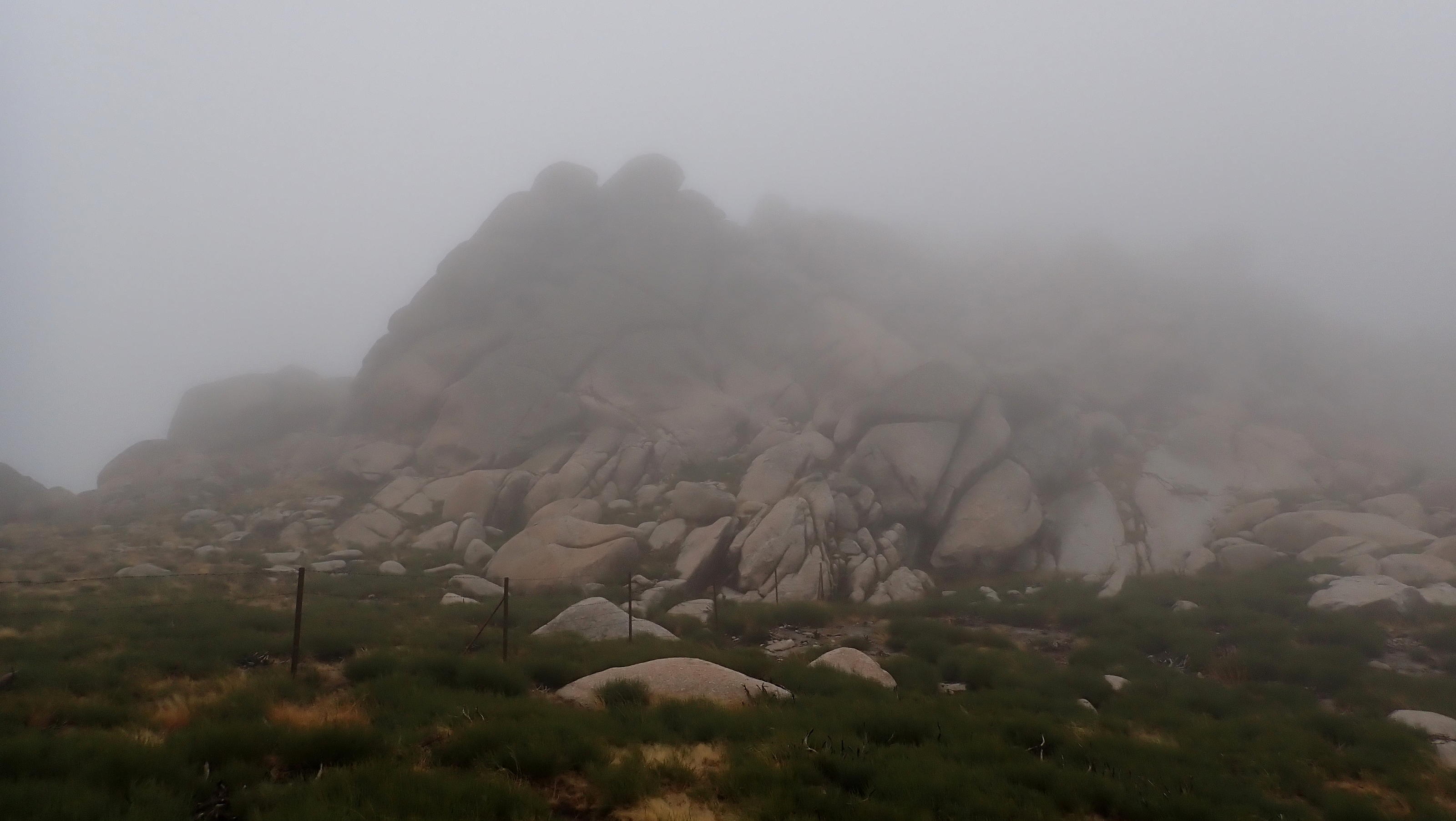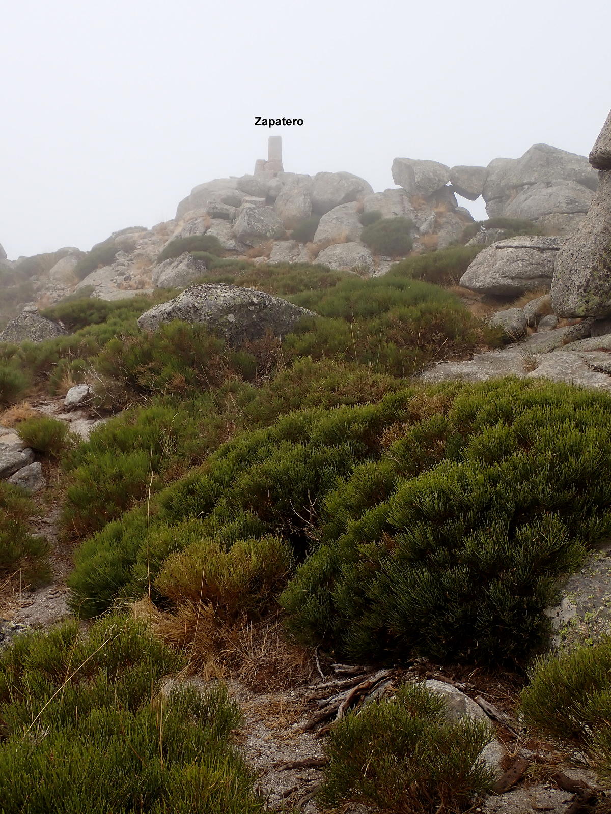 Los primeros metros de senda están difusos, pero enseguida se ve claramente y está jalonada de hitos. La pendiente es moderada pero constante. Se llega a un collado (2019m 1h18′) con valla. Paso al otro lado de la valla y asciendo hacia la derecha (oeste) rodeando por bloques graníticos en los que hay que apoyar las manos para alcanzar el hito cimero (Zapatero 2158m 1h27′). Hay niebla y viento, cero vistas.