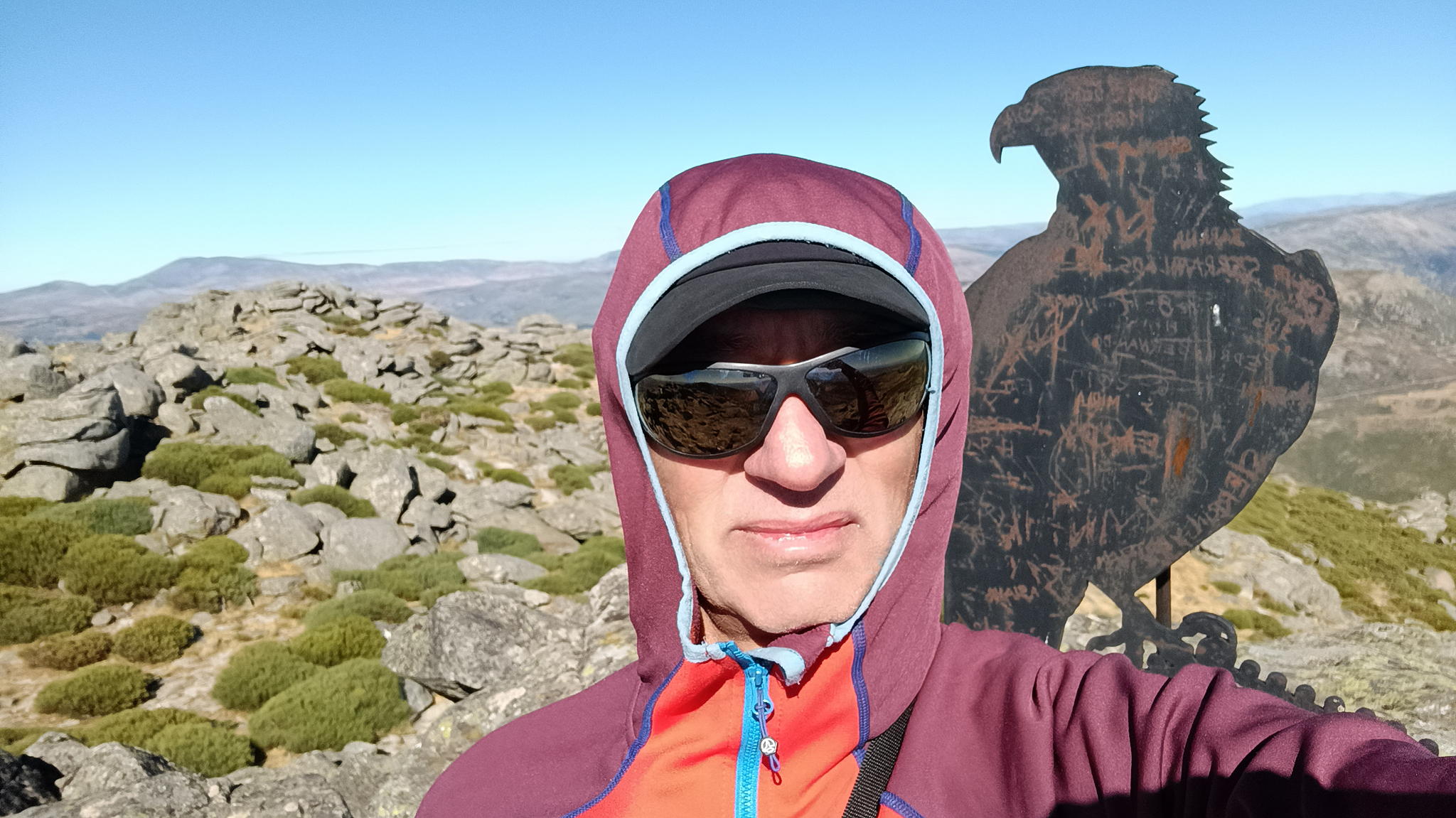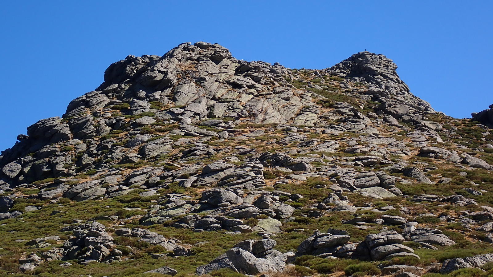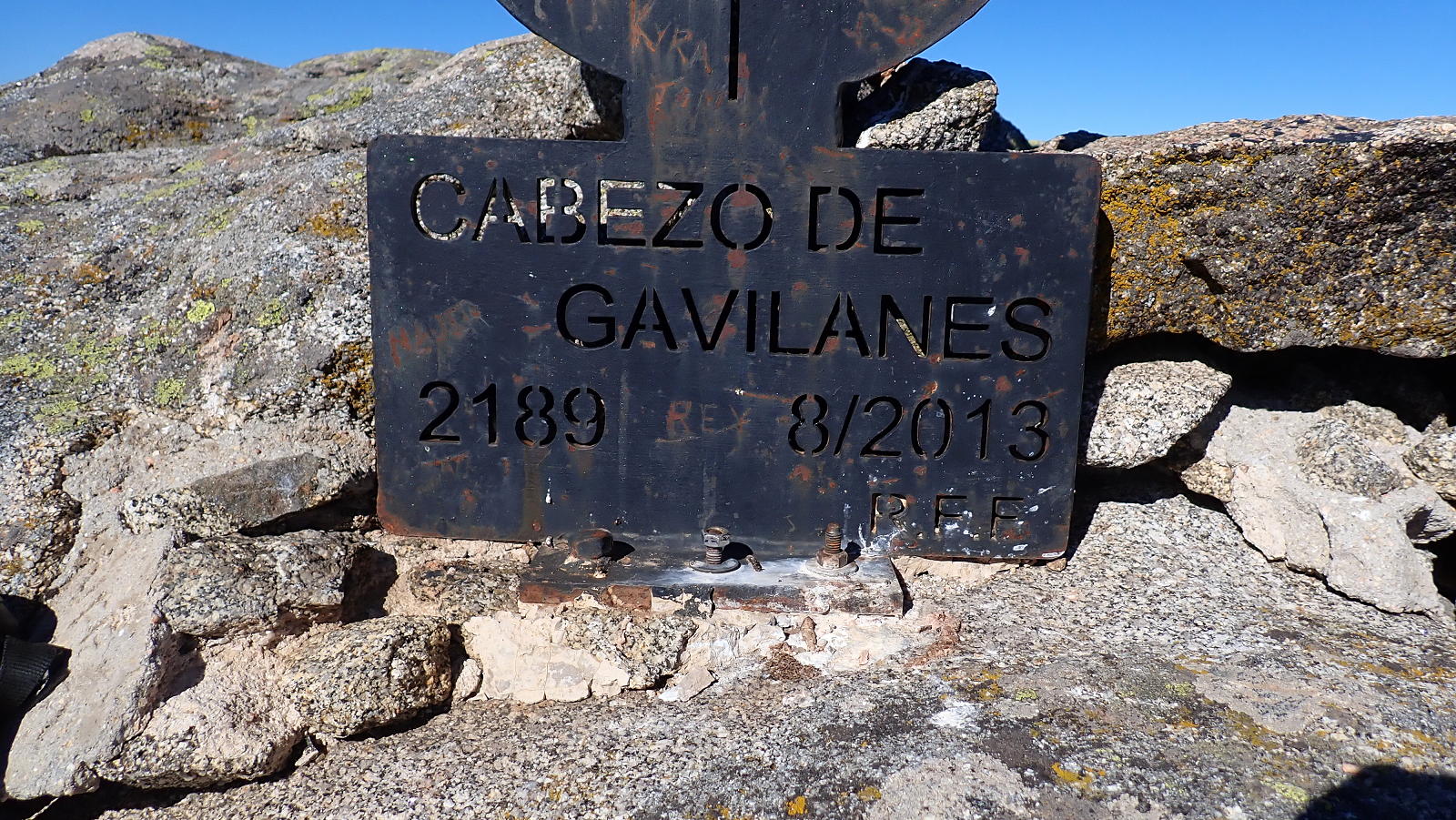 Descenso al collado de los Niños (2137m) y subida al Cerro del Cabezo o Cabezo de los Gavilanes (2191m 3h11′), también con una pequeña trepada, coronado por el gavilán de hierro. Aunque el día está completamente despejado y soleado, un fuerte viento hace que la sensación sea de bastante frío. Hago un intento a la punta norte, que sobresale hacia el valle de Serranillos. Hay un destrepe y luego una trepada por terreno con rocas y vegetación, muy incómodo y abandono el intento.