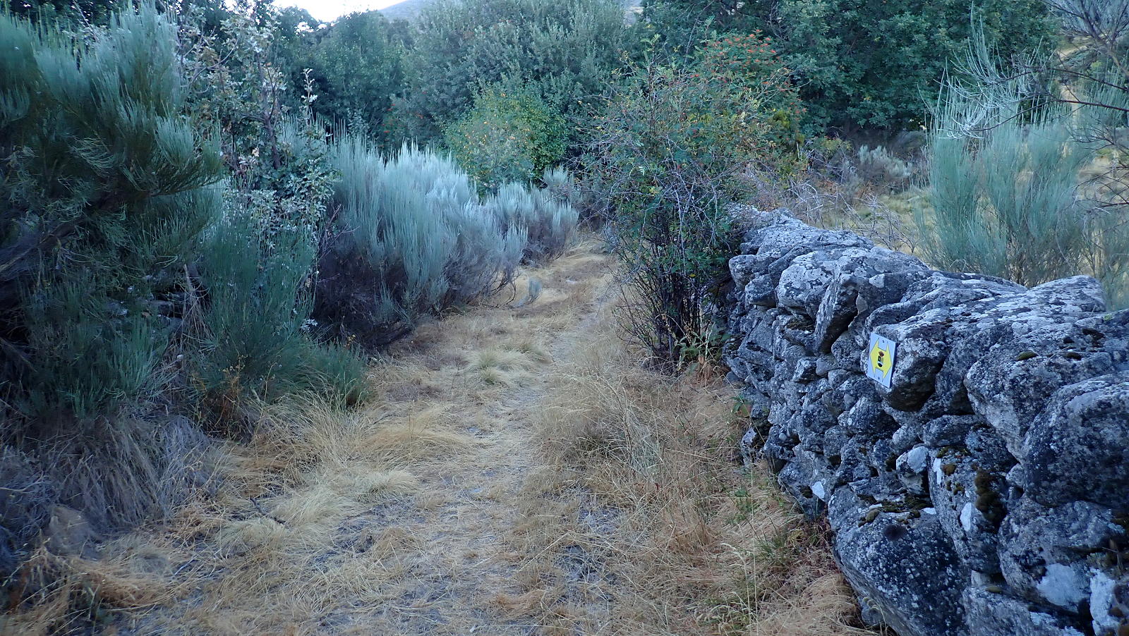 Descripción de la ruta: Serranillos (1225m). Sigo por la carretera en dirección NE (hacia el KM 16) hasta que sale a la derecha una pista cementada con cartel de rutas. Pasa entre huertos, cruza el río Garganta del Cabezo, llego a una bifurcación (1360m 0h24′) que sigo a la derecha. Hay chapas con señalización de diferentes rutas. Continúa un camino ancho que luego se va estrechando en una senda entre muros de piedra y luego, entre altos piornos, se acaba perdiendo.