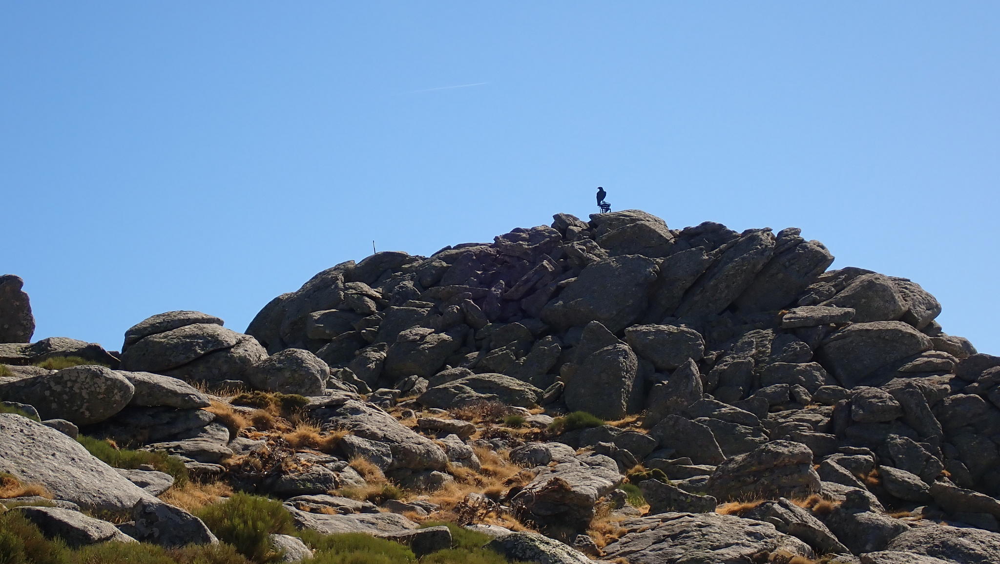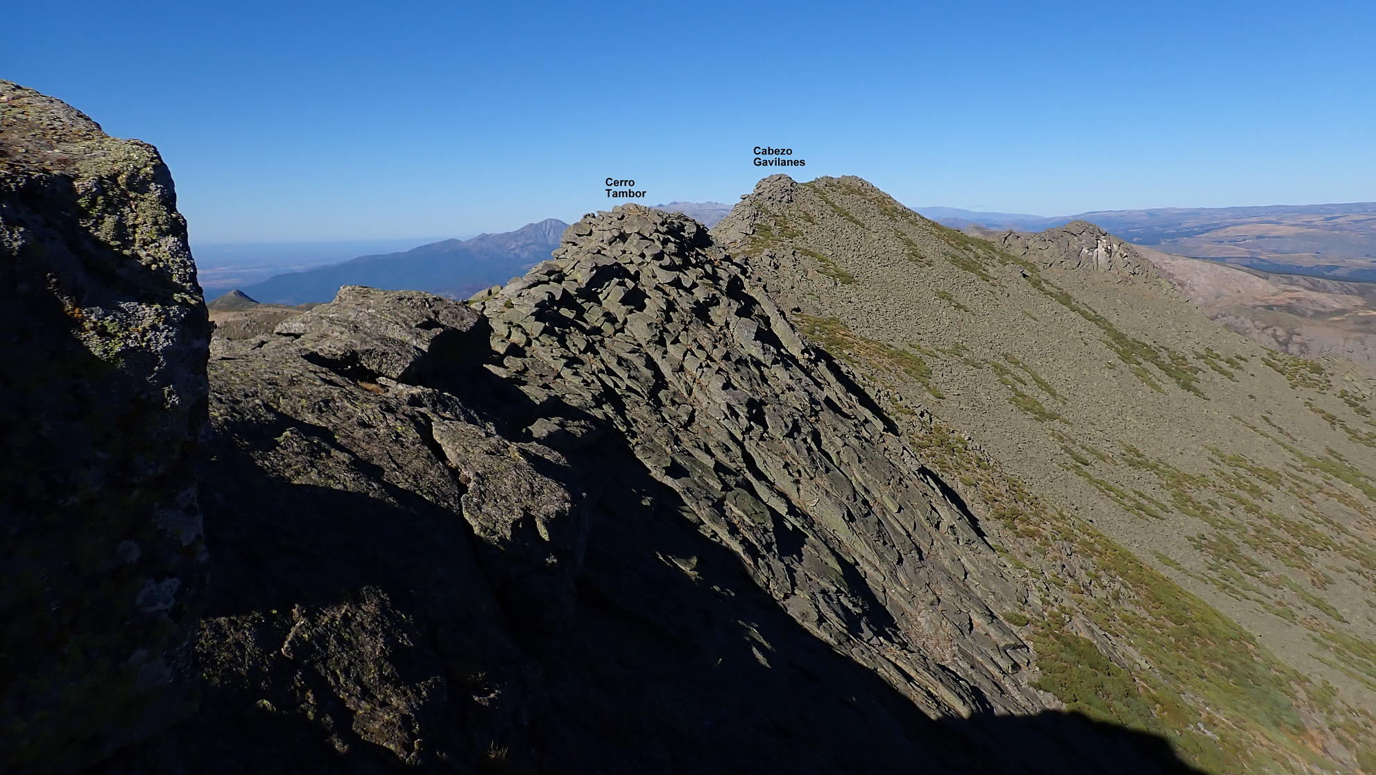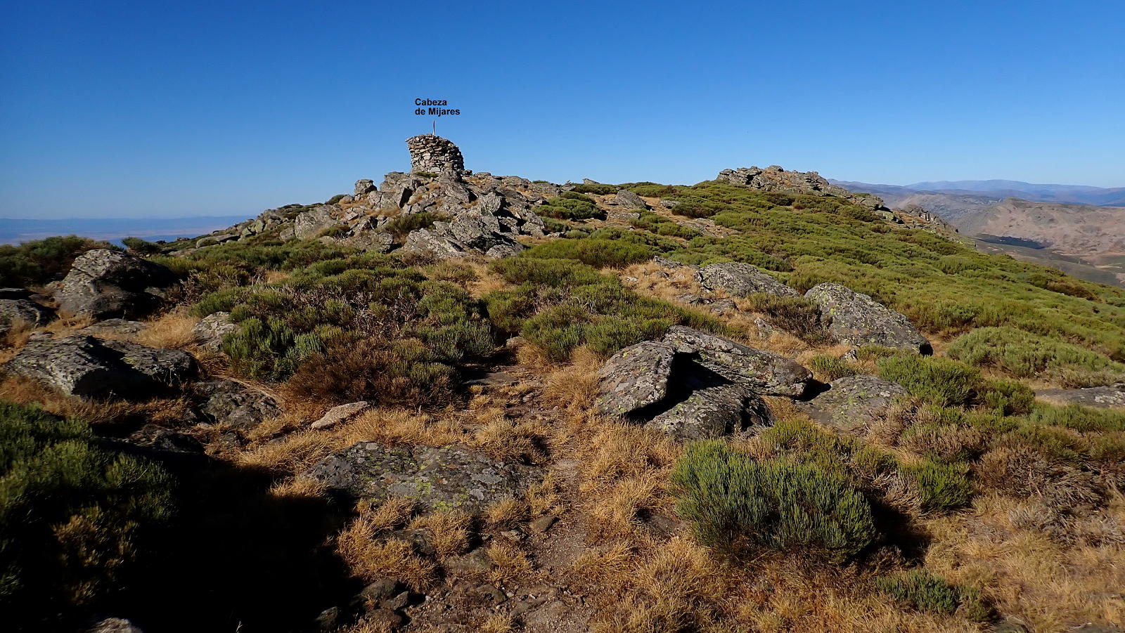 Mi primera intención era dirigirme a la izquierda para subir Cabeza Santa y Cerro de la Peluca, pero en vista de cómo es el terreno cambio de idea y me voy a la derecha (SW) hacia mis objetivos principales. Sigo, por tanto, la cresta. No hay senda pero ya se avanza medianamente bien. Se pasa una cota 2054, el collado de los Pozos (2035m) y se sube el Cabezo Mijares (2187m 2h38′) (Gran hito de piedras con un palo encima). La traza de senda evita por la izquierda el Cerro del Tambor, pero lo subo con una pequeña trepada por bloques graníticos (Cerro del Tambor 2172m 2h51′).