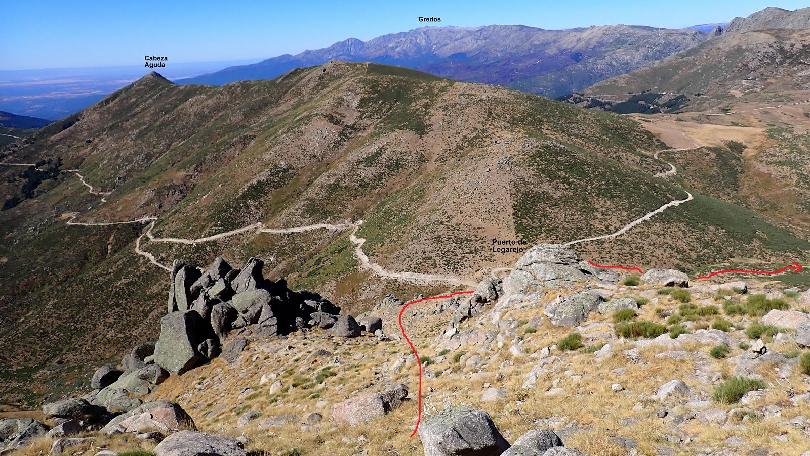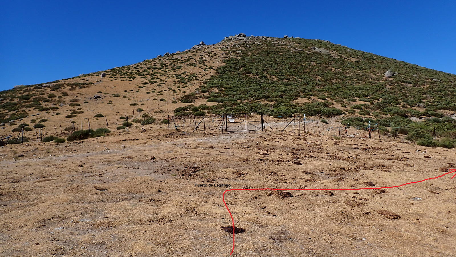 Poco después del Risco de Miravalles se abandona la cresta por una senda que desciende hacia la derecha (oeste). Hay bastantes hitos, en esta bajada muy directa hasta el puerto de Lagarejo (1657m 4h43′). Es un amplio puerto al que llegan varias pistas. Habría que pasar una portilla para acceder a la pista principal, que conduce a la carretera en el puerto de Serranillos (desde el puerto de Serranillos, por tanto, la ruta se simplifica bastante). Sin embargo no cruzo la portilla sino que tomo un camino a la derecha (norte).