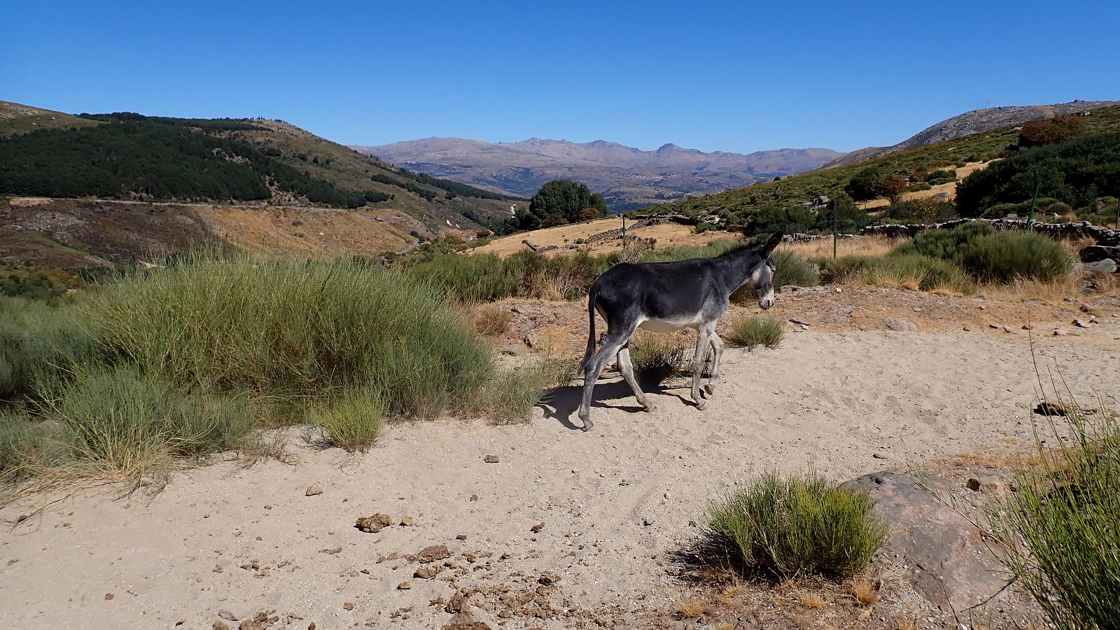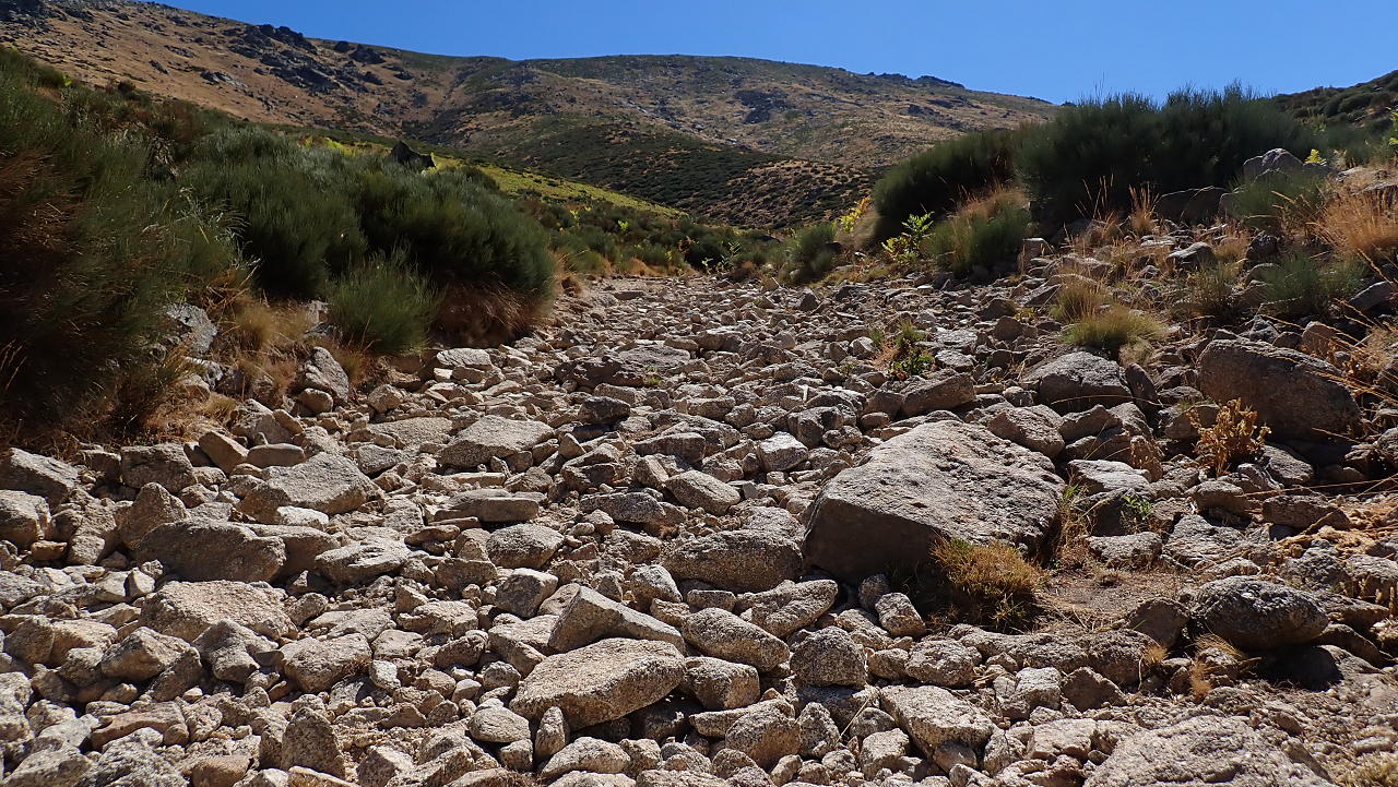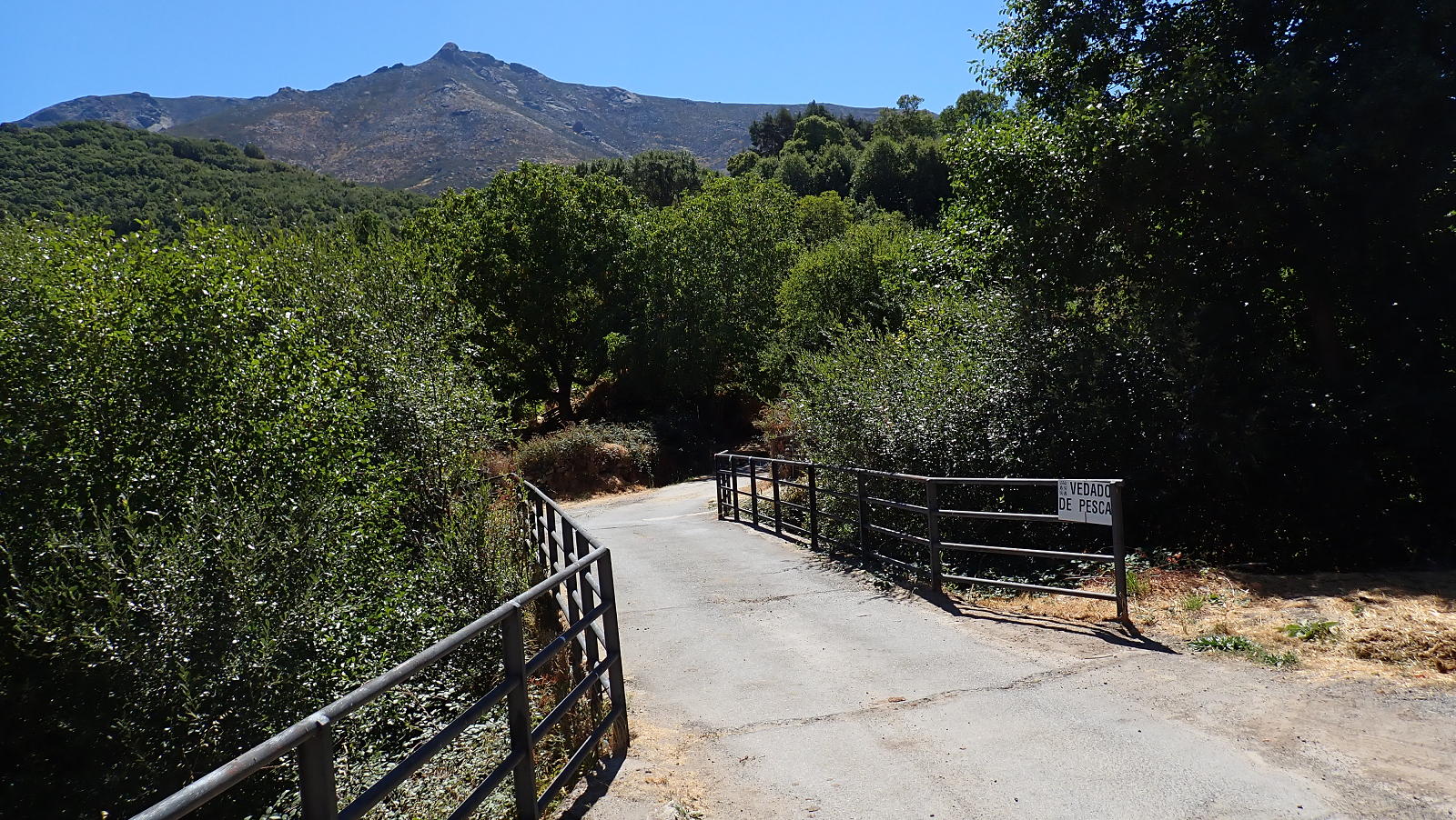 Cunado me parece que ya lo que me queda es muy sencillo, resulta que el camino es sumamente pedregoso e incómodo de andar. El camino se acerca al río Garganta Fernandina, a su orilla derecha. Pasa una portilla (1375m 5h19′), luego una segunda portilla. Después del frío pasado en la cresta, ahora aprieta el calor. Desemboca en la curva de una pista cementada (1250m 5h31′) que tomo hacia la izquierda. Cruzo el río por un puente y salgo a la carretera AV-913, ya en el pueblo, frente al bar El Puerto. Solo tengo que seguir la carretera hasta el aparcamiento (Serranillos 1225m 5h40′)
