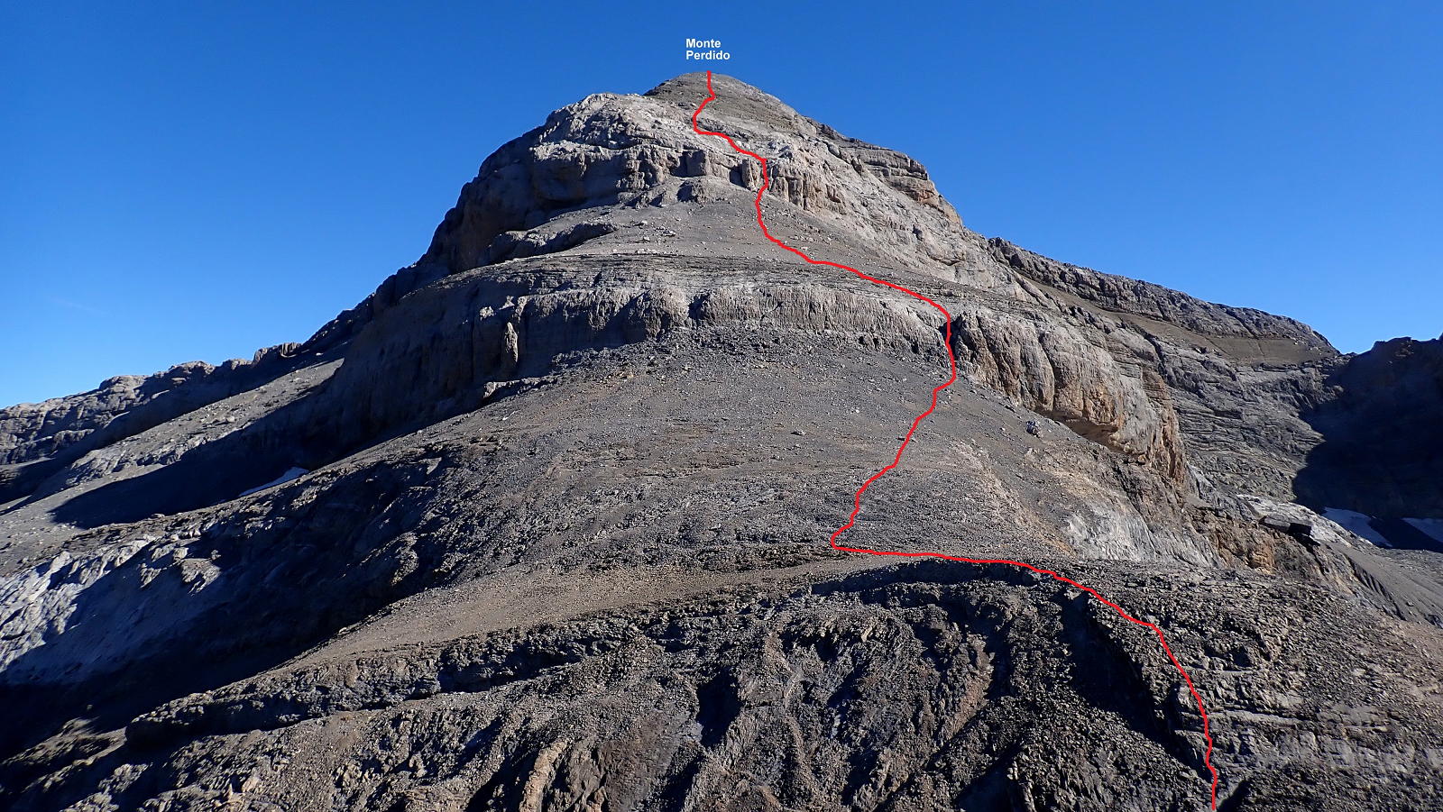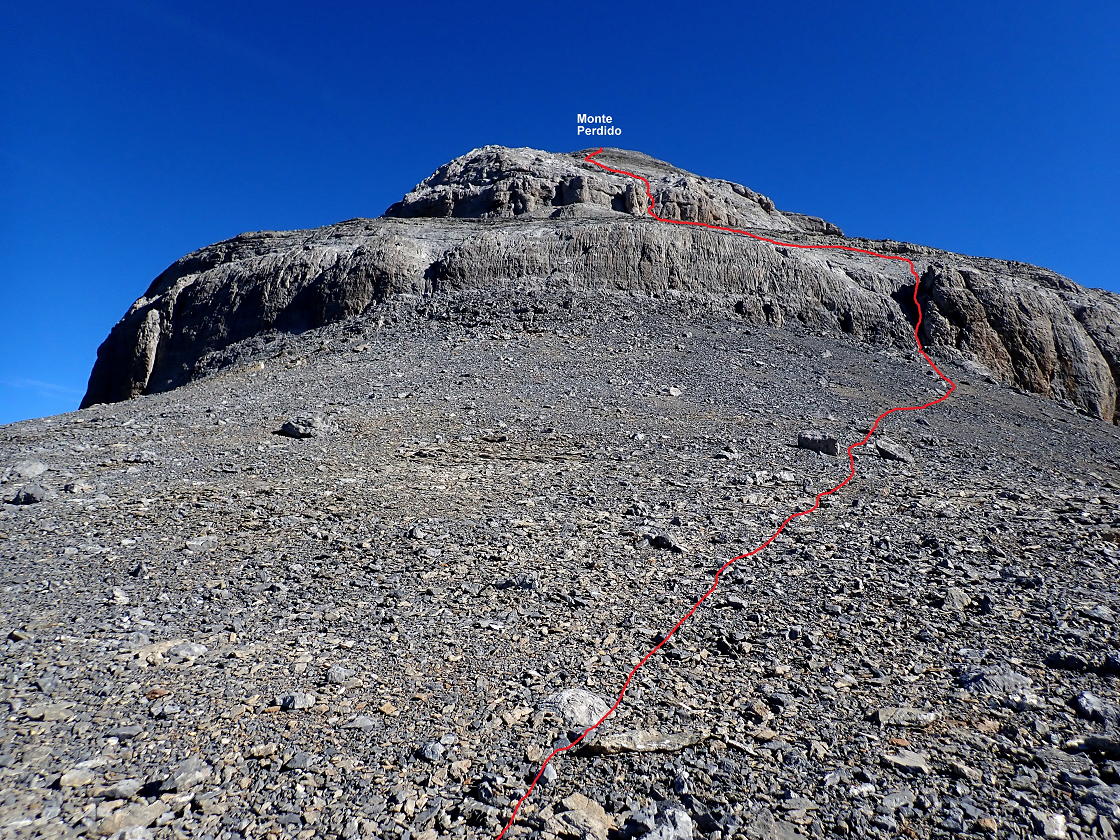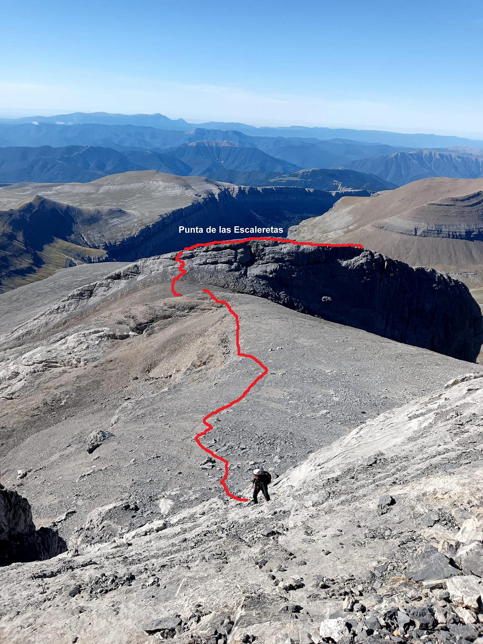 Seguimos las indicaciones de los carteles hacia Monte Perdido. Una senda asciende decididamente hacia el este y luego al norte. Al bordear un resalte que queda a nuestra derecha, se abre, a la derecha también, una canal pedregosa que sube a un falso collado. En este punto dejamos la ruta normal y nos desviamos por la canal pedregosa (2510m 3h27′) ya que es la ruta que nos llevará a las Escaleretas. Tras el falso collado se abren amplias laderas de piedras. Tenemos que seguir dirección ENE. Se supera un resalte rocoso, luego otro que hay que trepar por una fisura y finalmente una chimenea. En todos estos puntos los hitos ayudan a encontrar el paso correcto. Después queda la pedrera y rodear por la izquierda para acceder al lomo de la Punta de las Escaleretas por el oeste (3021m 4h32′).