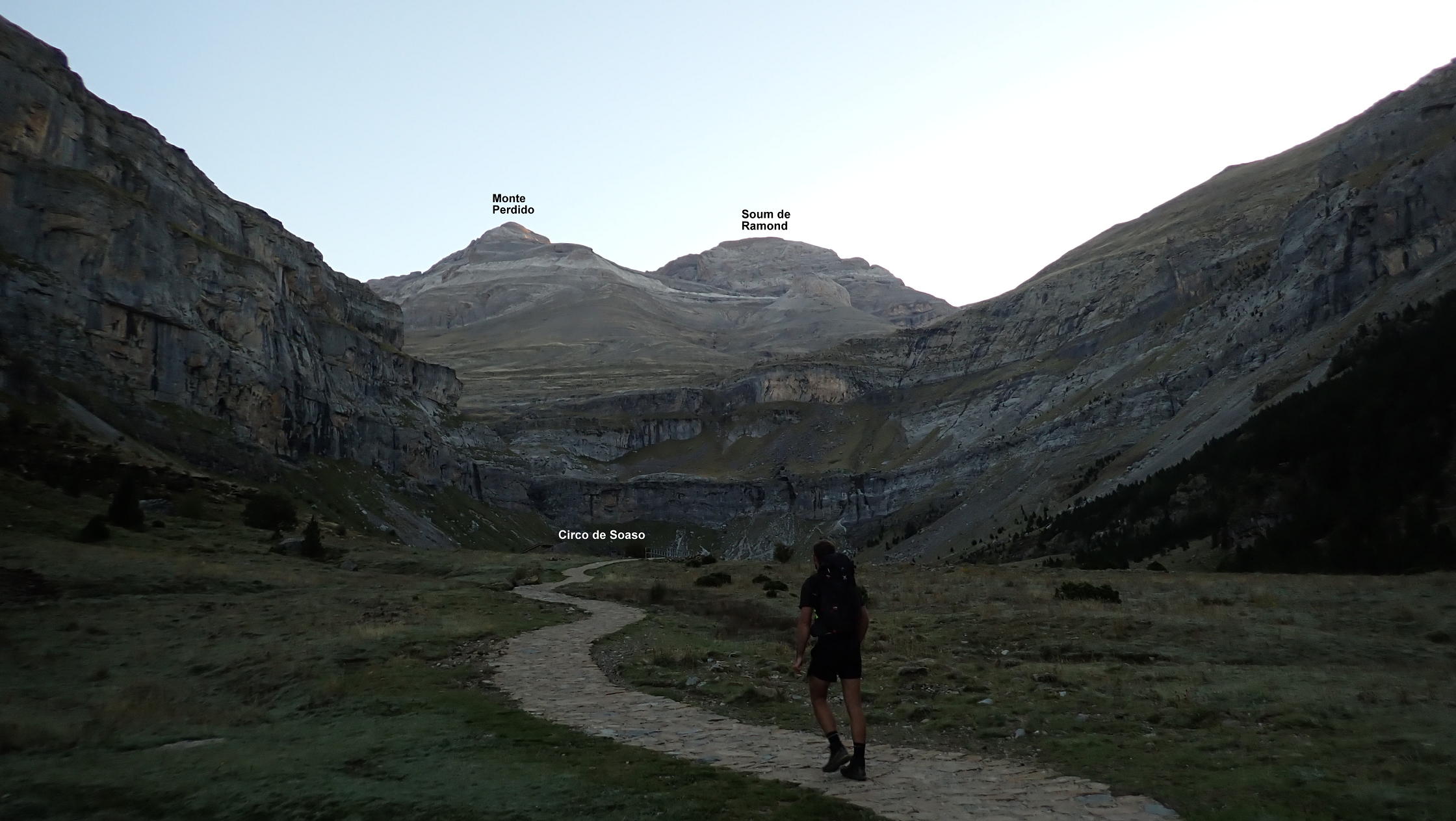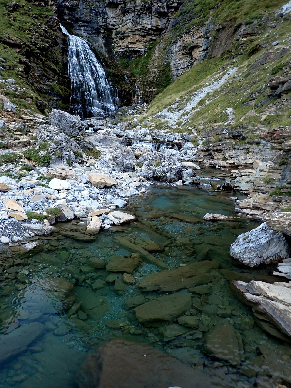 Descripción de la ruta: Pradera de Ordesa (1325m). Partimos de noche, con nuestros frontales. Sabemos que el camino no tiene ninguna dificultad y avanzamos rápidos por el fondo del valle de Ordesa, entre el bosque de hayas, con el río Arazas a nuestra derecha, sin asomarnos a las preciosas cascadas que se forman en los estrechamientos del cauce. Empieza a haber luz cuando llegamos a los saltos de agua de las Gradas de Soaso. El valle se ensancha para cerrarse por las paredes del circo de Soaso, donde cae la cascada Cola de Caballo (1760m 1h47′), que a estas horas está desierta.