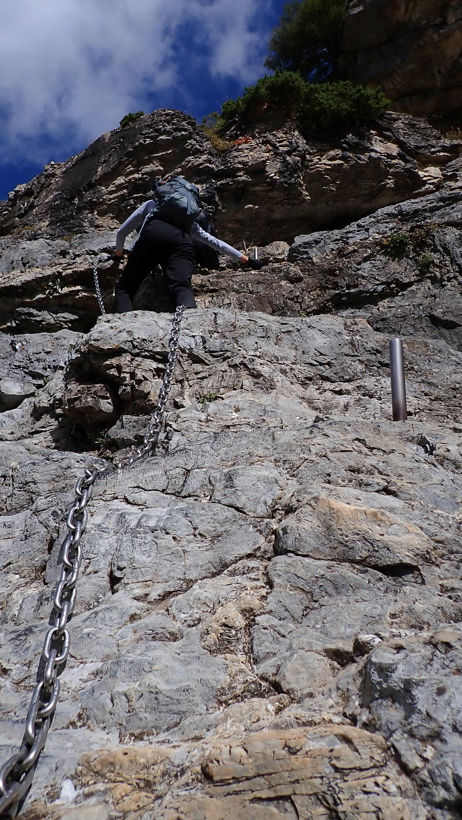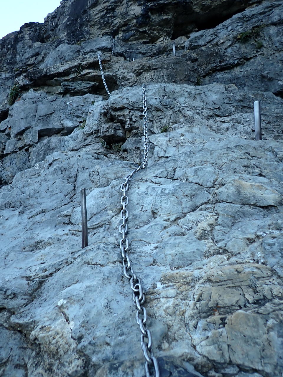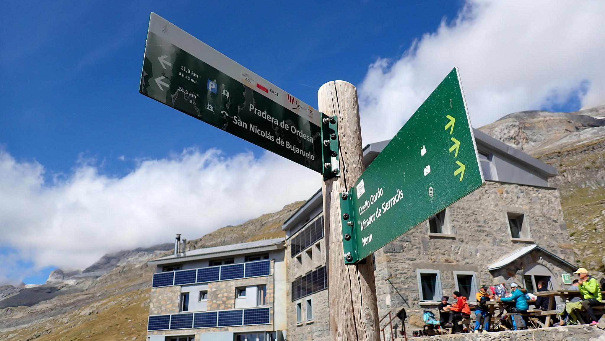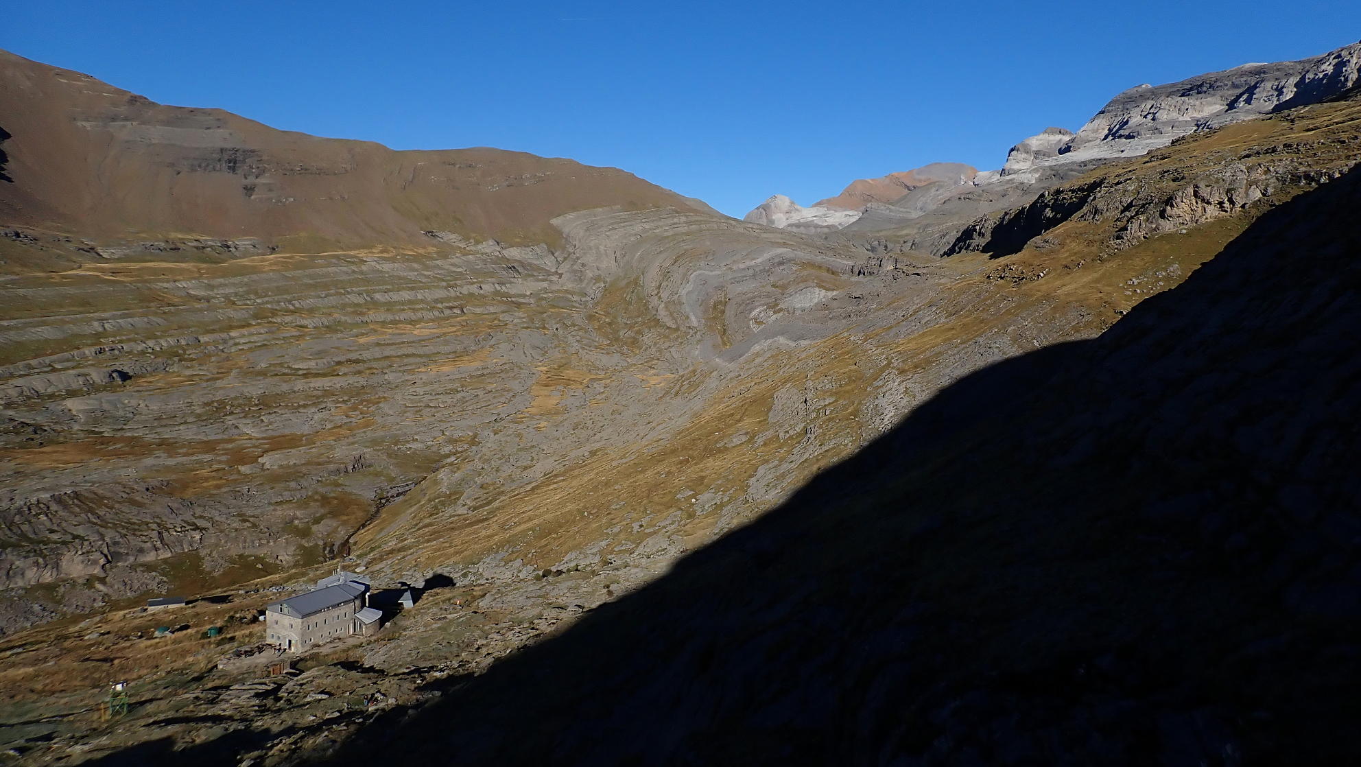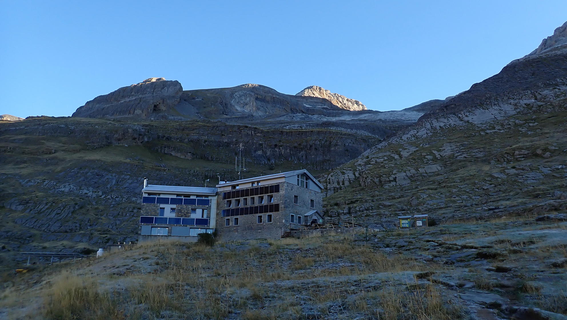Para superar las paredes del circo hay una senda que da una amplia vuelta primero hacia el sur y luego hacia el norte, pero optamos por la vía más rápida de las clavijas, que asciende de forma directa por la pared con ayuda de una serie de cadenas y clavos. Superada esta dificultad el camino se allana y asciende suavemente al refugio de Góriz (2195m 2h41′). Hasta el refugio hemos seguido las marcas rojas y blancas del GR-11.