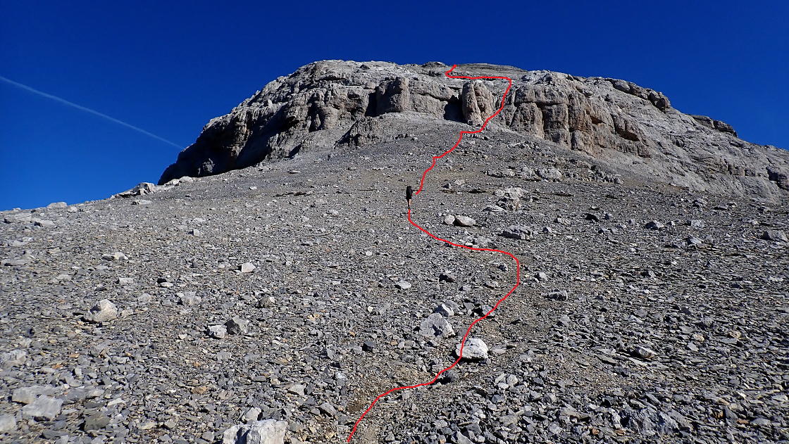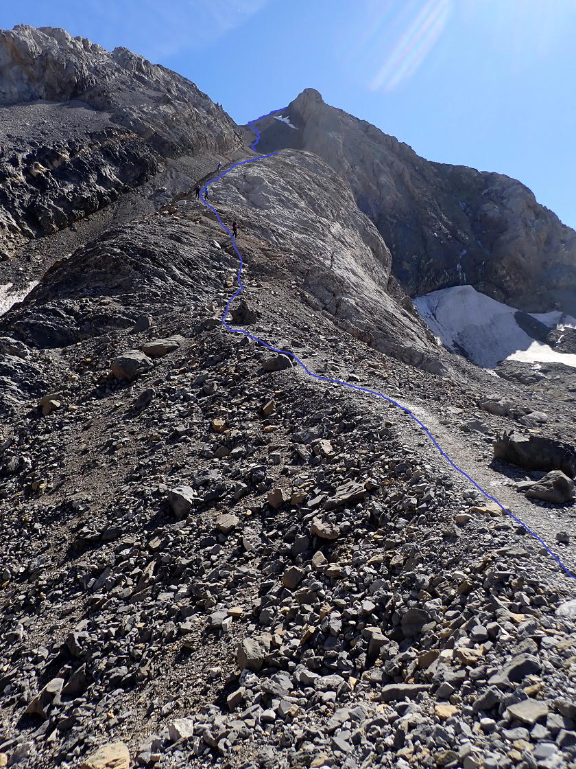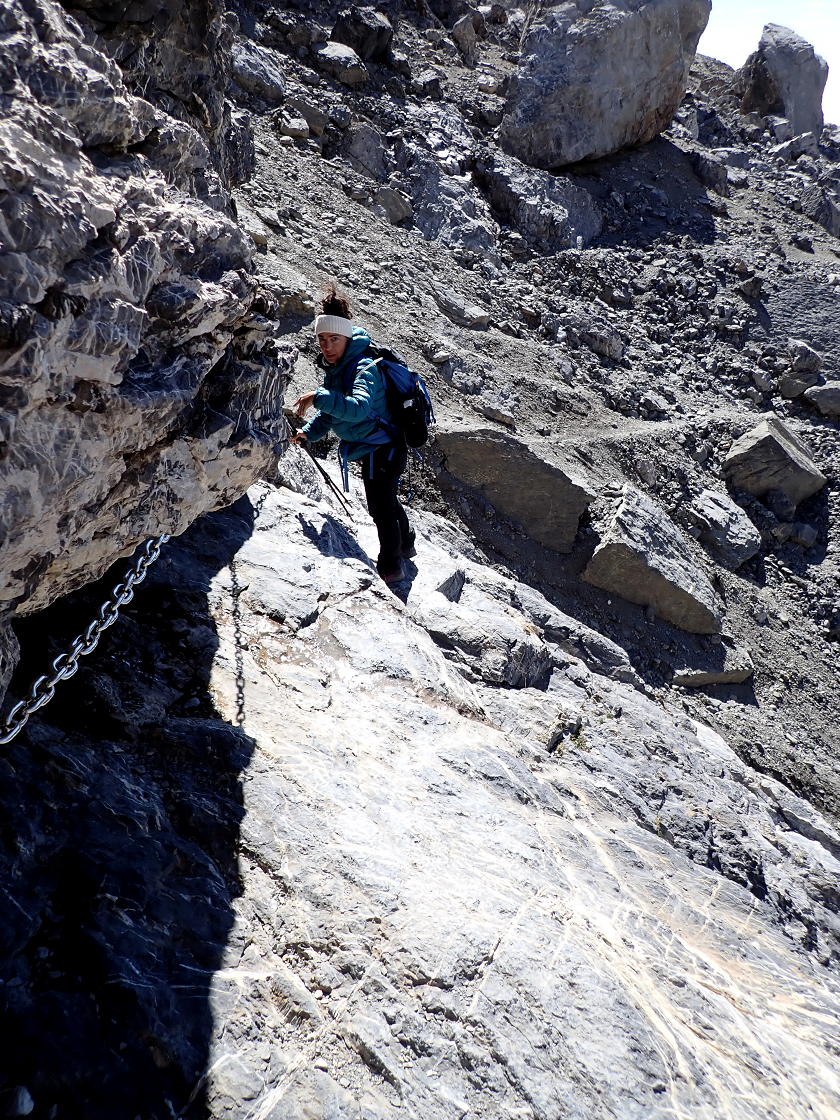 Desde aquí se ve bastante bien lo que nos queda por delante, que amedrenta un poco, así que paso a paso iremos solventando las dificultades. Primero continuamos por el lomo de la Punta Escaleretas hacia el este para descender al collado 2991m. Nos espera una gran ladera pedregosa con fuerte pendiente y un par de resaltes rocosos. En la ladera hay huella de paso, no es muy incómoda, pero se va notando el esfuerzo y la altitud. Los resaltes rocosos se superan trepando por chimeneas catalogadas como II+/IIIº.