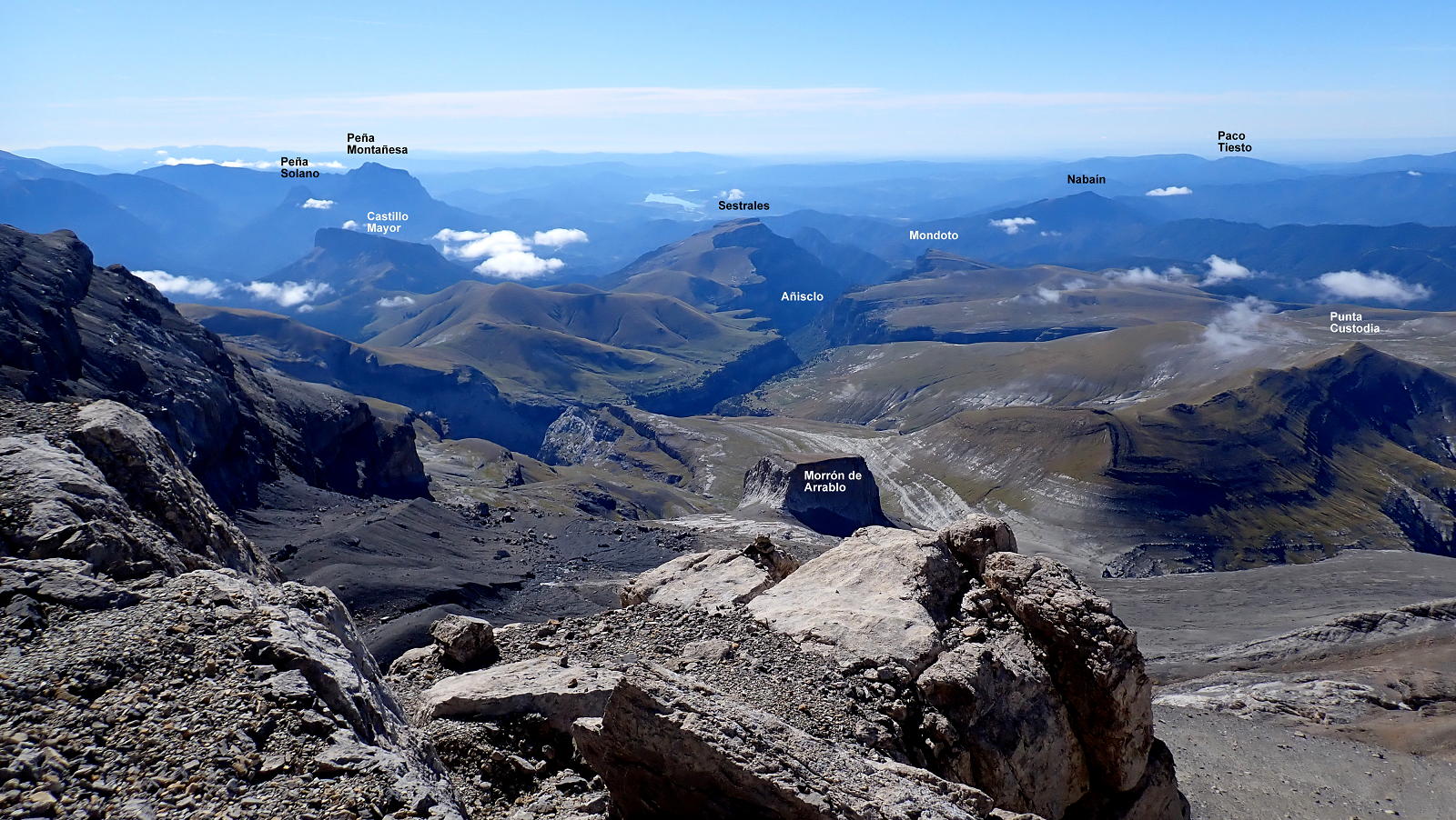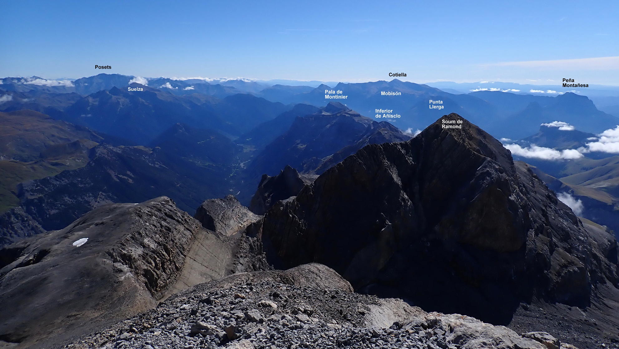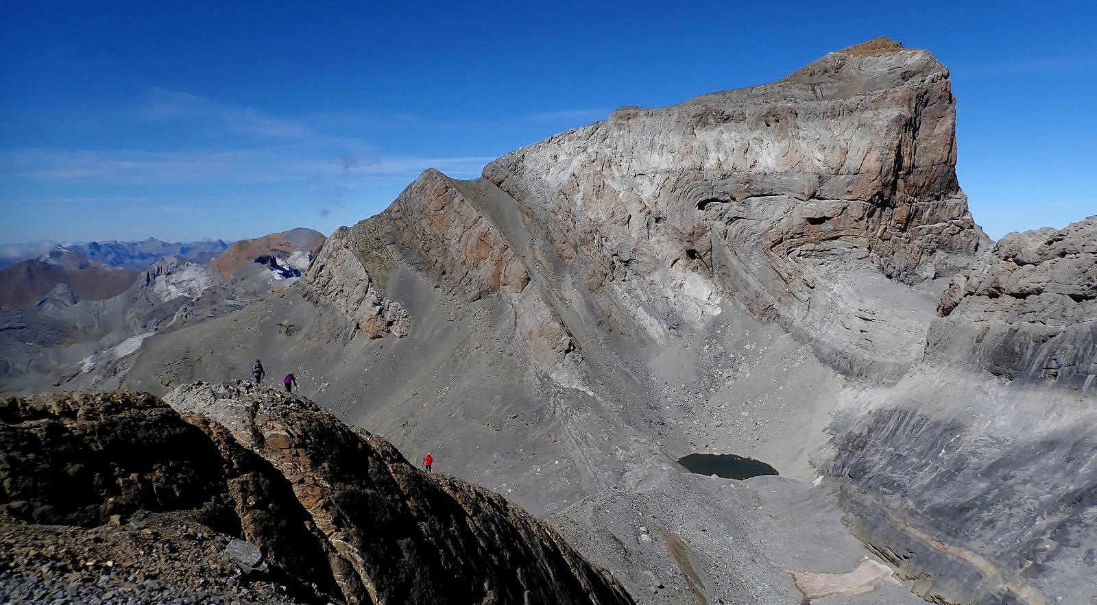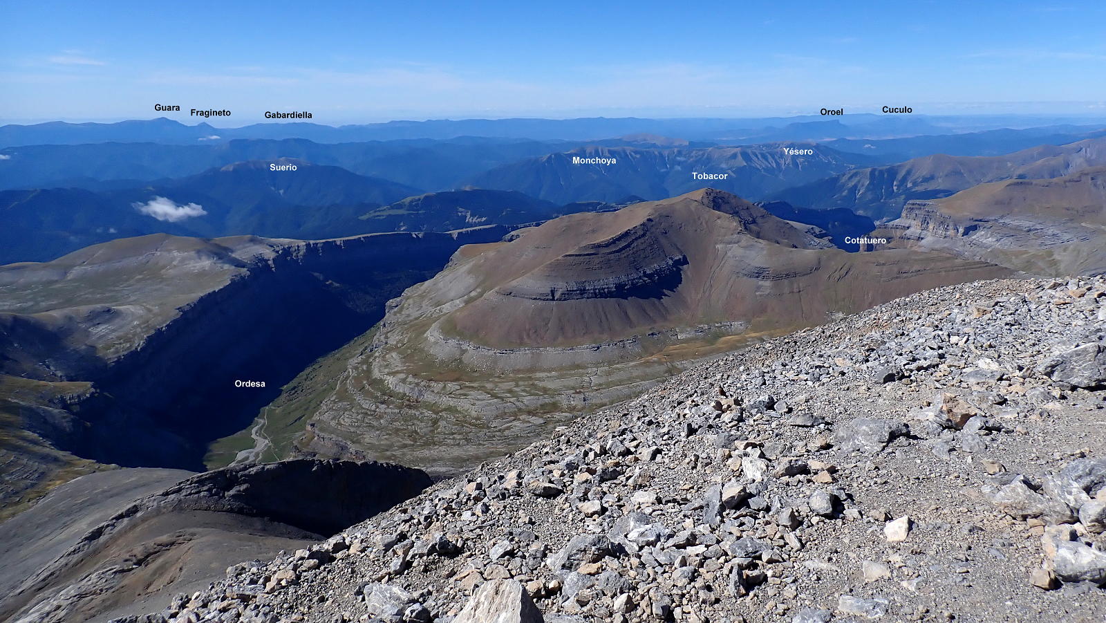 La ascensión no es apta para senderistas no acostumbrados a terrenos escarpados. La ruta normal por la Escupidera (que nosotros seguimos en el descenso) es dura e incómoda, y peligrosa en invierno. La ruta de las Escaleretas (nuestra ruta de subida) exige superar varios zócalos rocosos técnicos y expuestos. La vista desde la cima es, probablemente, una de las más espectaculares del Pirineo, con los valles de Ordesa, Añisclo y Pineta a nuestros pies.