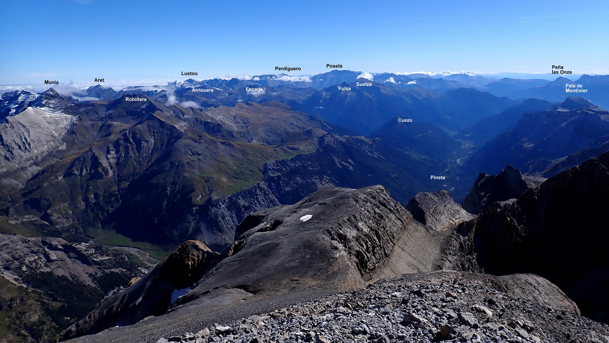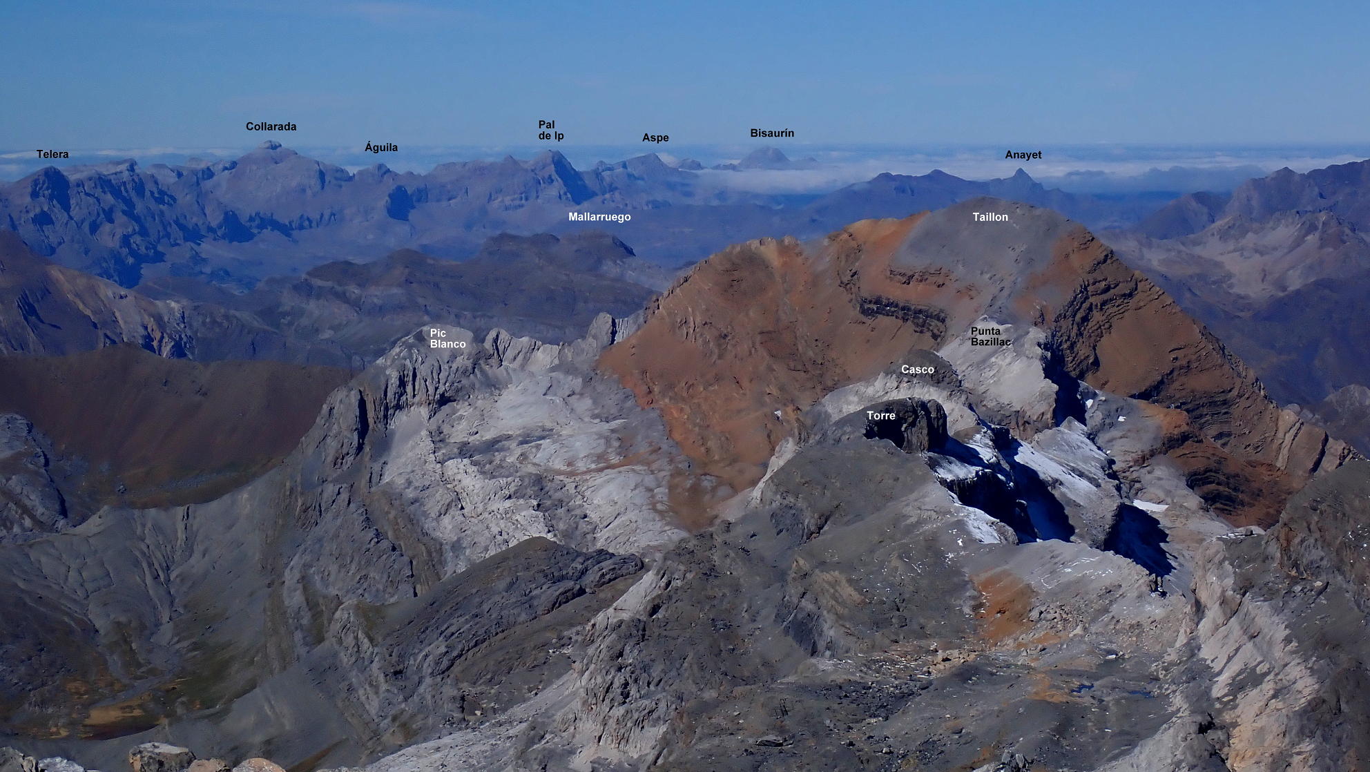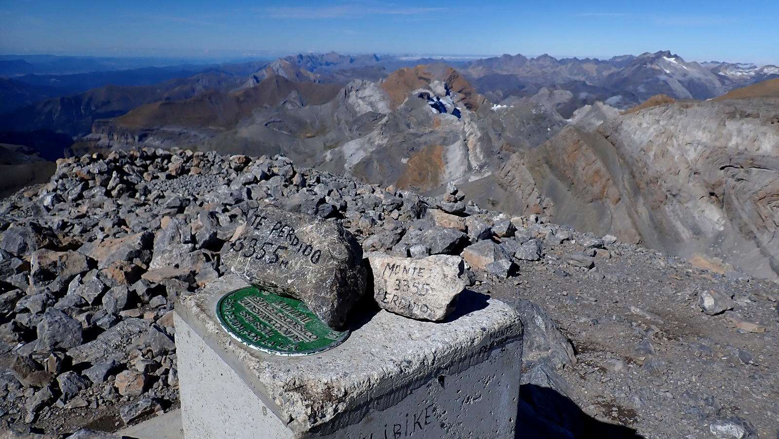 Los últimos metros ya son sencillos, pero noto que avanzo más despacio de lo habitual. Concentrado en el esfuerzo llego al fin a la cima de Monte Perdido (3355m 5h30′). No es una cima solitaria, pero es amplia y tampoco es que esté abarrotada. El cielo está despejado y las vistas son fabulosas. Hace frío, pero se puede estar un rato identificando las cimas a nuestro alrededor.