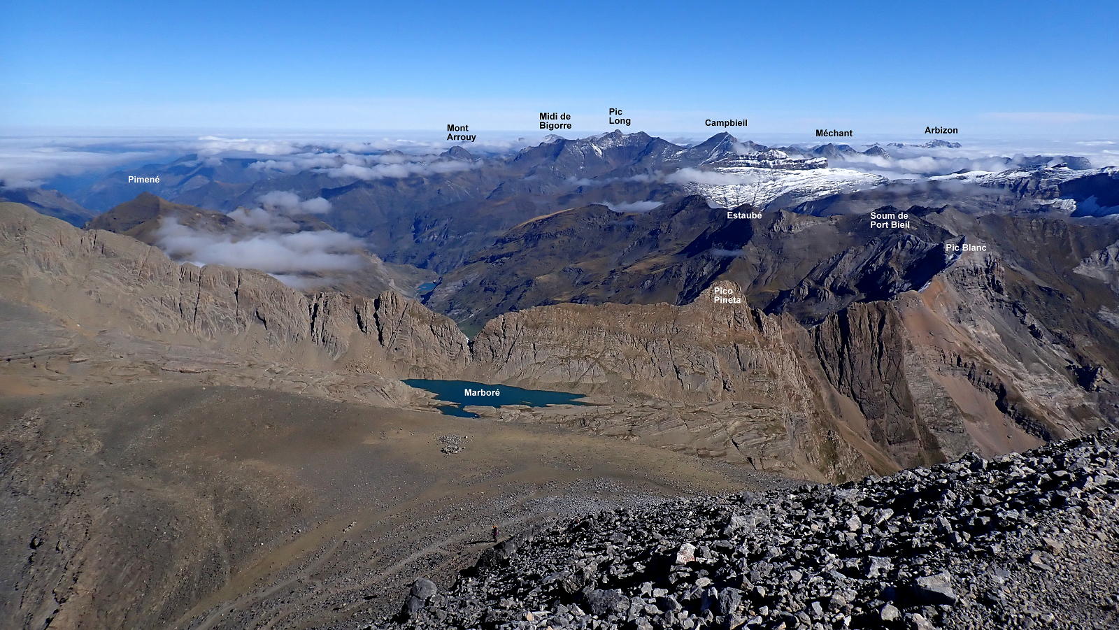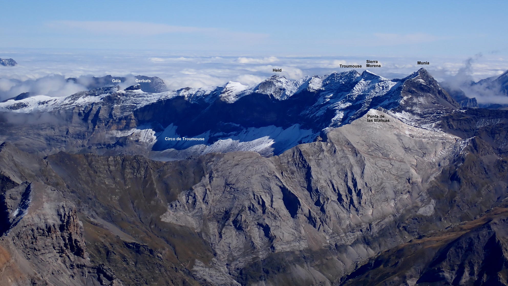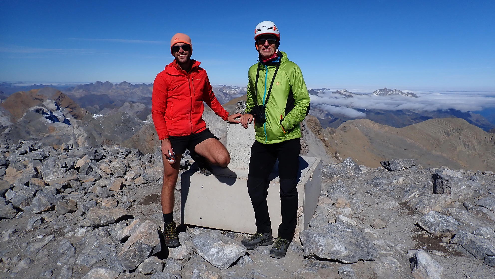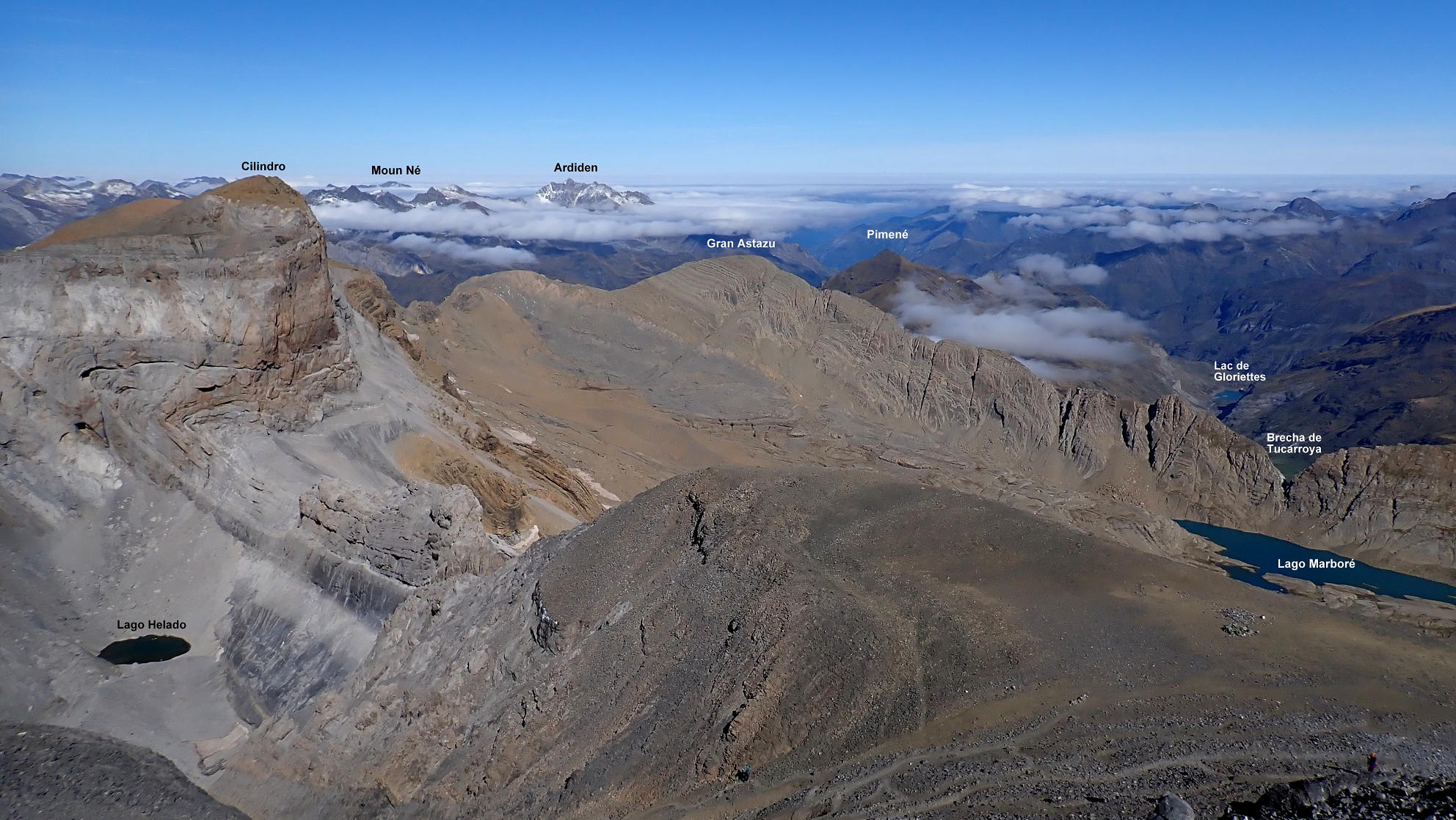 Los últimos metros ya son sencillos, pero noto que avanzo más despacio de lo habitual. Concentrado en el esfuerzo llego al fin a la cima de Monte Perdido (3355m 5h30′). No es una cima solitaria, pero es amplia y tampoco es que esté abarrotada. El cielo está despejado y las vistas son fabulosas. Hace frío, pero se puede estar un rato identificando las cimas a nuestro alrededor.