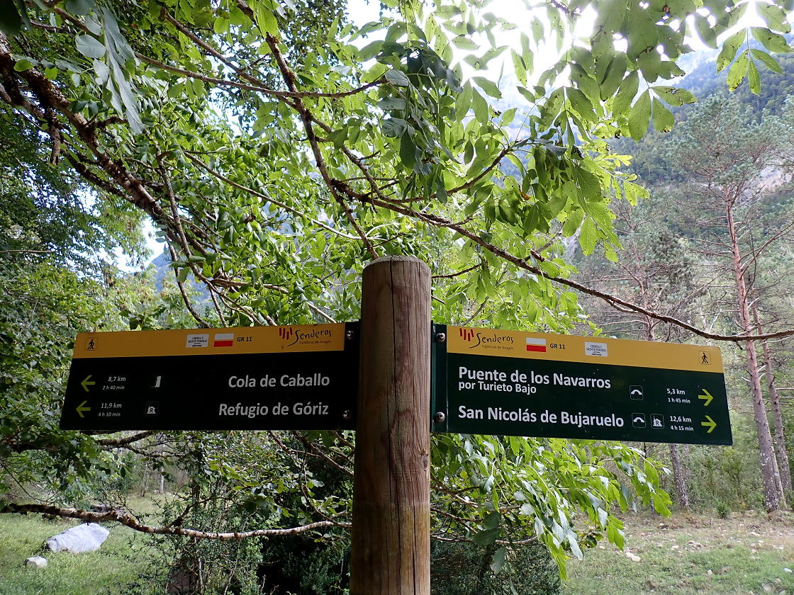 Continúo el descenso hacia las clavijas de Soaso (ahora tengo que hacer alguna parada para dejar paso a quienes suben) y, llegando la cascada, me alcanza Martín tras su ascensión al Cilindro de Marboré. En la Cola de Caballo (1760m 8h20′) hay bastante gente. La mayoría de los visitantes hacen la ruta de la Pradera a la Cola de Caballo y vuelta (que aunque no llega a 500m de desnivel, son 18km ida y vuelta). Los 9km que nos quedan, a pesar de discurrir por sombríos hayedos, se nos hacen largos hasta llegar a la ansiada Pradera (1325m 10h09′).