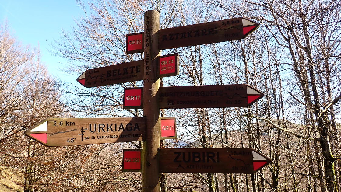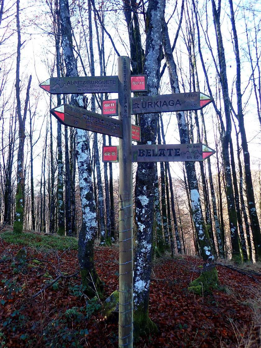 Descripción de la ruta: Puerto de Urkiaga (912m). Tomamos la pista que sale hacia el este, pero enseguida nos desviamos a la izquierda por una senda que pasa junto a restos de búnkeres que se construyeron tras la guerra civil con el fin de defender el Pirineo de una posible ofensiva desde Francia. El camino está jalonada de maracas rojas y blancas del GR-11.