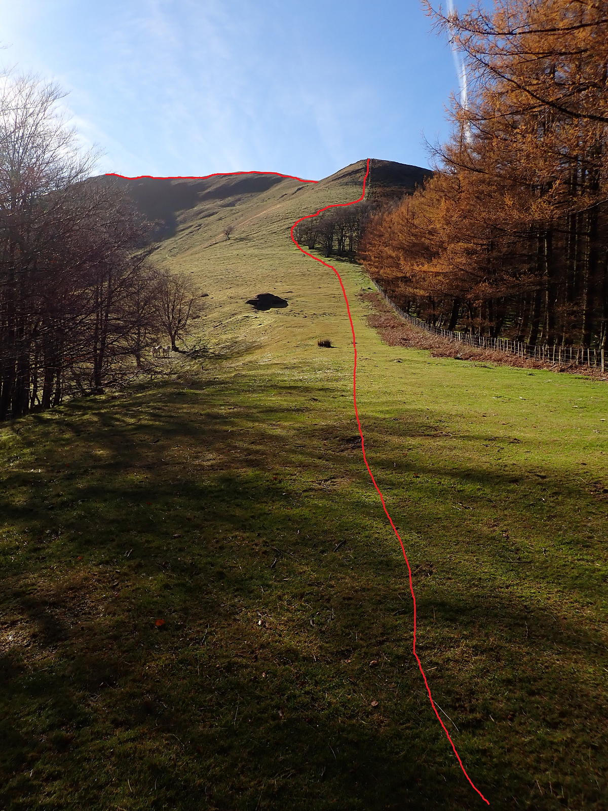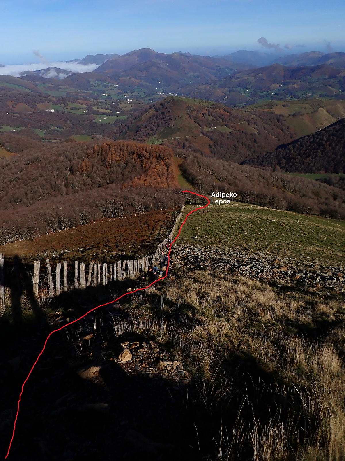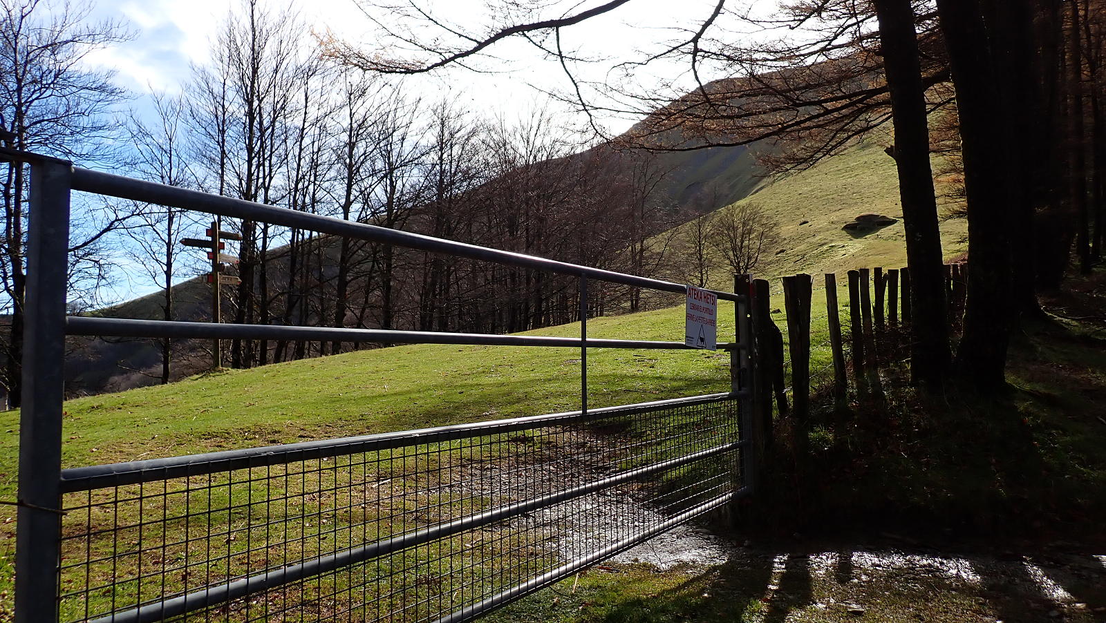 Alcanzamos otra vez la pista (1005m 0h14′) llamada «Camino a Zubeti» y la seguimos aún por hayedo. En algunos árboles hay puestos de caza y en los taludes de nuestra izquierda túneles de las líneas defensivas. La pista sigue a la derecha (1095m) y nosotros el GR un poco a la izquierda, camino del collado norte del Adi (1185m 1h00′), al que se accede traspasando una portilla y pasando ya a terreno abierto de pasto.
