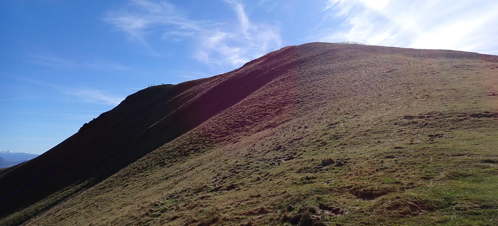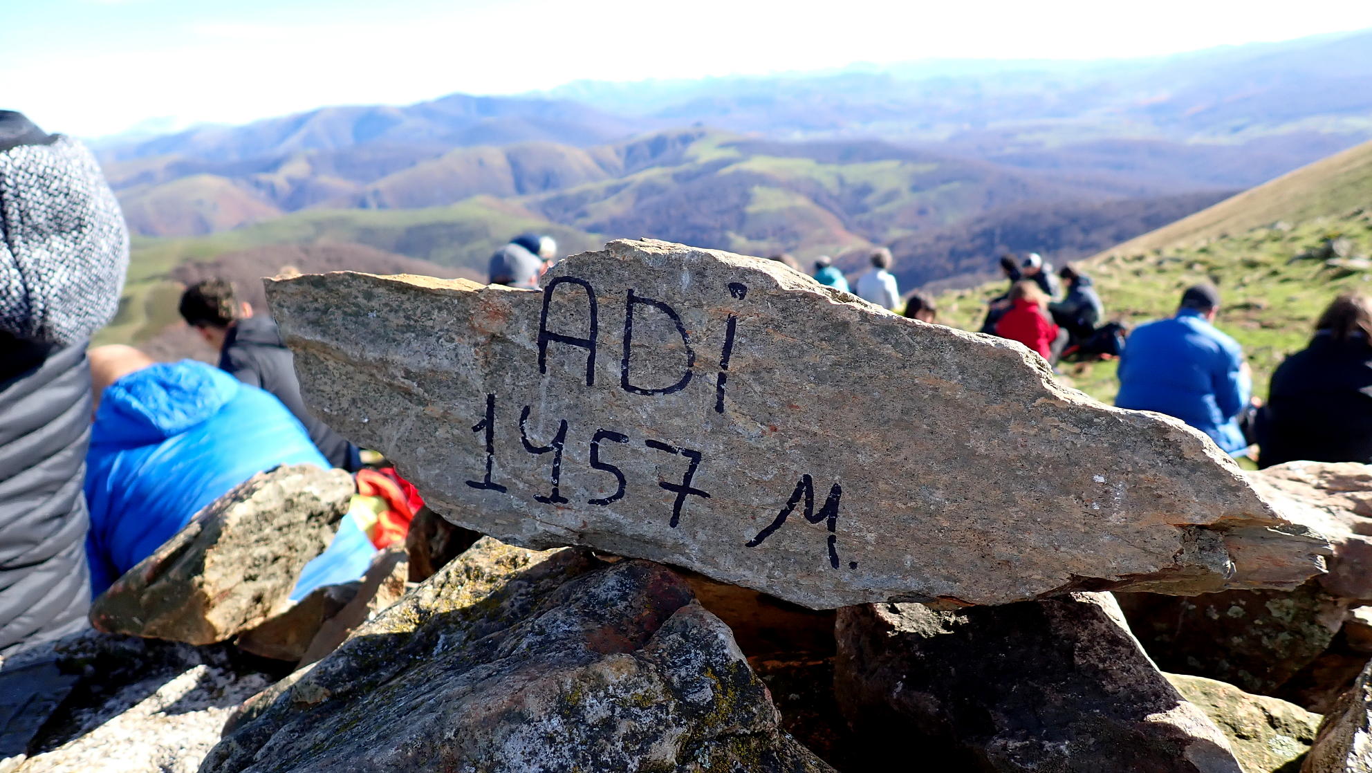 Ahora es cuestión de seguir hacia el sur por la línea de máxima pendiente con traza de senda y paso lento y con la valla a nuestra derecha. Superada la parte más pendiente se gira a la izquierda para tomar el lomo NW y, con un pequeño esfuerzo final, llegar a la cima del Adi (1457m 1h48′). Tenemos una gran vista desde la cadena pirenaica hasta las montañas cercanas a Pamplona como el Itzaga y el Higa.