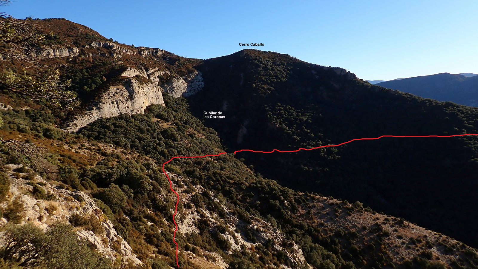 La vegetación se cierra más, convirtiéndose en un bosquete de carrasca y boj. Empieza a flanquear el Cerro Caballo por el oeste y desciende ligeramente para contornear bajo las murallas de un circo rocoso donde nace el río Venia (que más abajo se encajona para formar las Gorgas de San Julián). Este es un paraje recóndito, el Cubilar de las Coronas, y hay que vigilar de no perder la senda, siguiendo los hitos y retrocediendo cada vez que hay dudas.