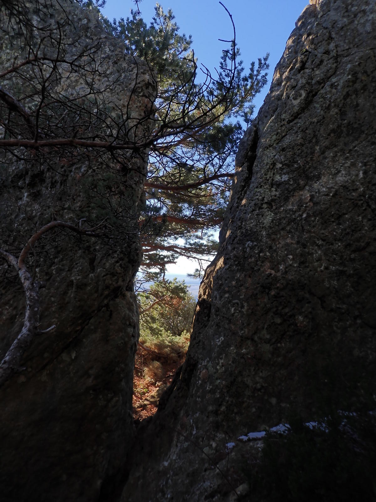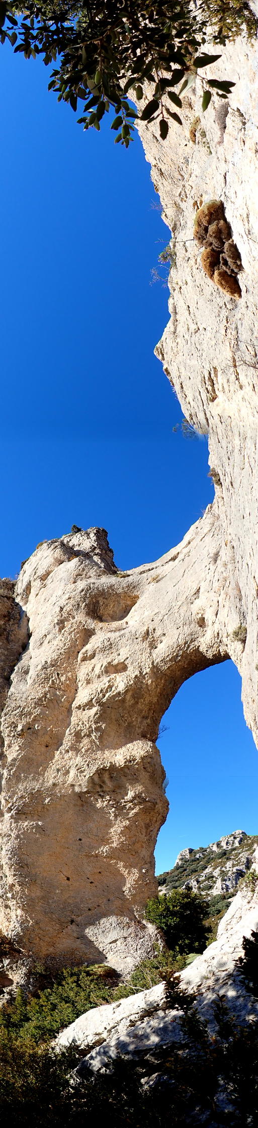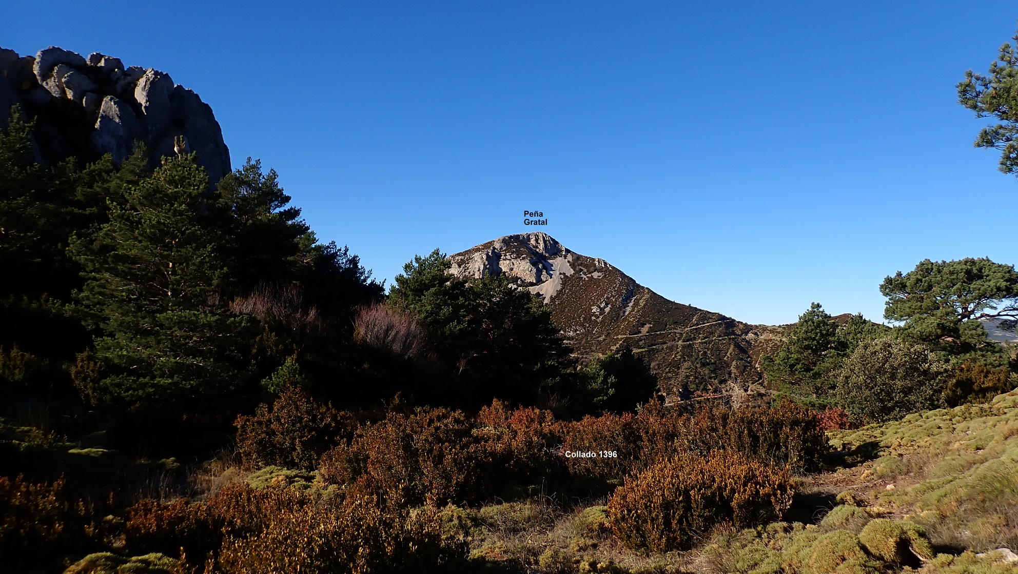 Haciendo todo el semicírculo atravieso un barranco seco (1270m 1h26′) y, tras una nueva subida, aparece de repente el Arco de Gratal (1320m 1h38′). Es impresionante y merece la pena hacer tranquilamente unas cuantas fotos. Se atraviesa el arco y se sigue subiendo hasta el collado norte de la Peña Mediodía (1396m 2h04′). Es una zona un poco más despejada, pero enseguida se continúa en dirección norte con vegetación más cerrada. Hay que atravesar por una grieta entre las rocas (1460m 2h12′). Se abandona el bosquete y se pasa a zona de erizones. Por fin llego a una zona amplia, llana y clara atravesada por un camino o pista (1520m 2h25′). Tomaré este camino hacia el este a la bajada.