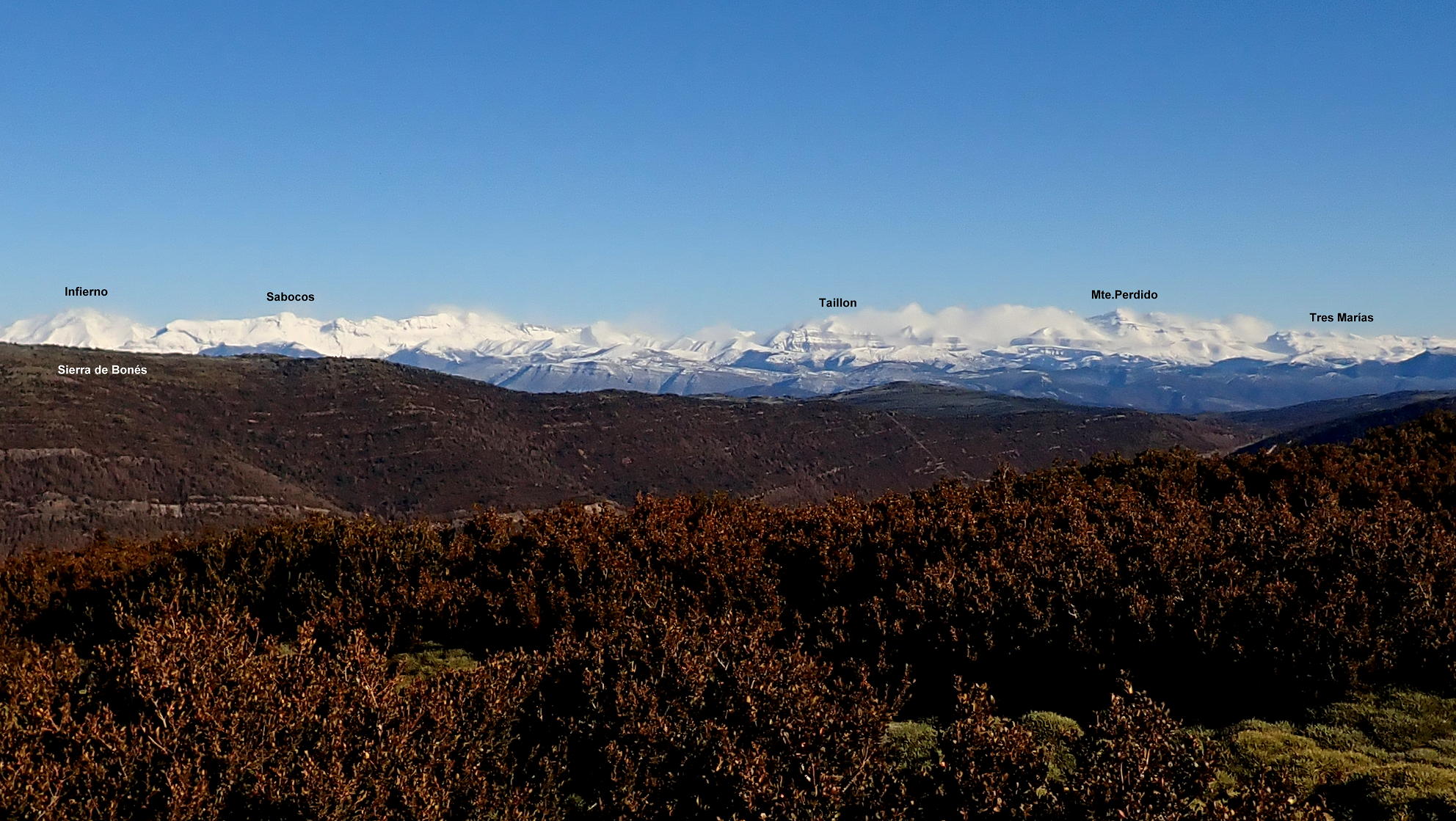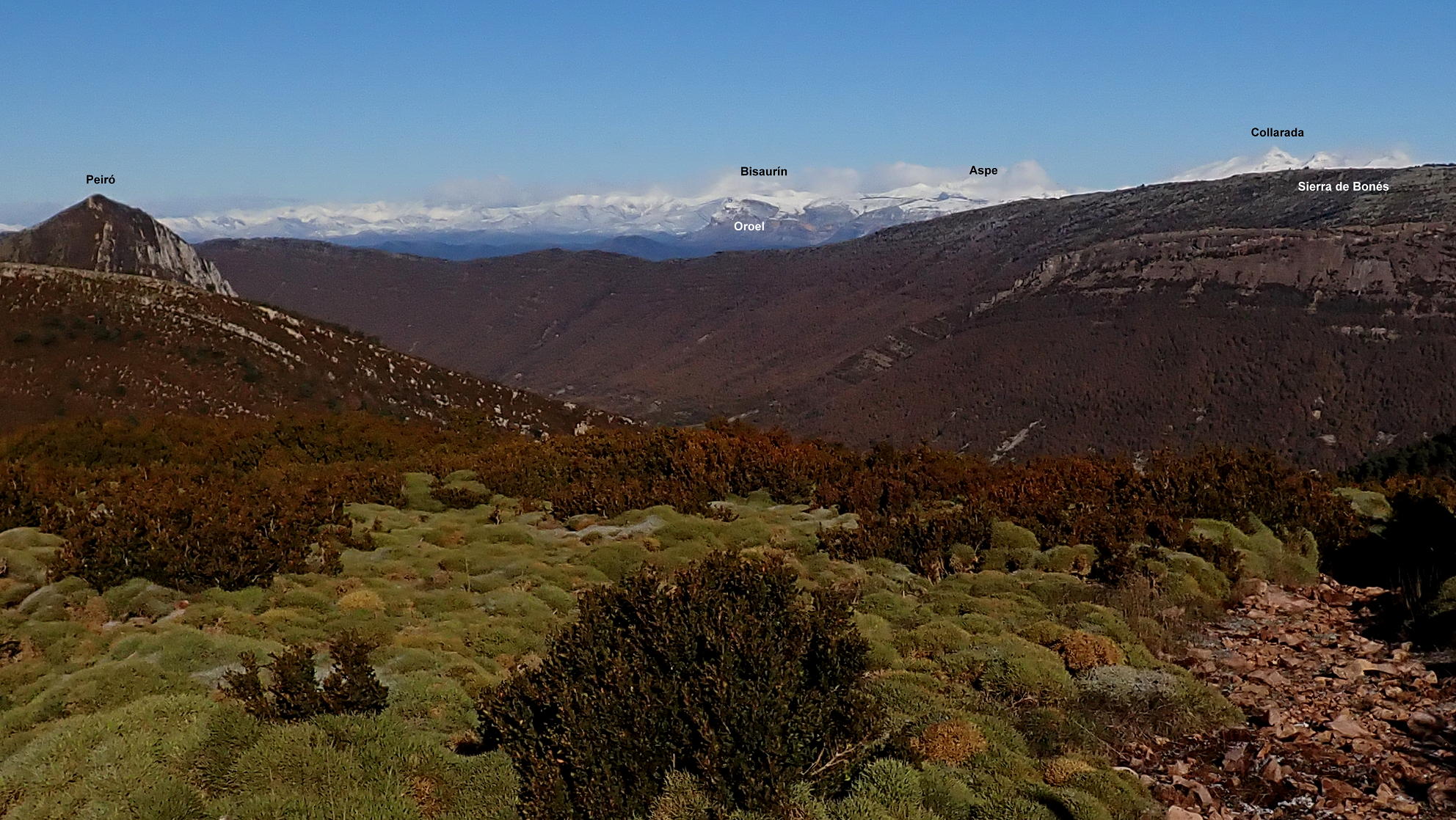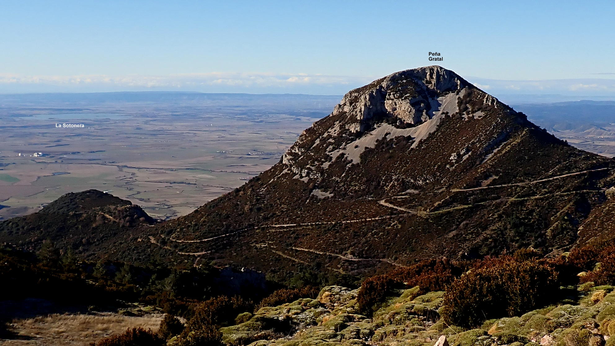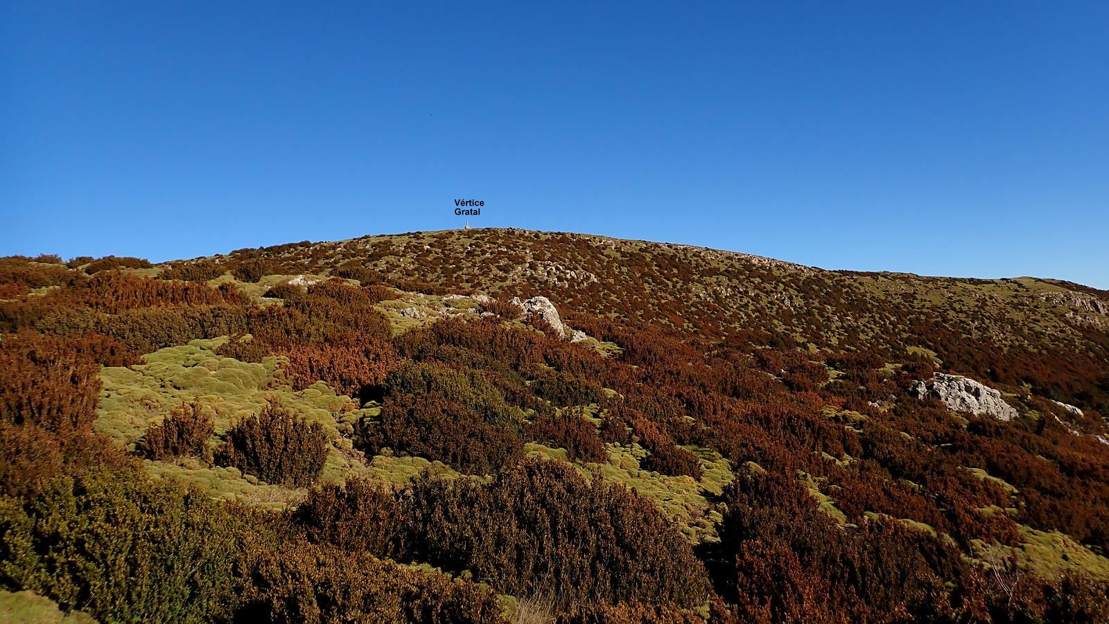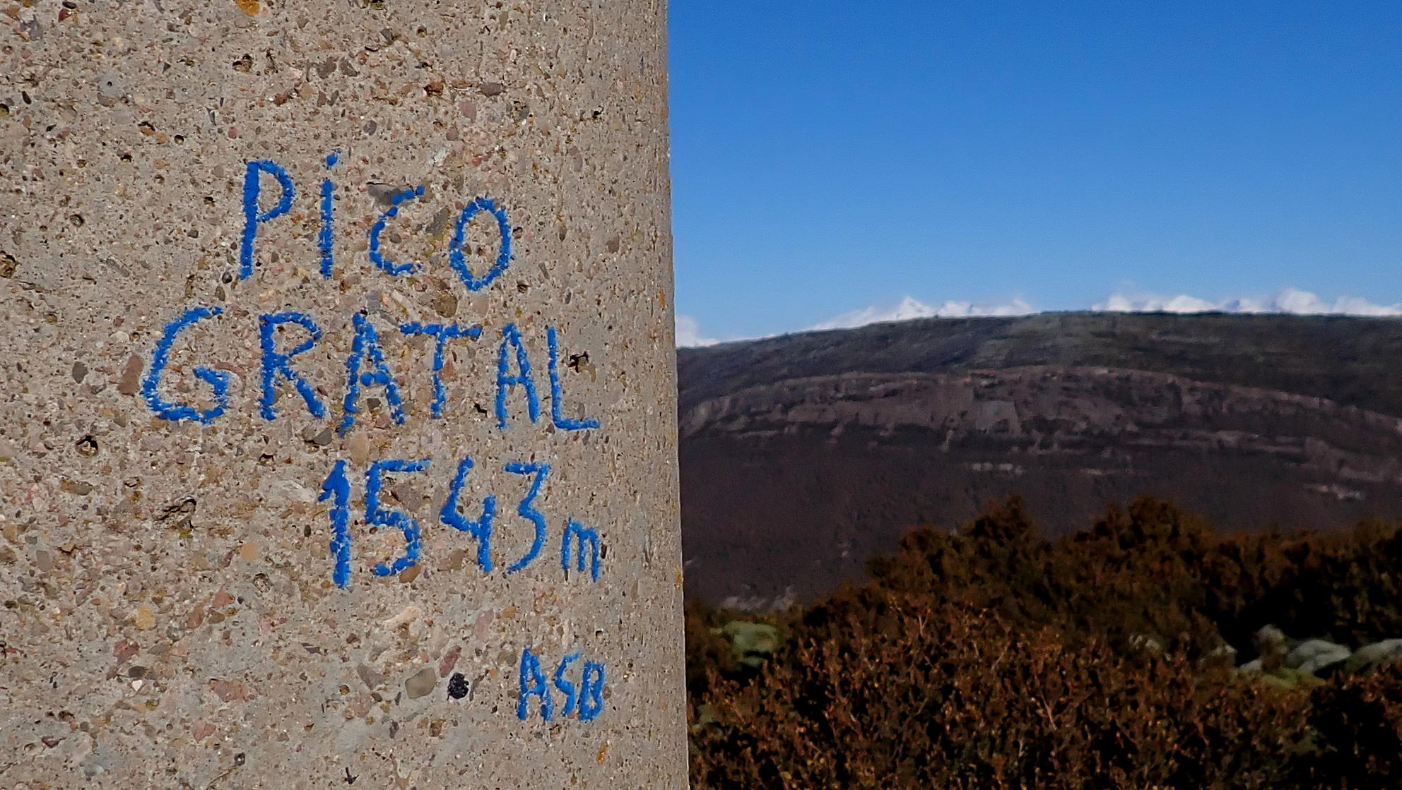 Ahora atravieso el camino y veo un poco más arriba un hito que me marca la ruta. Una difusa senda en la hierba se dirige a ese hito y se introduce otra vez entre erizones y boj para subir en breve al visible pico Gratal (1543m 2h28′) con su vértice geodésico (no confundir con la Peña Gratal). El Pirineo recién nevado, aunque algo tapado por la Sierra de Bonés, luce espectacular.