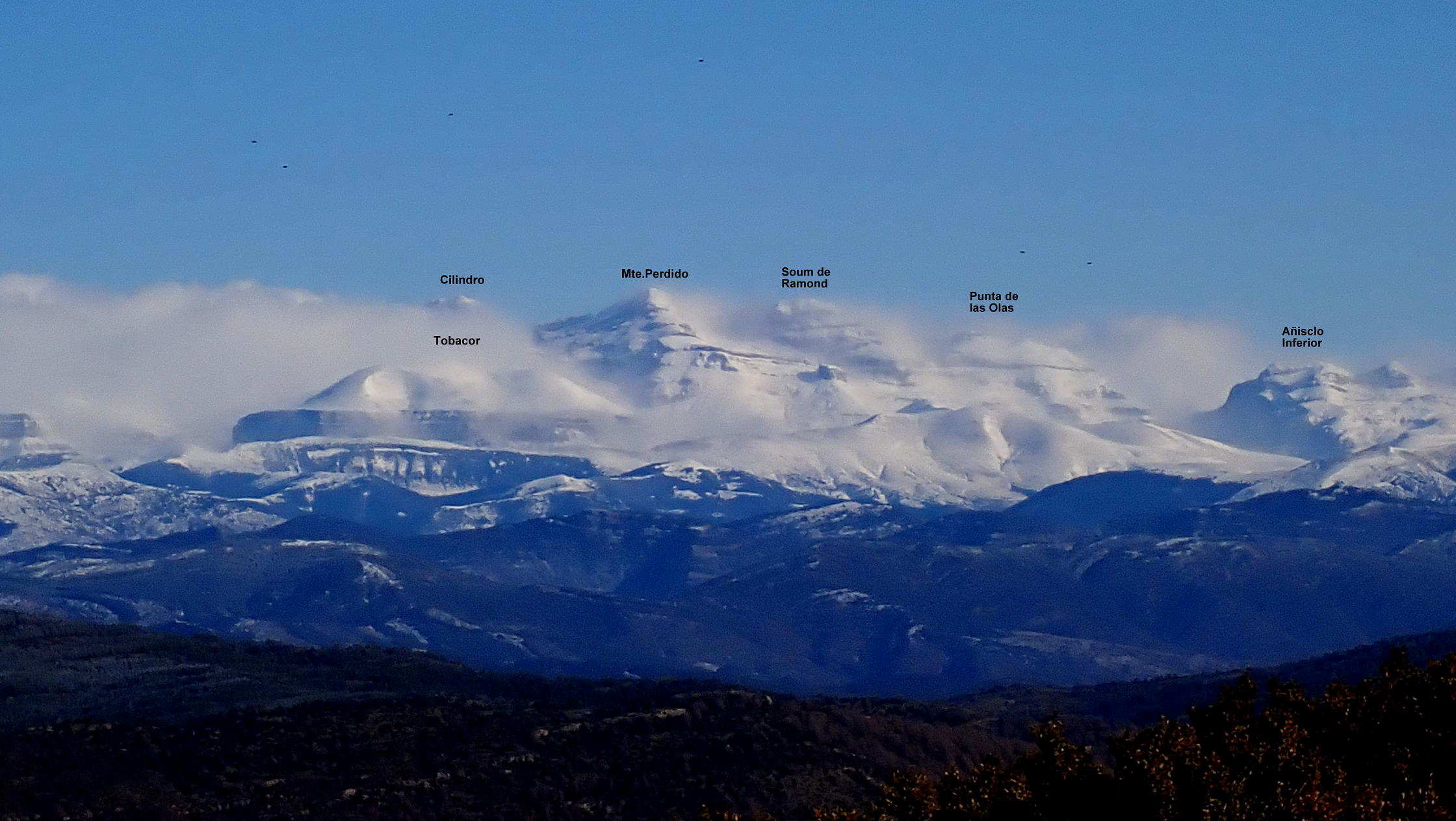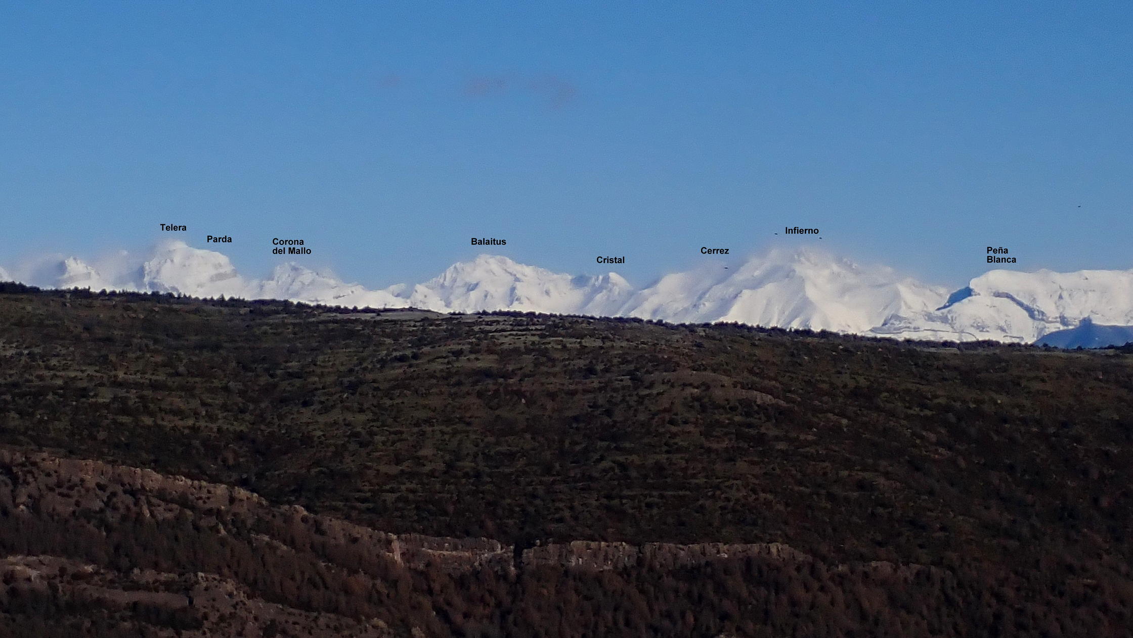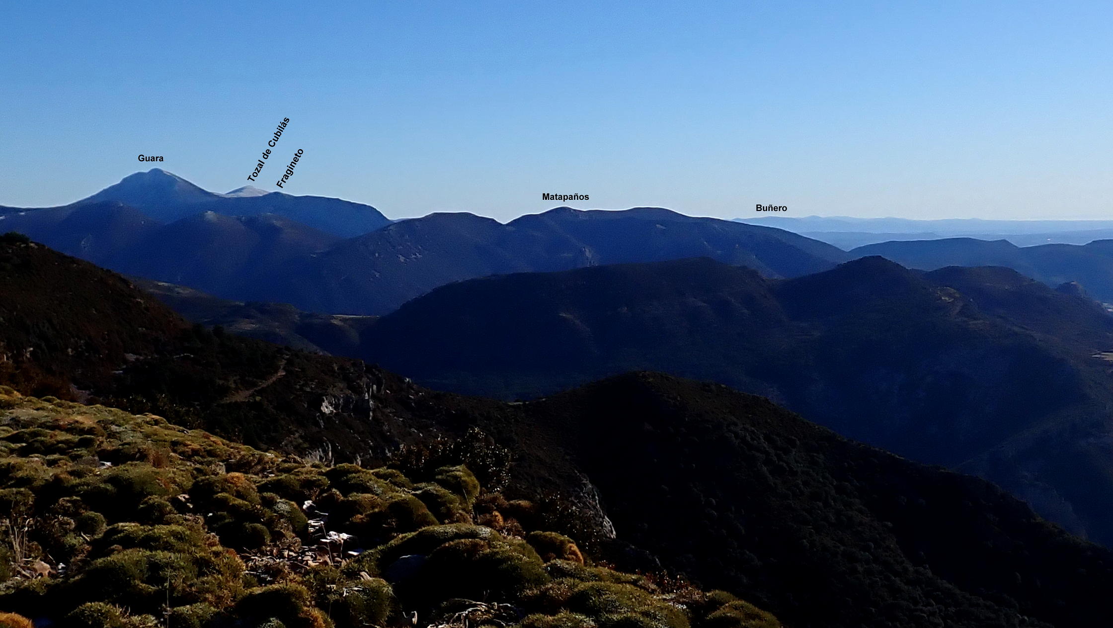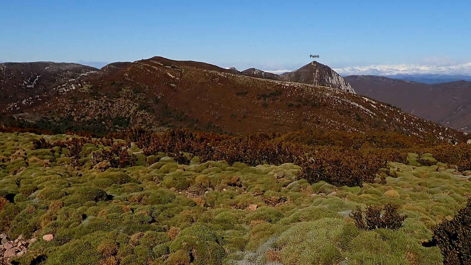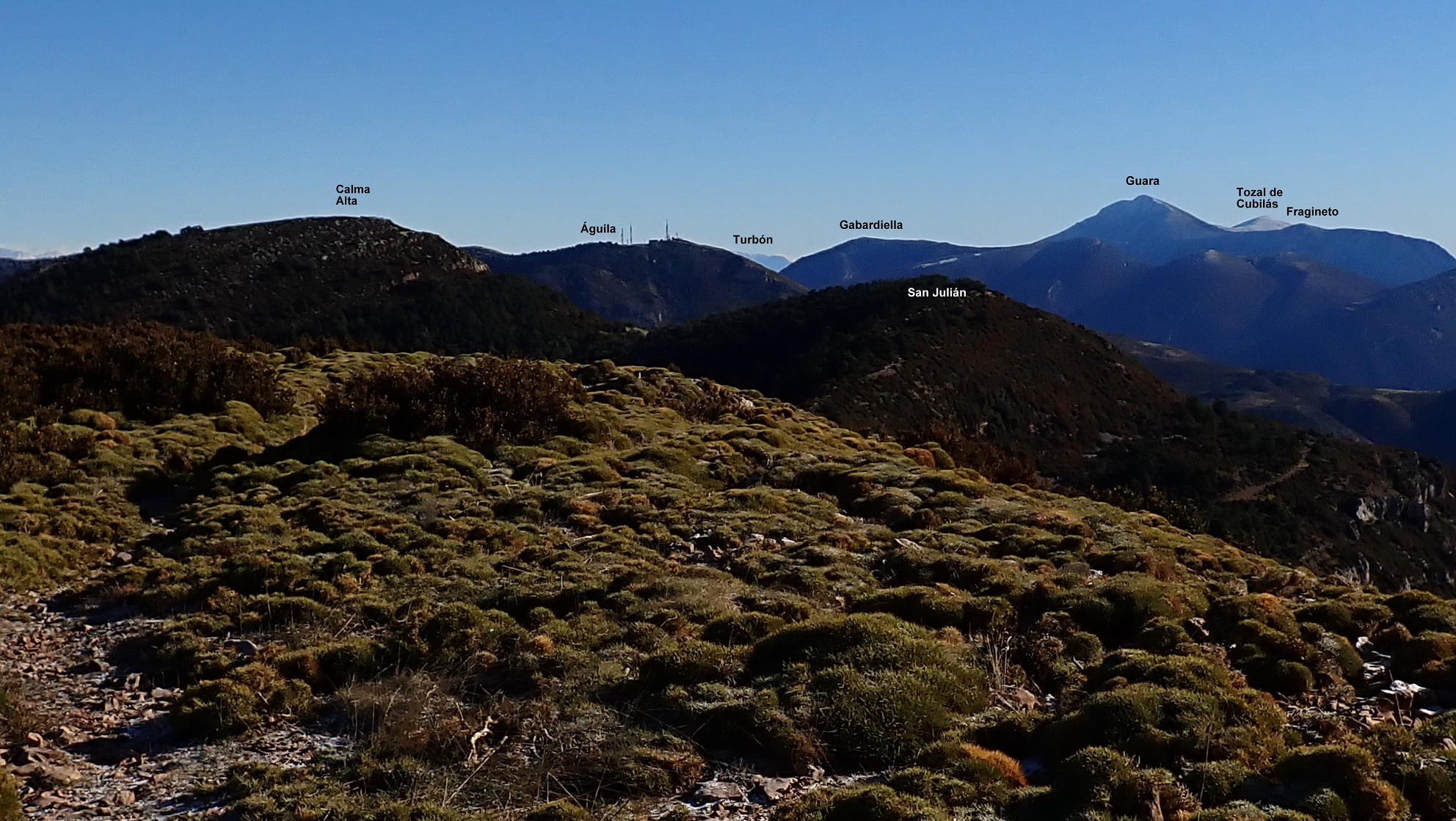 Ahora atravieso el camino y veo un poco más arriba un hito que me marca la ruta. Una difusa senda en la hierba se dirige a ese hito y se introduce otra vez entre erizones y boj para subir en breve al visible pico Gratal (1543m 2h28′) con su vértice geodésico (no confundir con la Peña Gratal). El Pirineo recién nevado, aunque algo tapado por la Sierra de Bonés, luce espectacular.