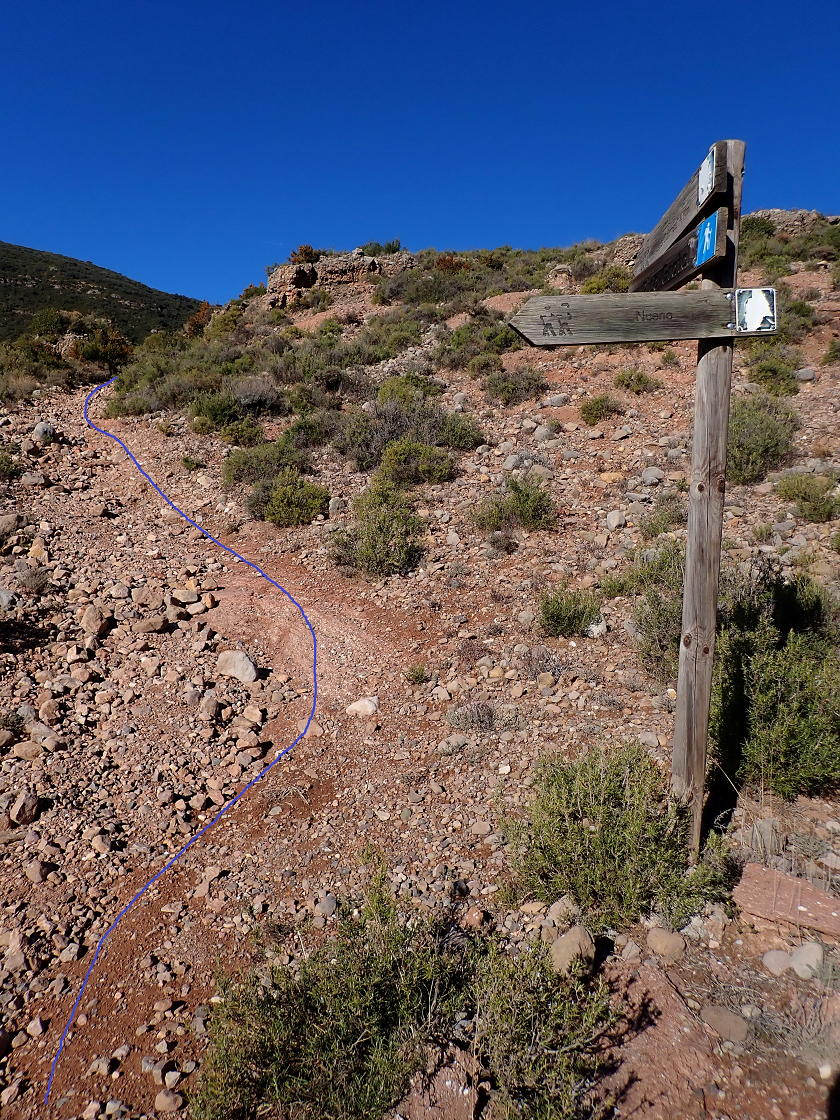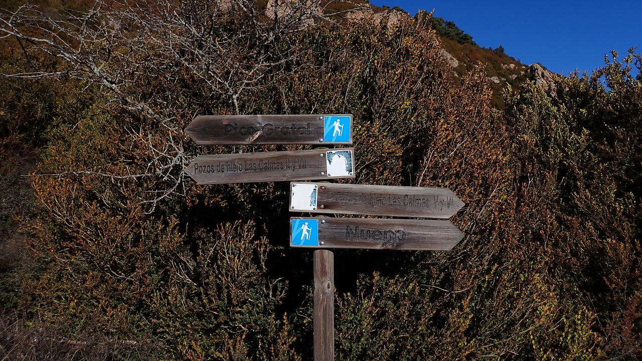 Descripción de la ruta: Nueno (770m). Salen dos caminos, hacia el norte y hacia el NW. Tomo el camino NW, hacia un depósito de agua (bajaré por el camino que viene del norte). Paso junto al depósito por la izquierda y una senda se introduce por la vegetación de la ladera, pasa bajo la línea eléctrica y va adquiriendo fuerte pendiente, con algunos resaltes rocosos que hay que superar. Va avanzando por el lomo de Las Coronas en dirección norte. Tras llegar a un hombro algo más llano encuentro las paredes en ruinas (1110m 0h30′) de alguna antigua caseta.