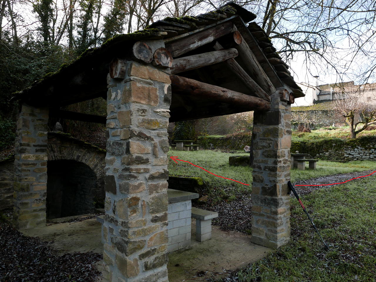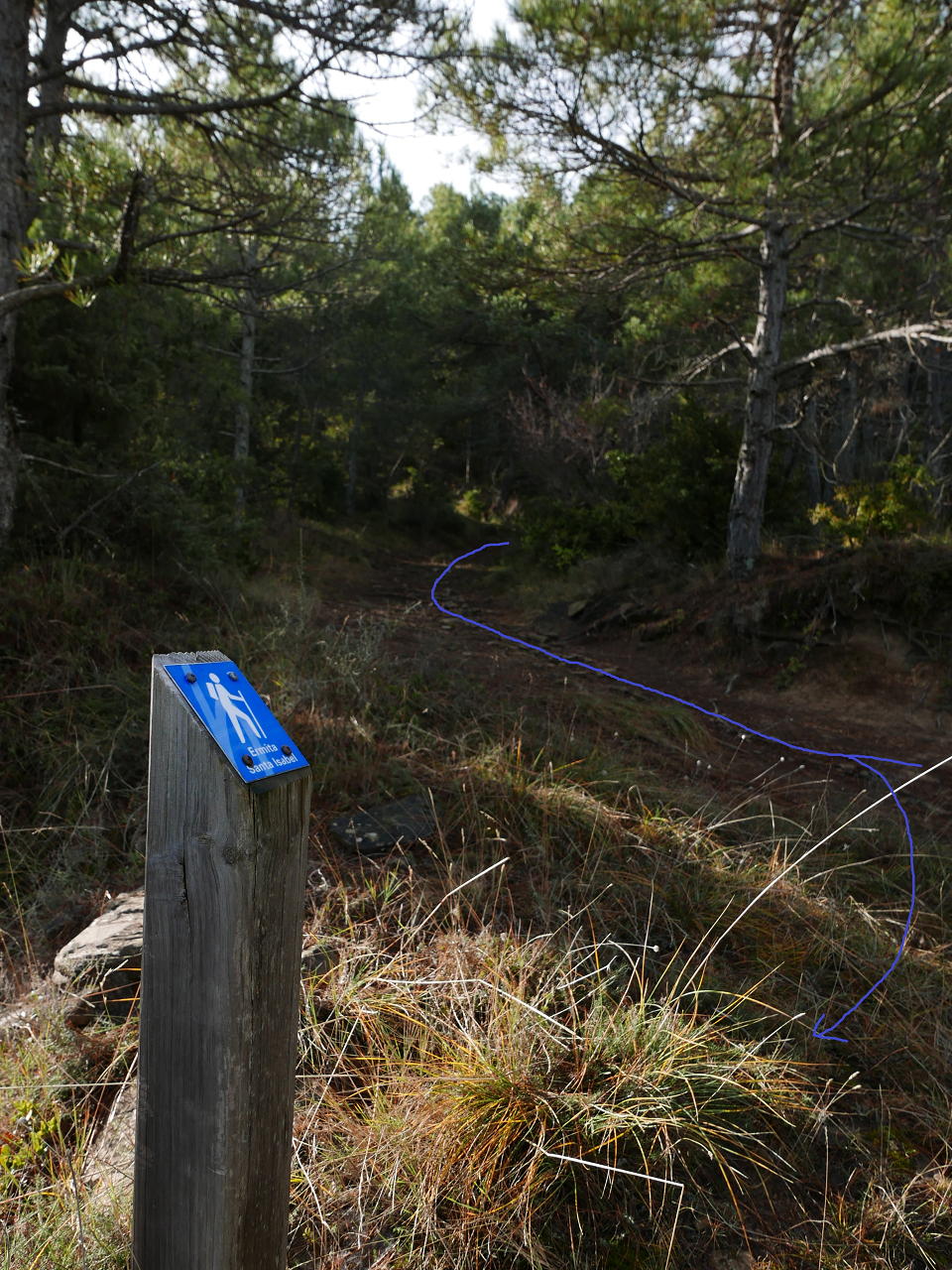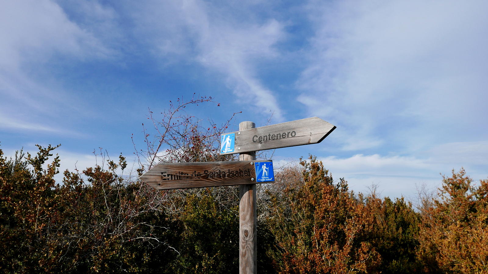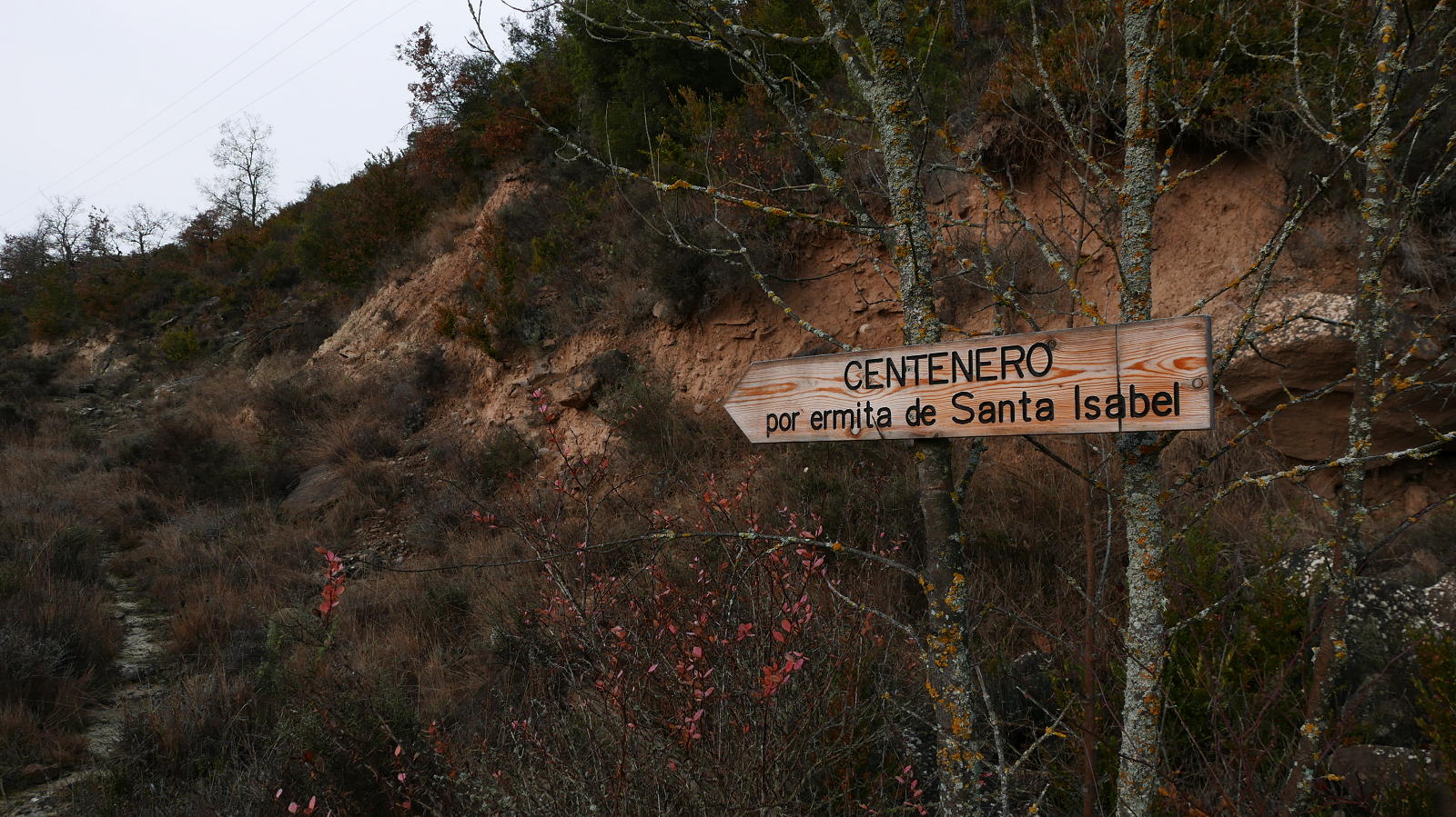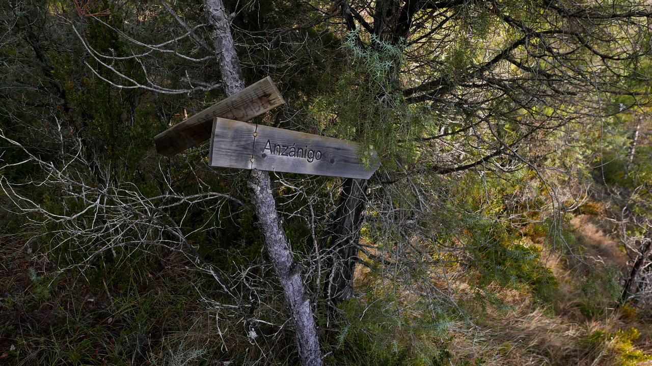 Descripción de la ruta: Frente al puente que da acceso a Anzánigo, unos metros al norte, un cartel indica «Ermita V. de Izarbe/PR-HU-65» (572m), rodeando una casona abandonada. Tras la casona hay una flecha azul en una piedra en el suelo; el PR sale hacia la derecha (por donde volveré), mi ruta hacia la izquierda (cartel de madera «Centenero por ermita de Santa Isabel»). El camino (SW), algo confuso los primeros metros, supera unos escalones de roca y encuentro hitos y marcas de pintura amarilla. Se introduce en el pinar, gira al NW y asciende con pendiente muy suave.