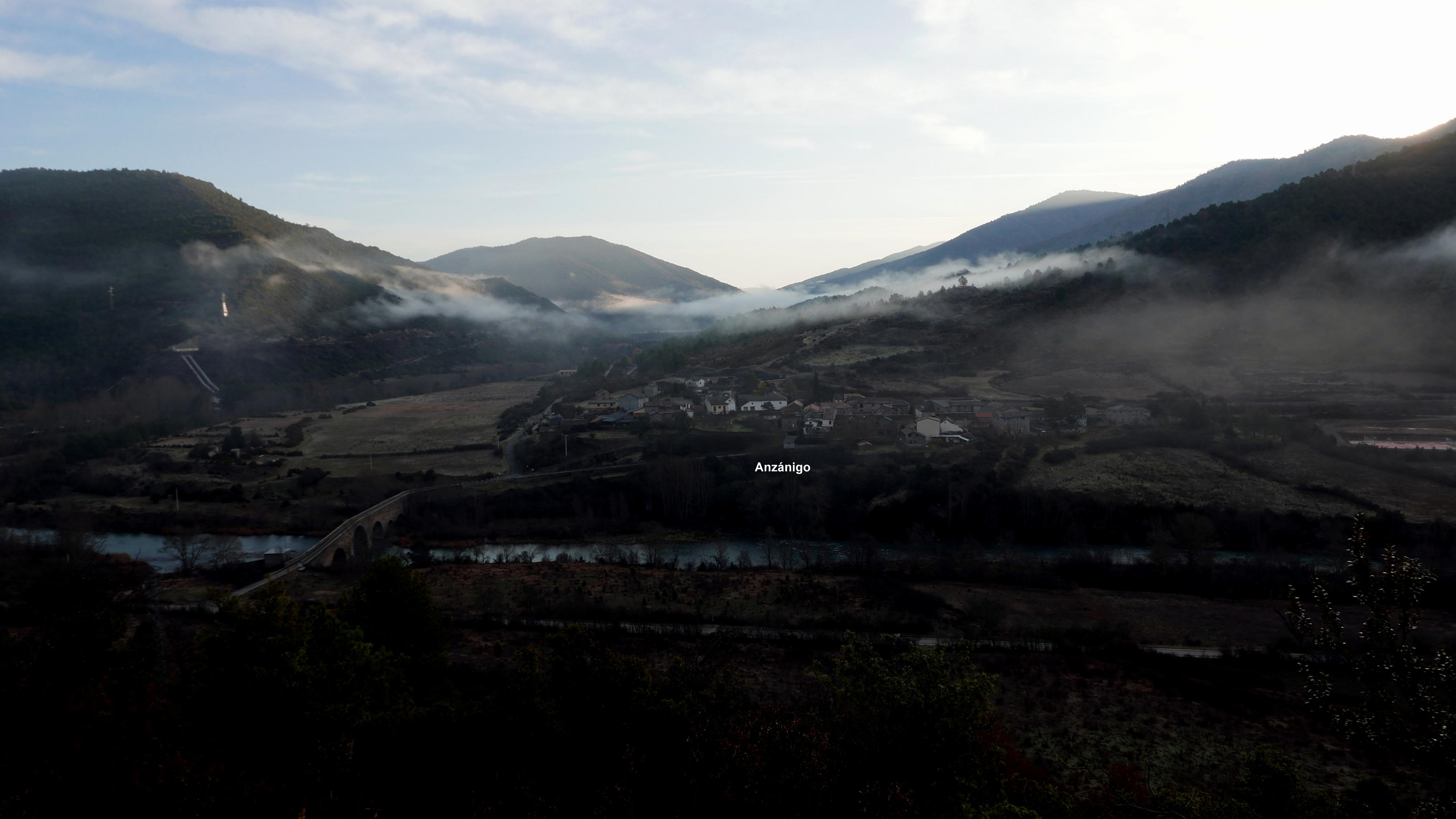 Acceso: A Anzánigo se puede llegar desde Huesca por la carretera A-132 hasta el embalse de la Peña (KM 46) y luego la A-1205 hasta el KM 30. O bien por la autovía A-23 y la N-330 hasta Hostal de Ipiés donde se toma la HU-V-3003 que desemboca en la A-1205. Anzánigo queda en la orilla izquierda del Gállego (habría que pasar el río por un puente) pero yo aparco en la orilla derecha, sin pasar el puente, en una explanada frente a una gran casa abandonada, 90m al norte del puente.