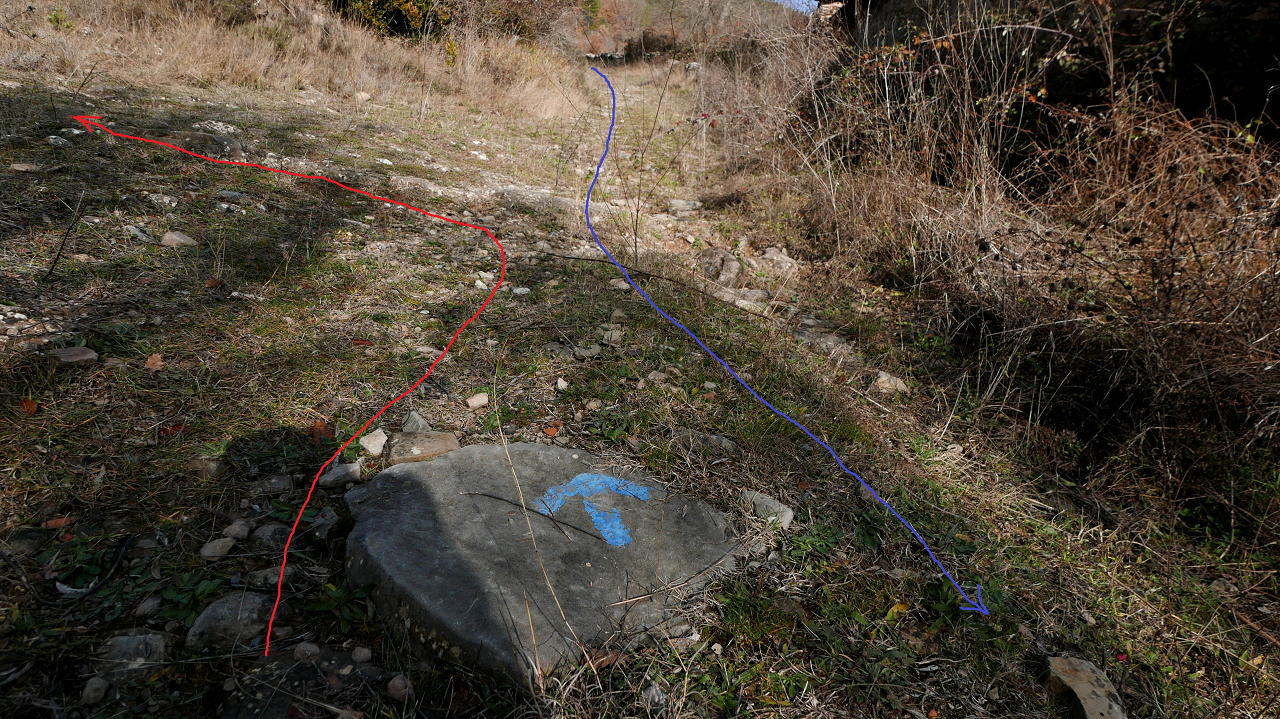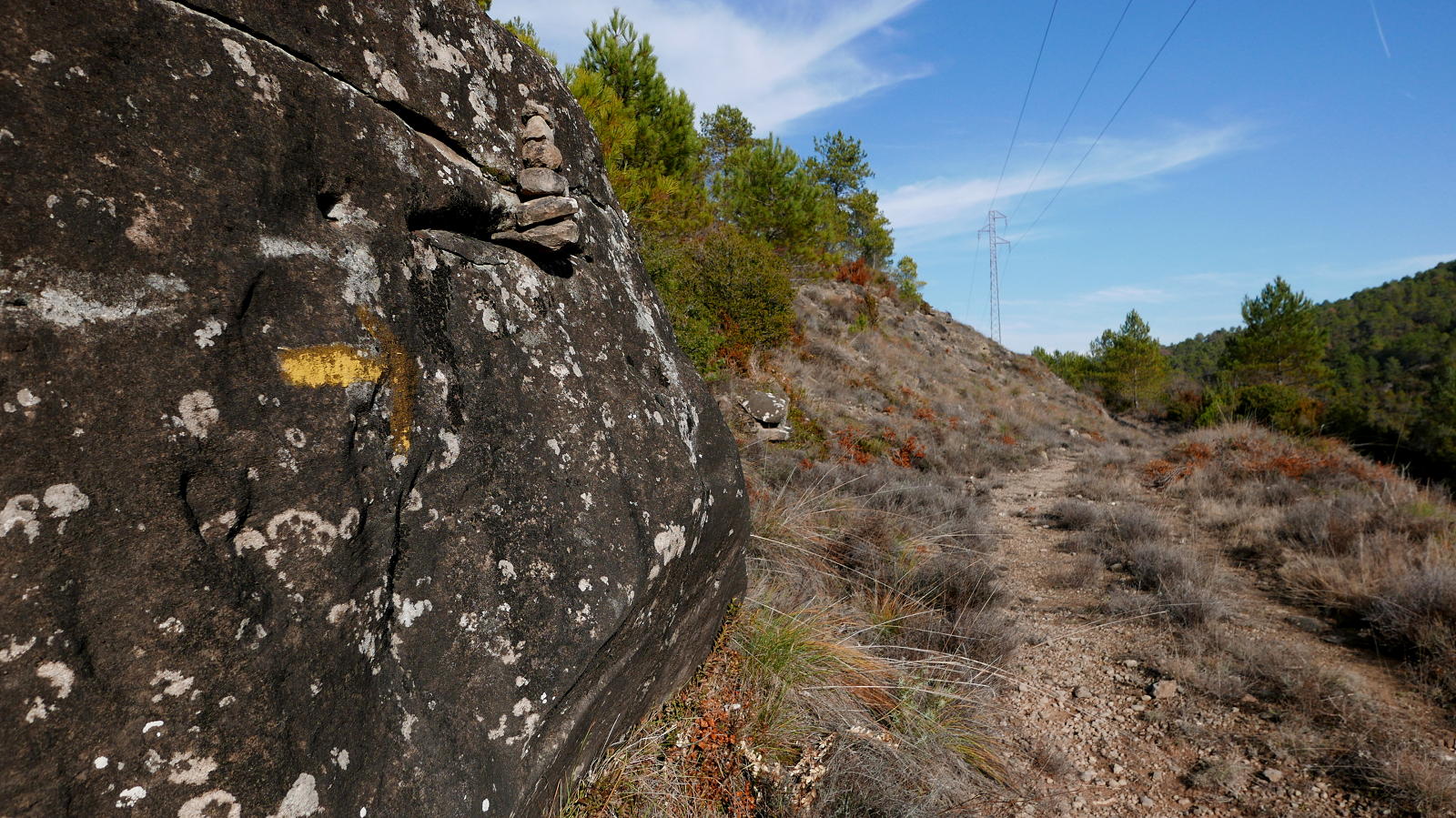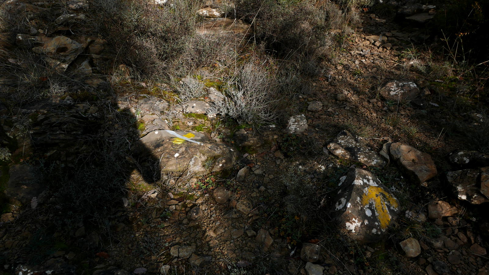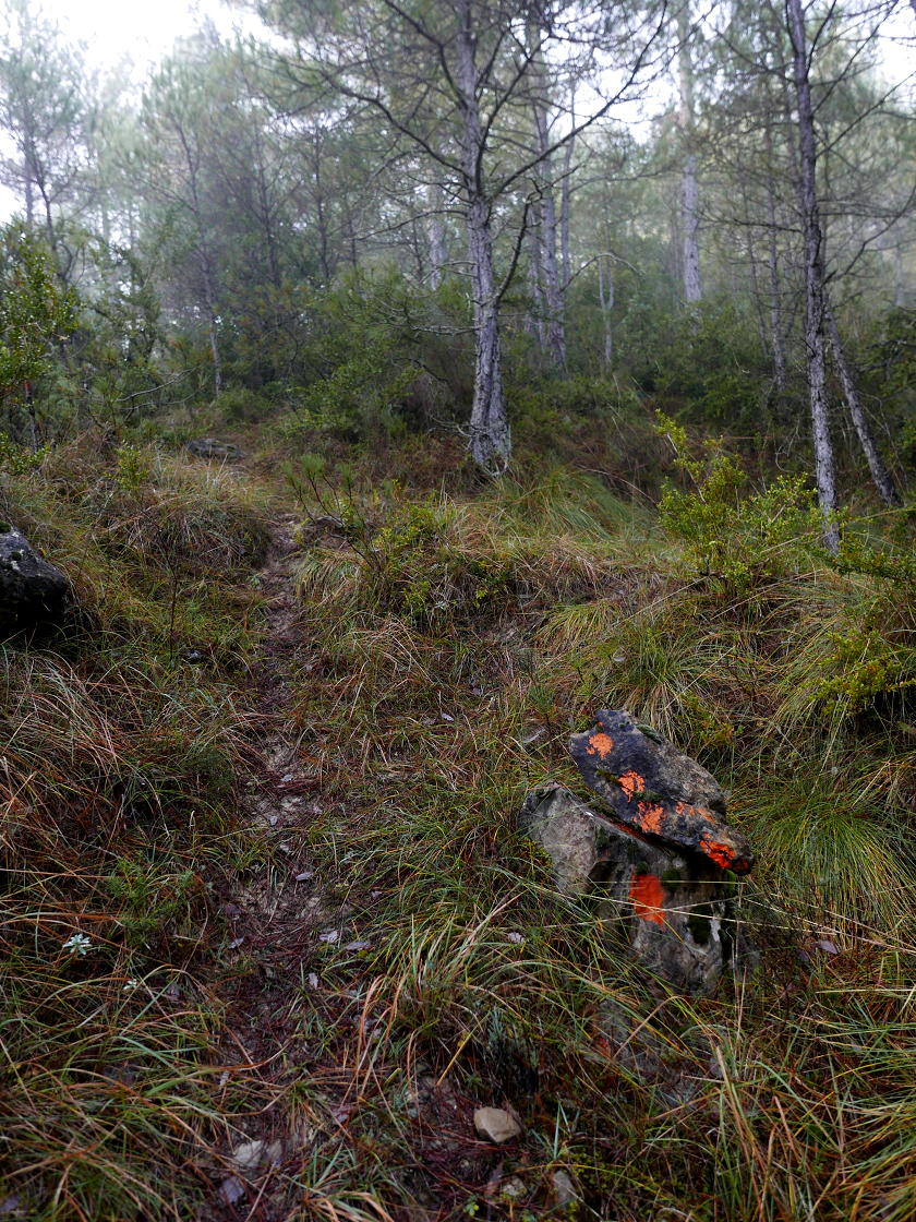 Tras un giro a izquierda (SW) superando la cabecera de un barranco, vuelve a girar a derecha (NW) y adquiere pendiente más fuerte. Entre la vegetación hay algún punto en donde no se ve bien la traza de la senda, es cuestión de retroceder unos metros y recuperarla, siempre buscando los hitos. Más arriba también hay marcas de pintura naranja.