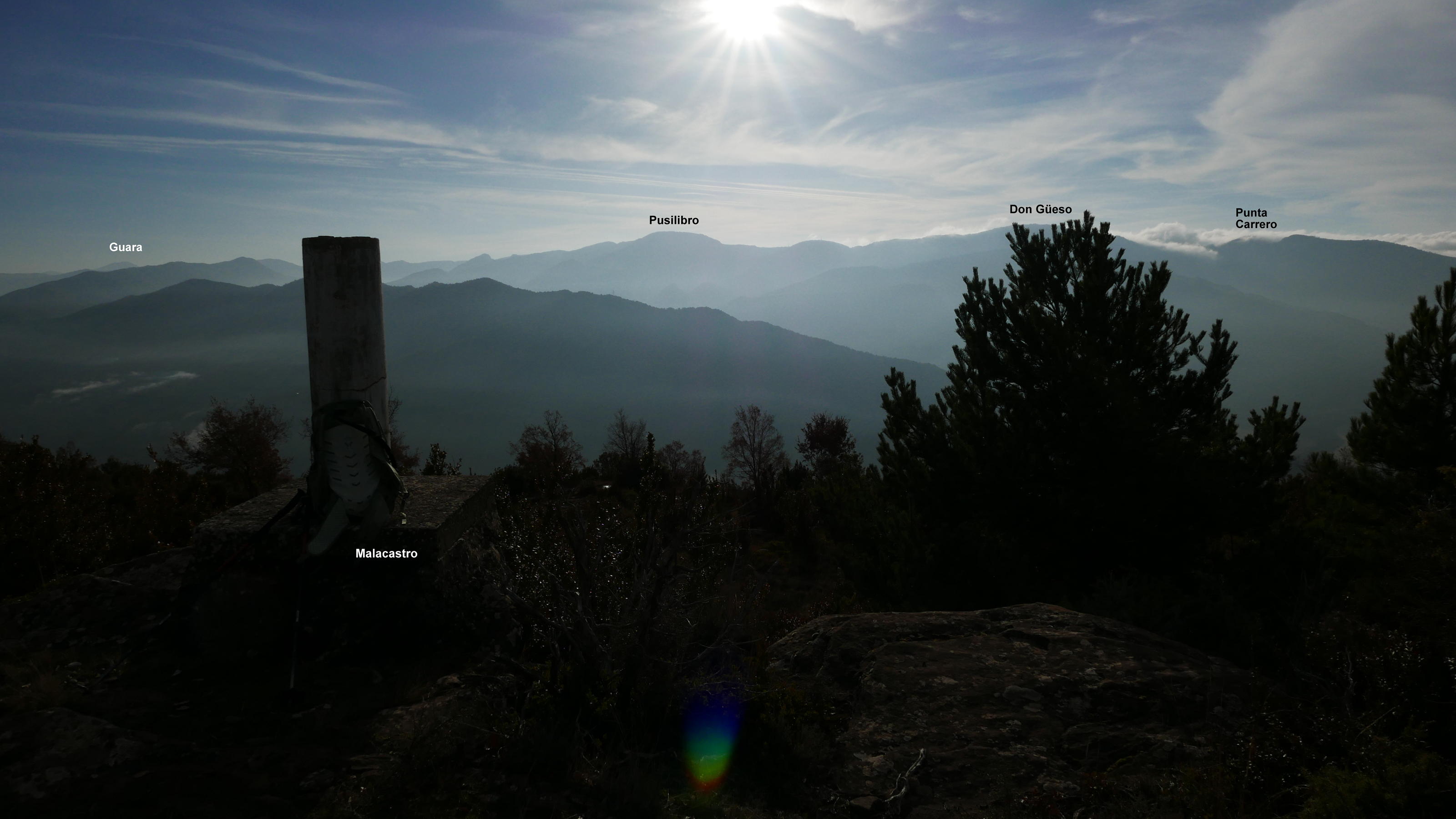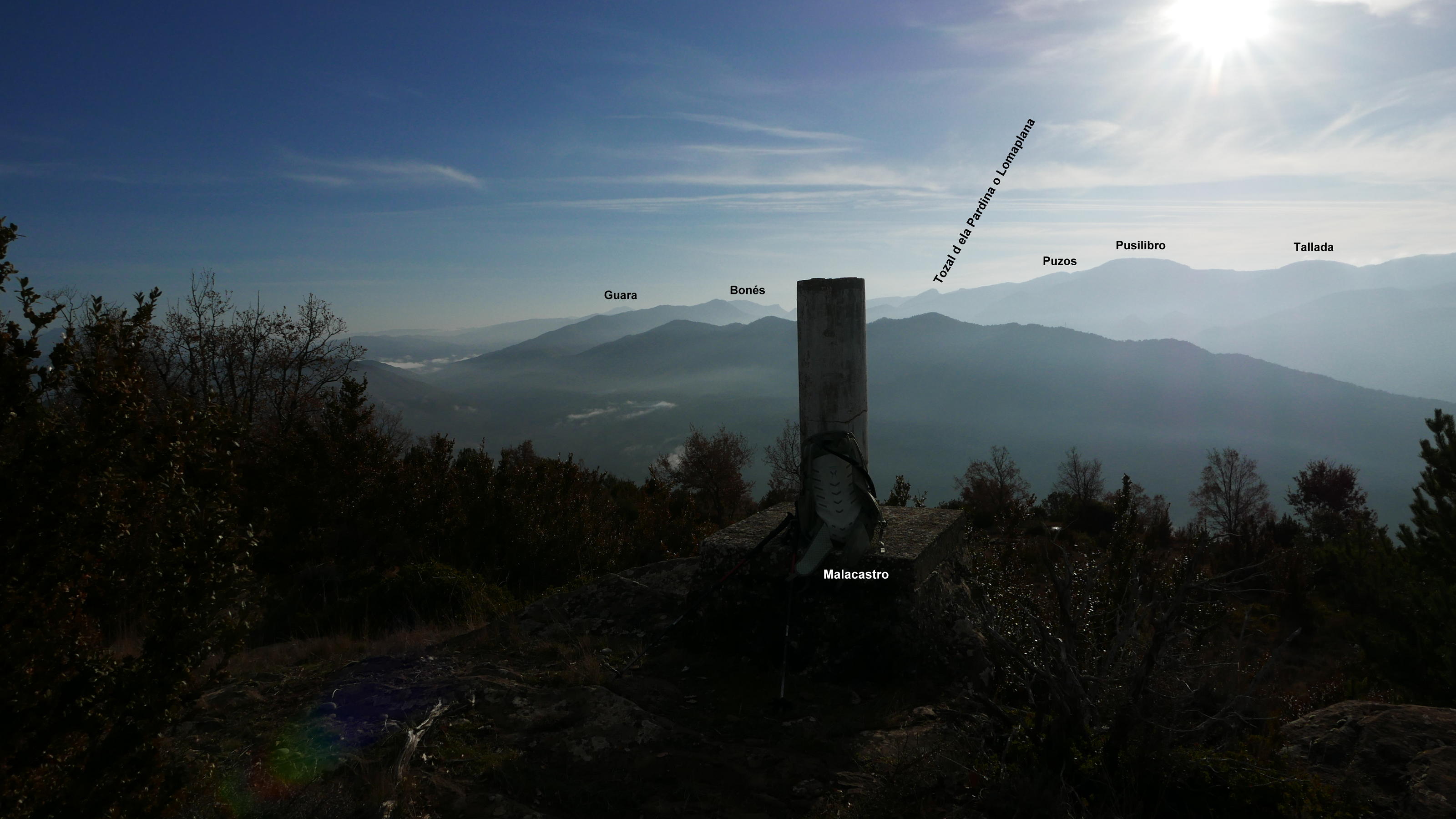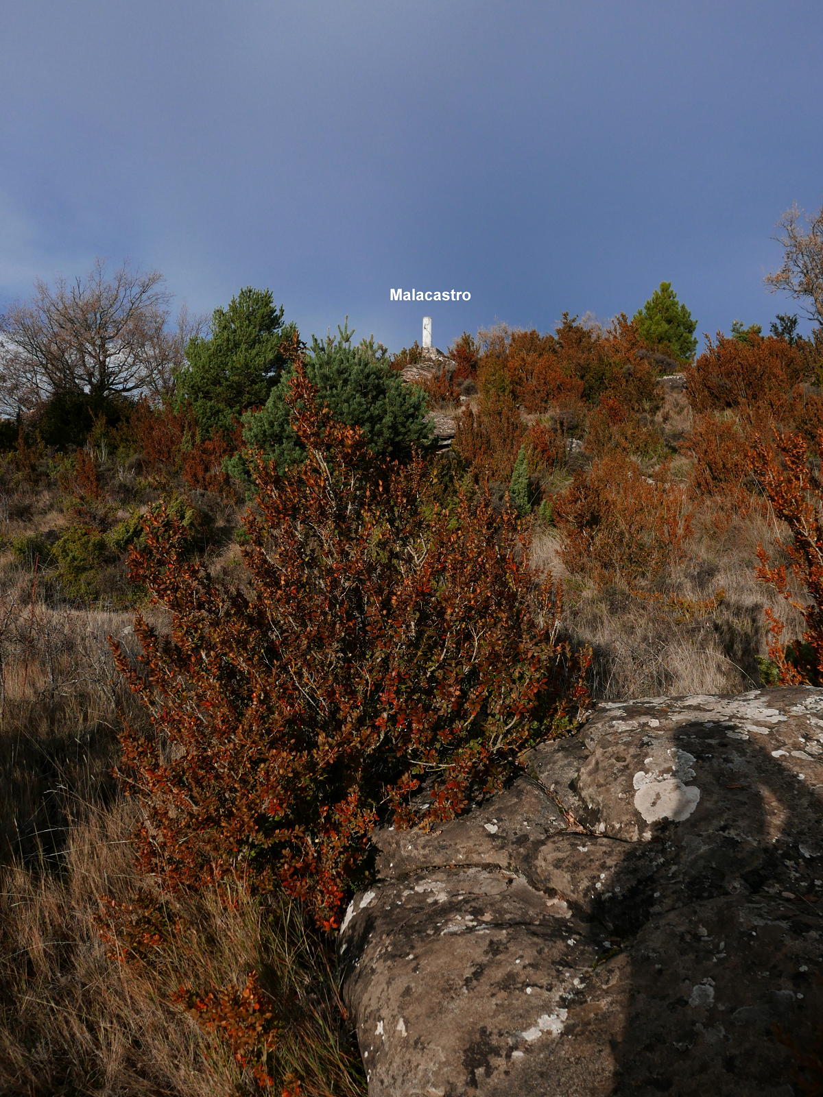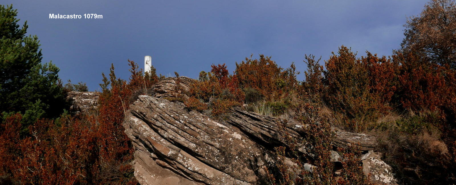Se vuelve a girar a la izquierda y llanear (975m 1h04′), avanzando por una zona un poco más abierta. Un último giro a la derecha (1035m 1h14′) encara la subida final al vértice geodésico del pico Malacastro (1076m 1h21′), rodeado de matorral de boj que impide una vista clara de la panorámica hacia el norte, hacia el Pirineo.