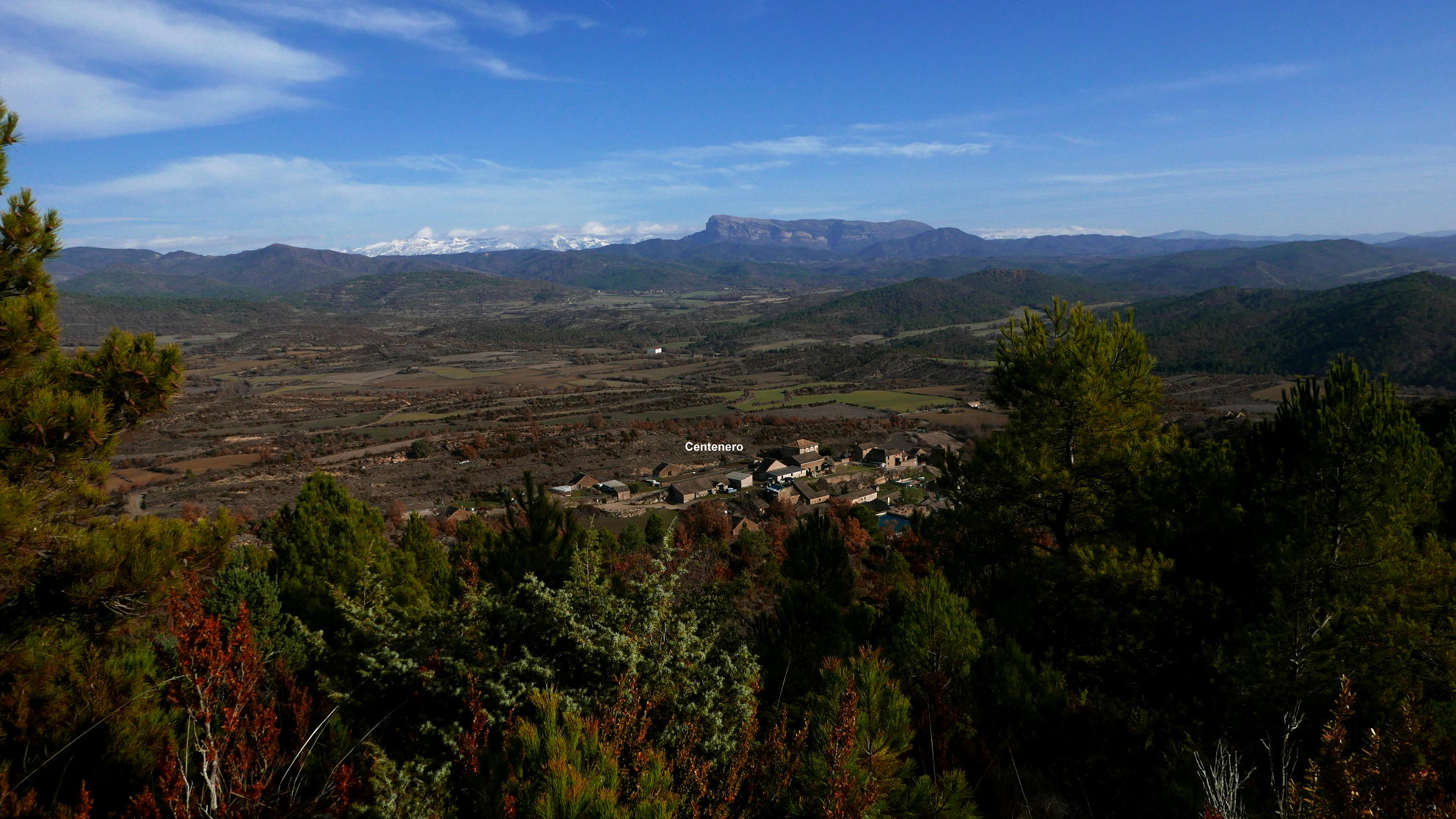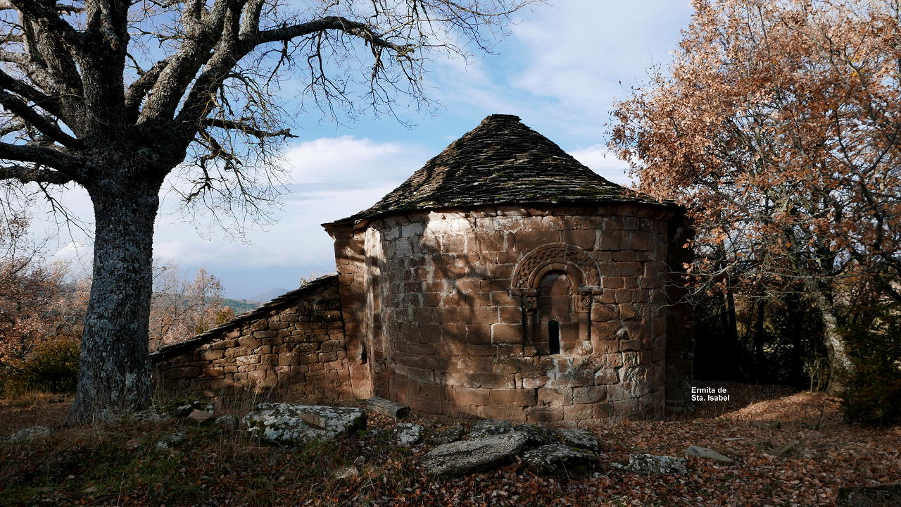 Desde el vértice salgo hacia el este, sin senda, y giro a la izquierda (NNW) encontrando una tenue traza que desemboca en un camino bueno (1055m 1h34′) que va a parar a una pista (1025m 1h37′); la sigo hacia la derecha. Me desvío de la pista para visitar la ermita de Santa Isabel (1032m 1h40′), ermita románica situada en un bonito quejigal. De la ermita se sale a una gran explanada de prados con viejas cabañas de pastores, con buenas vistas del Pirineo, retomando la pista cuando se bifurca (cartel de madera indica «Centenero» a la derecha 1018m 1h51′). Se atraviesa la zona llana, termina la pista y continúa un sendero (1015m 1h56′) que desciende por pinar.